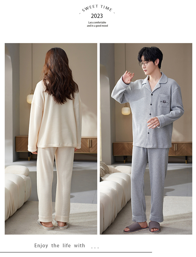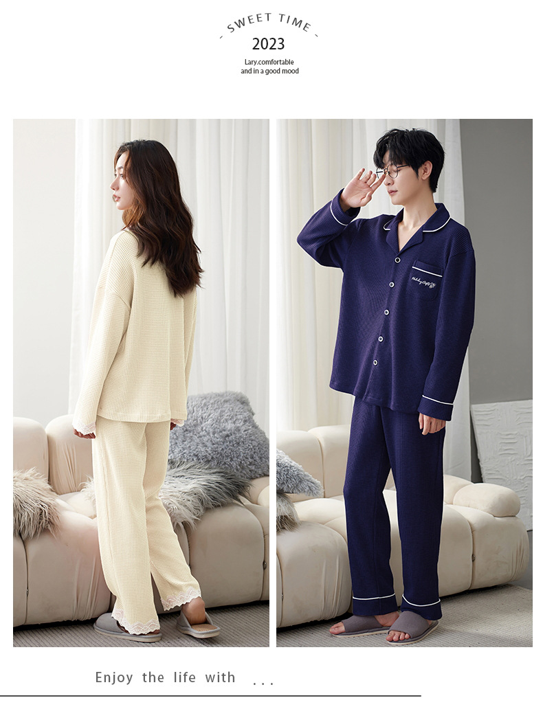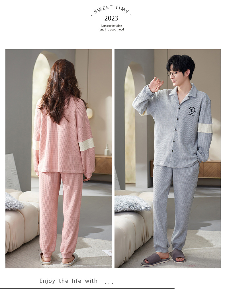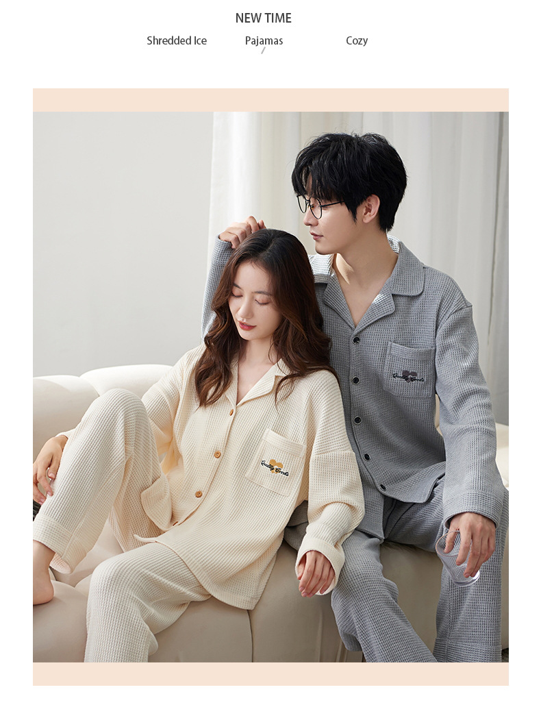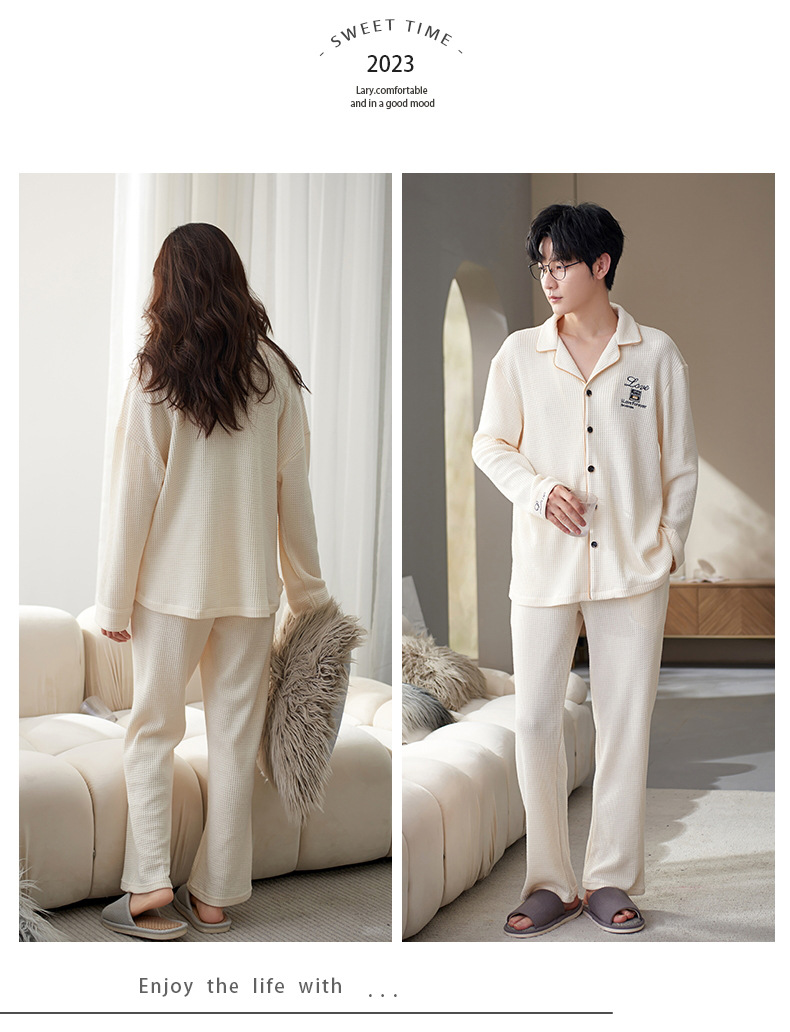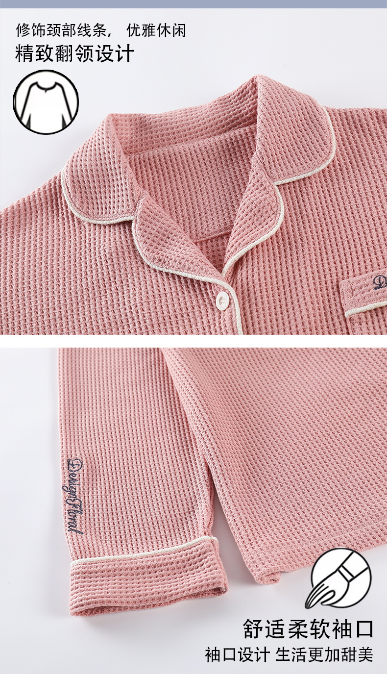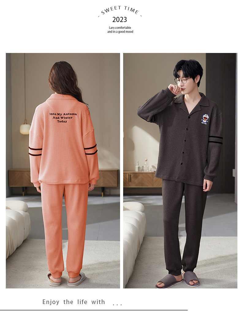 【韩式情侣款 卡通可爱超舒适!】秋冬季情侣睡衣开衫华夫格透气纯棉长袖休闲家居服男士女士春秋季