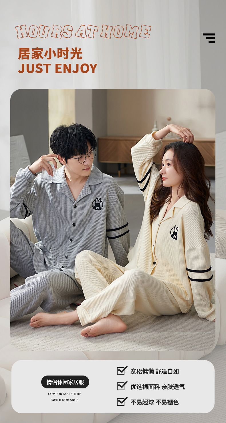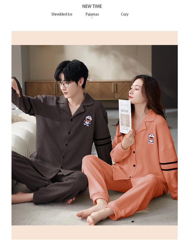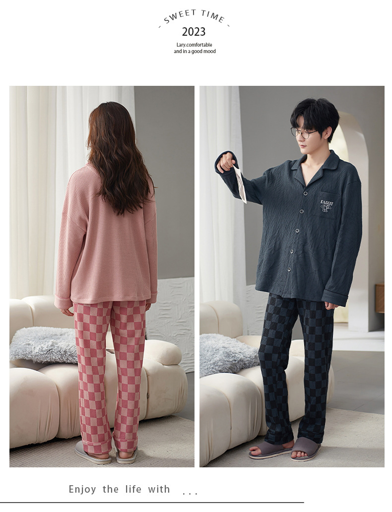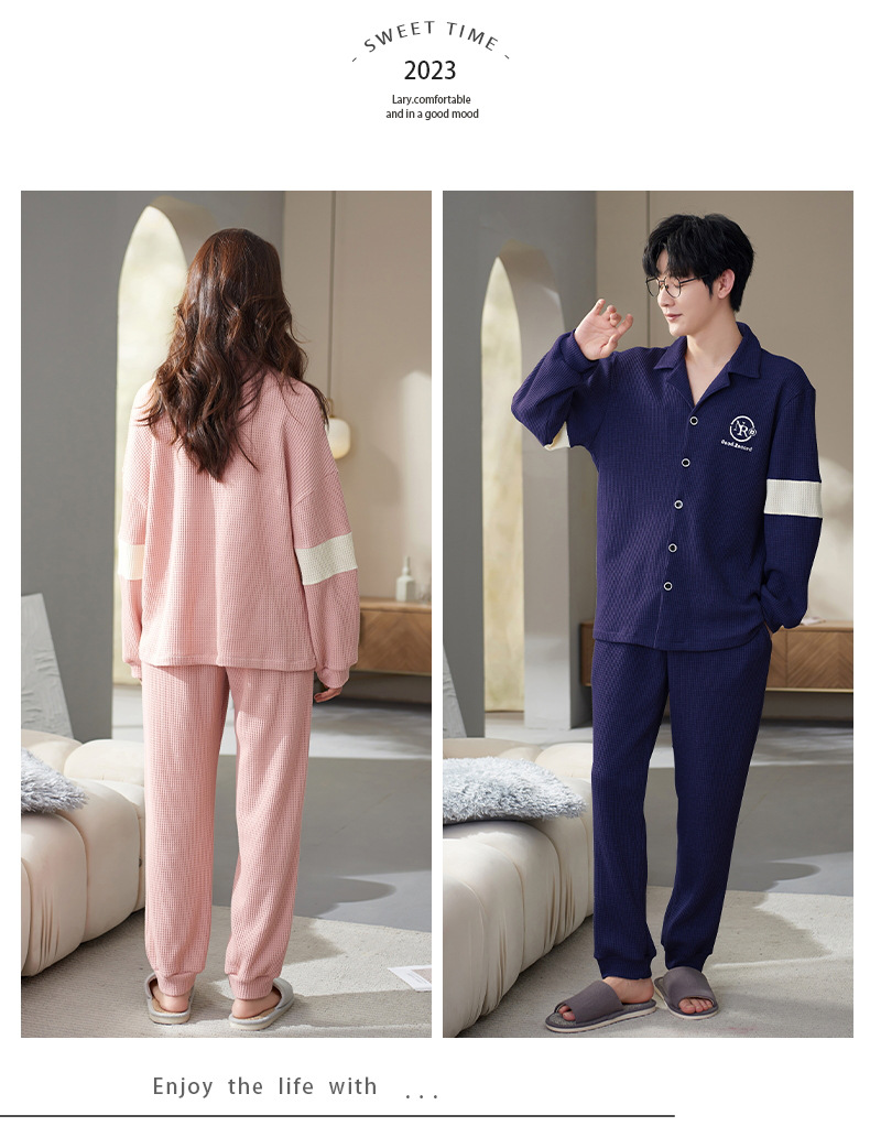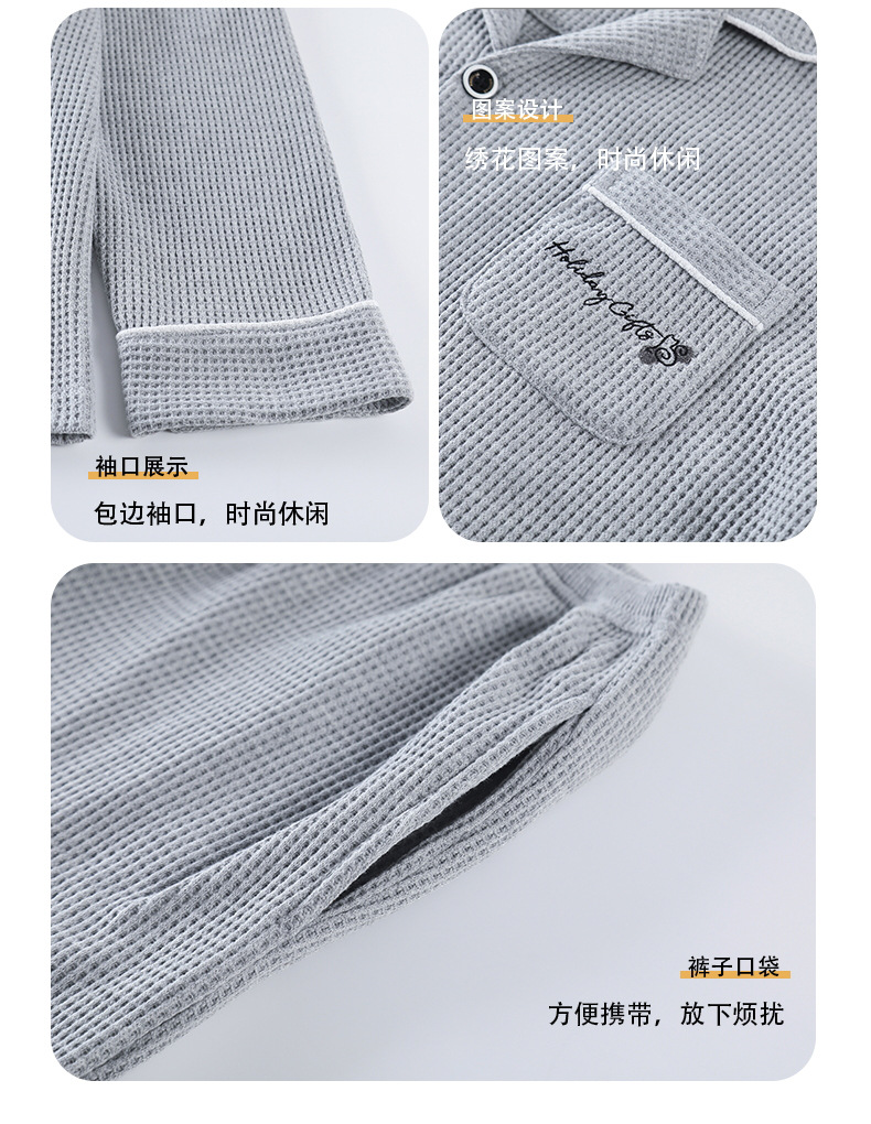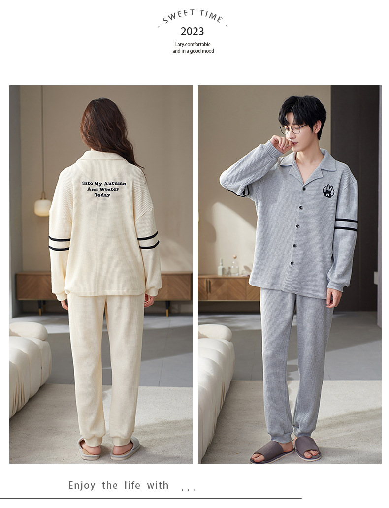 【韩式情侣款 卡通可爱超舒适!】秋冬季情侣睡衣开衫华夫格透气纯棉长袖休闲家居服男士女士春秋季