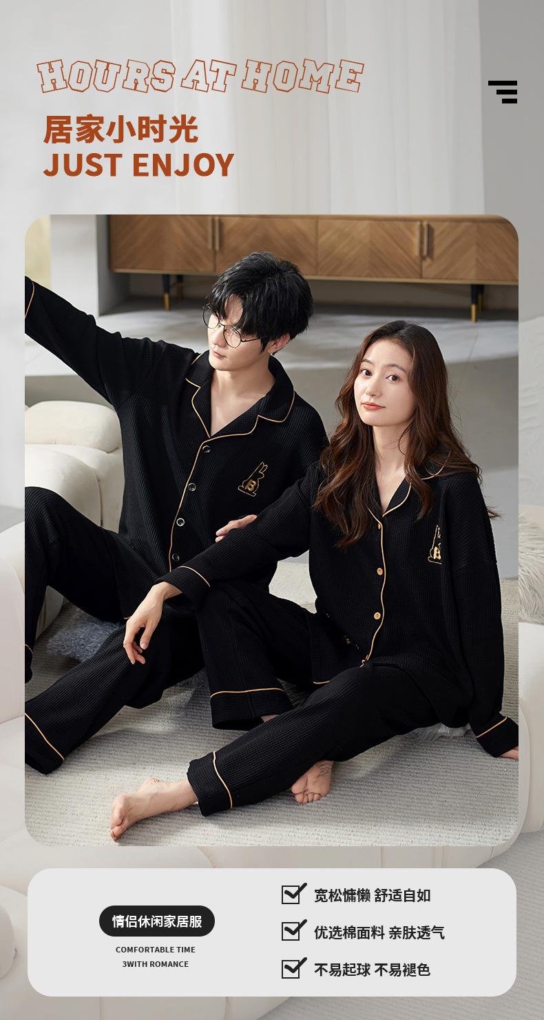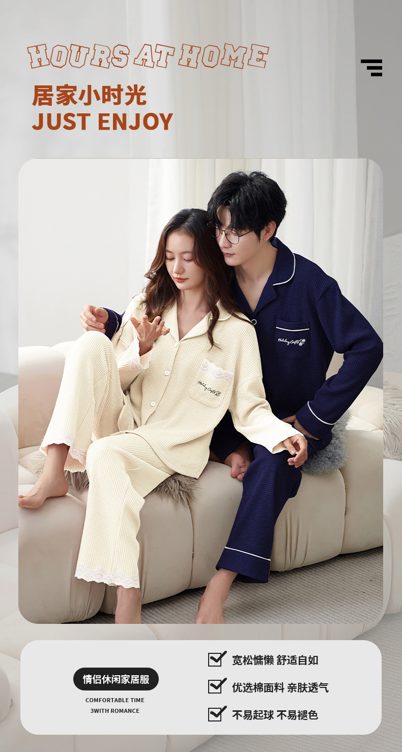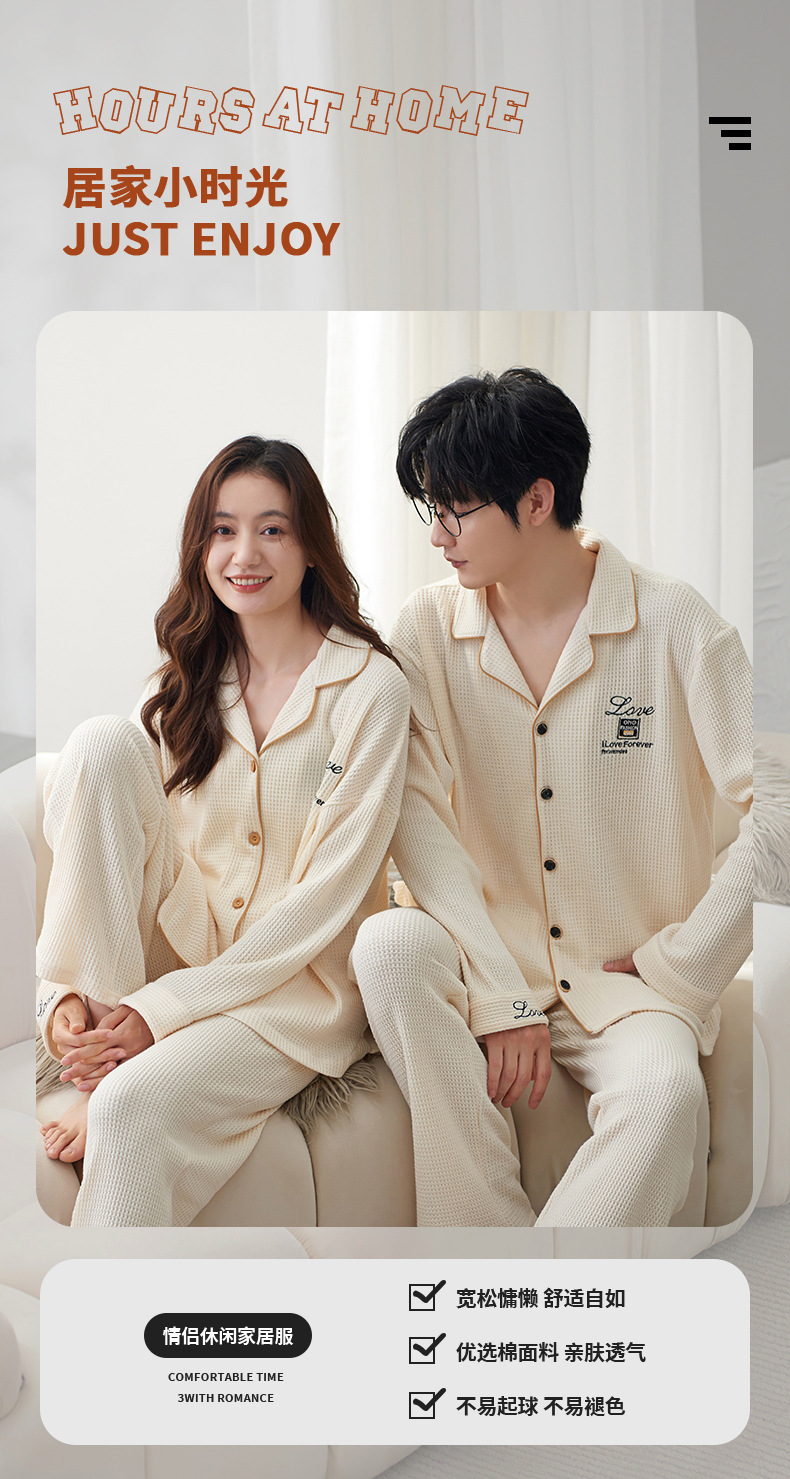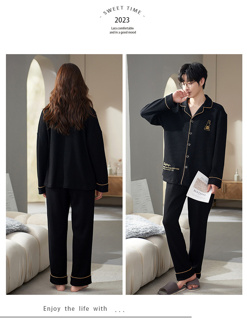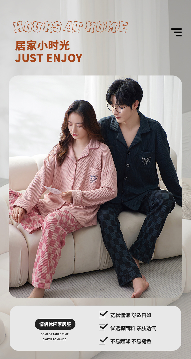 【韩式情侣款 卡通可爱超舒适!】秋冬季情侣睡衣开衫华夫格透气纯棉长袖休闲家居服男士女士春秋季