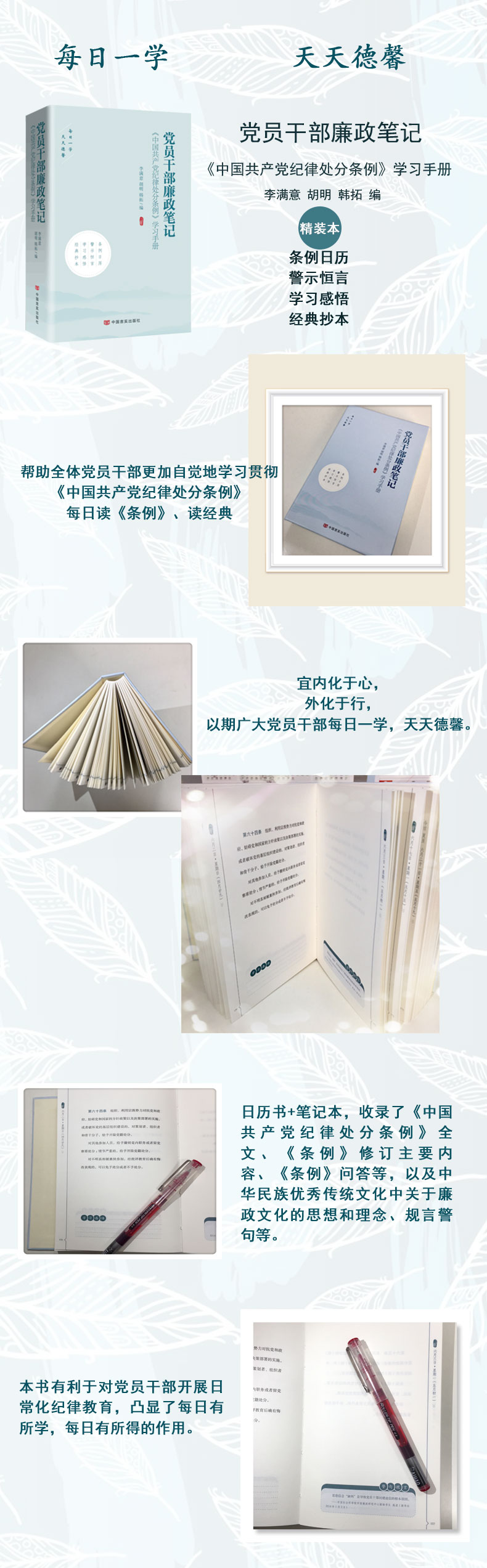 《党员干部廉政笔记》,日历书+笔记本,收录了《中国共产党纪律处分条例》全文、《条例》修订主要内容、《条例》问答等,以及中华民族优秀传统文化中关于廉政文化的思想和理念、规言警句等。本书有利于对党员干部开展日常化纪律教育,凸显了每日有所学,每日有所得的作用。