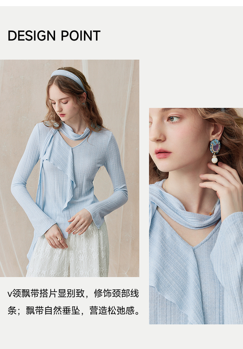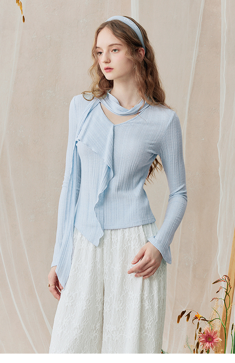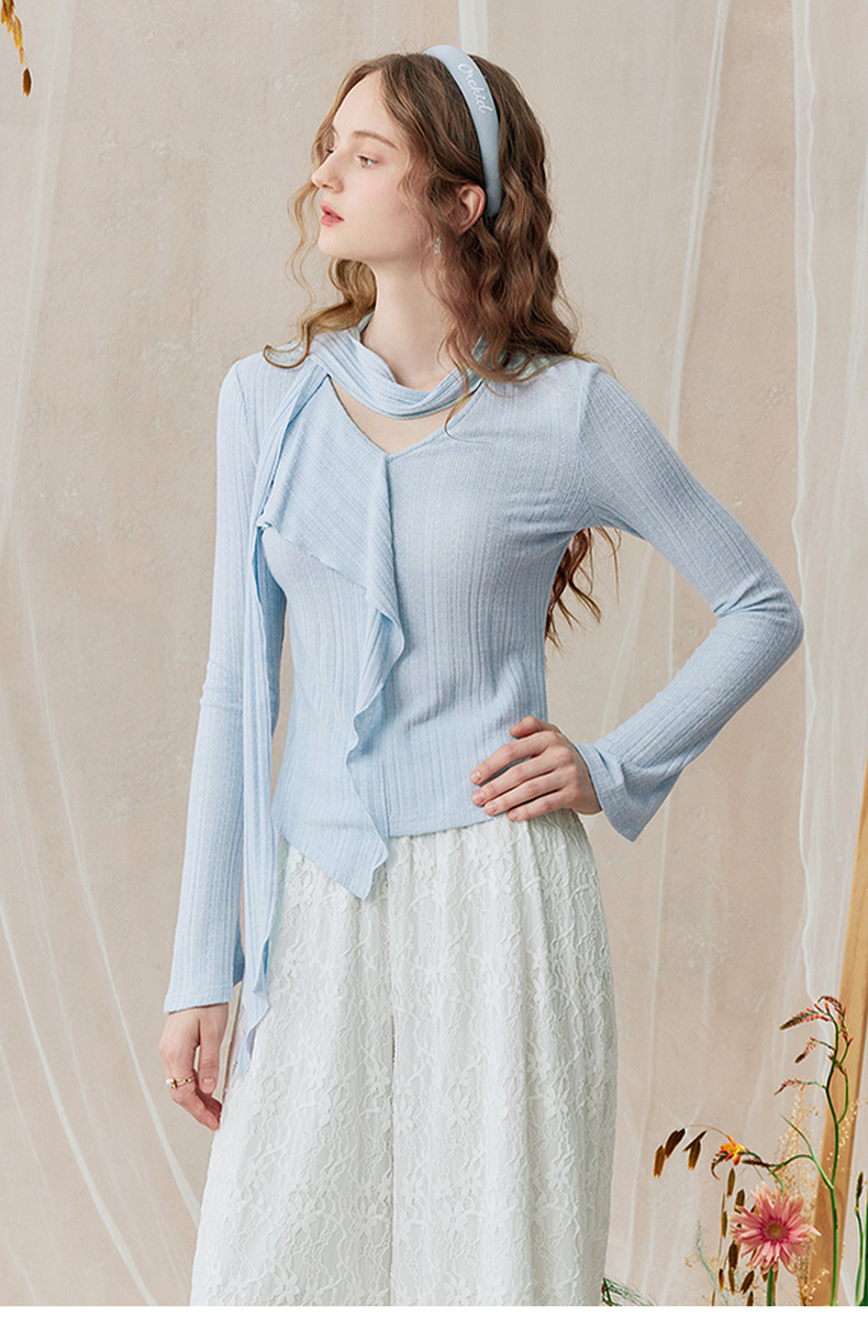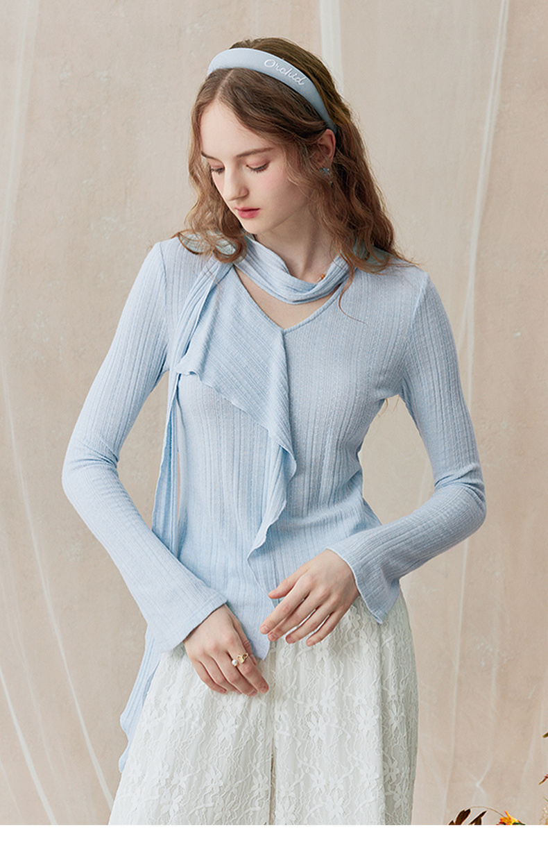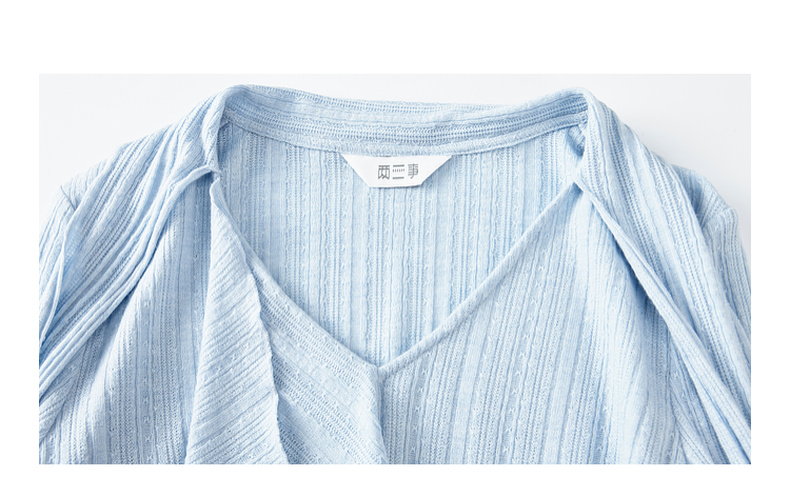 两三事 海露垂光 2025秋季新款简约荷叶边v领针织衫女配围巾