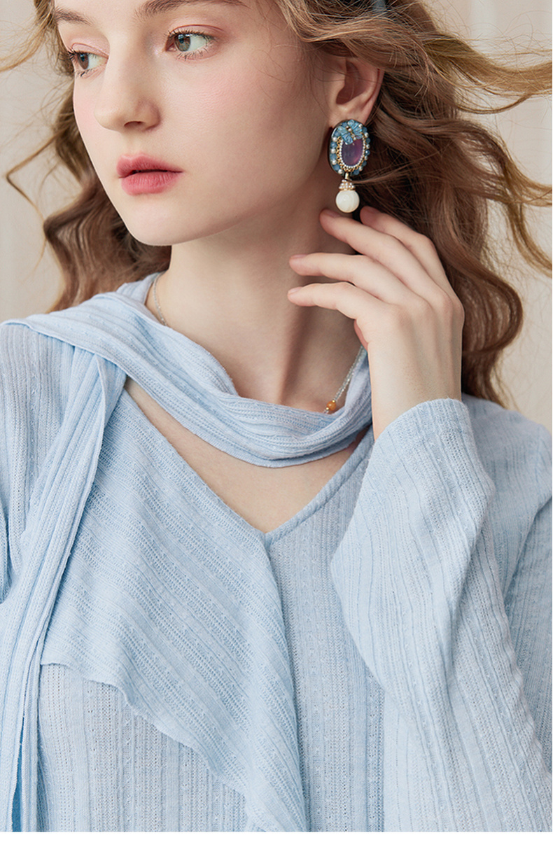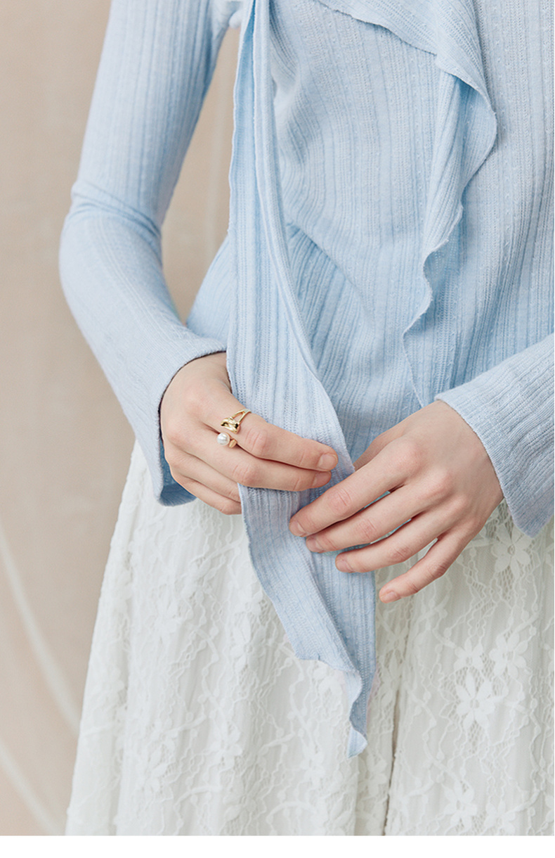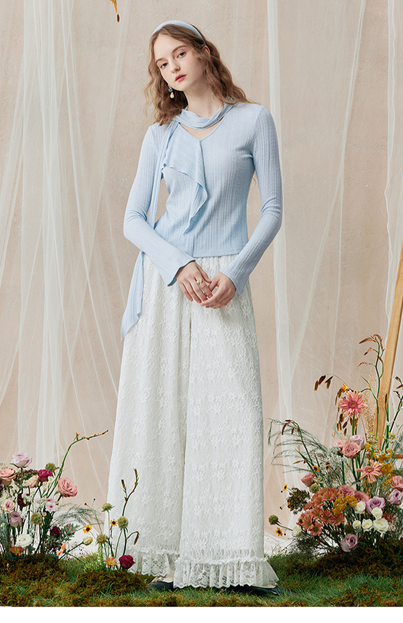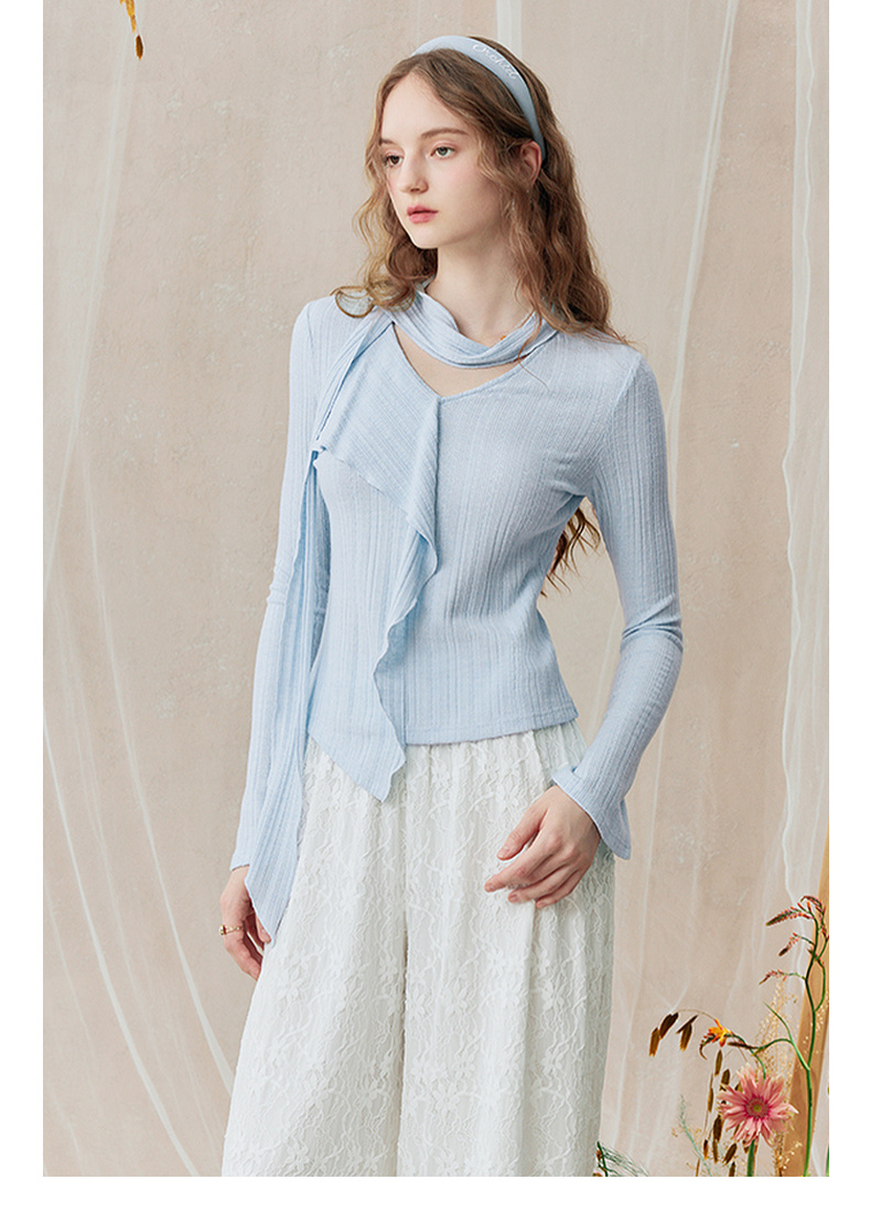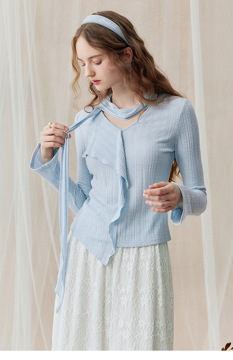 两三事 海露垂光 2025秋季新款简约荷叶边v领针织衫女配围巾