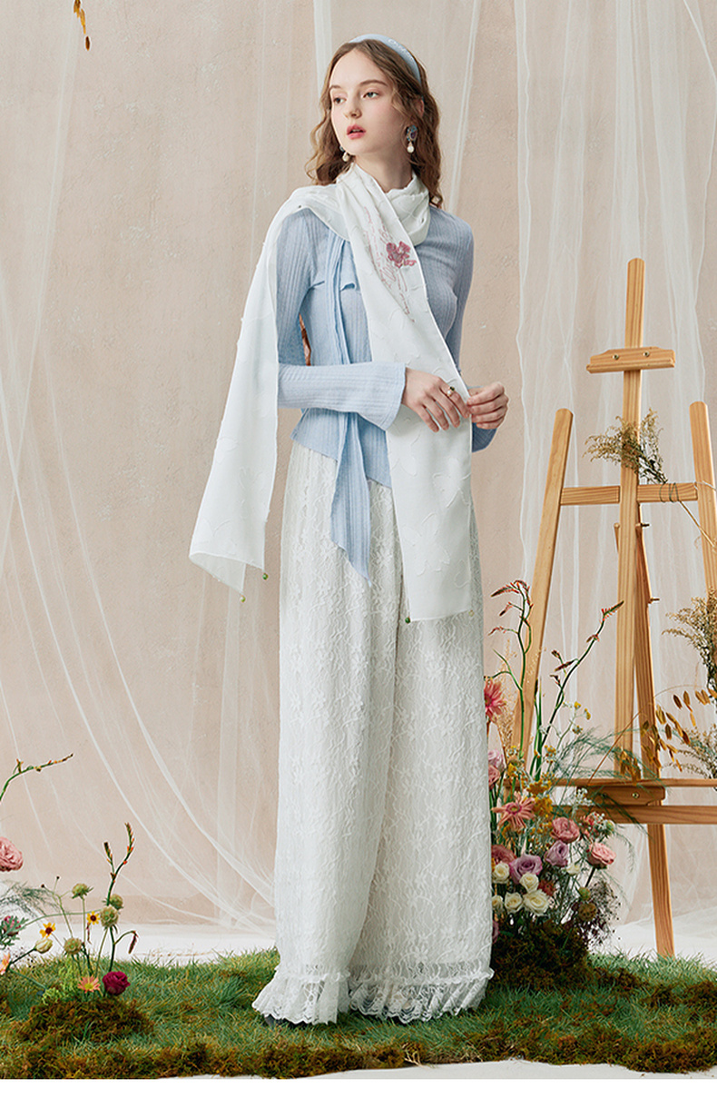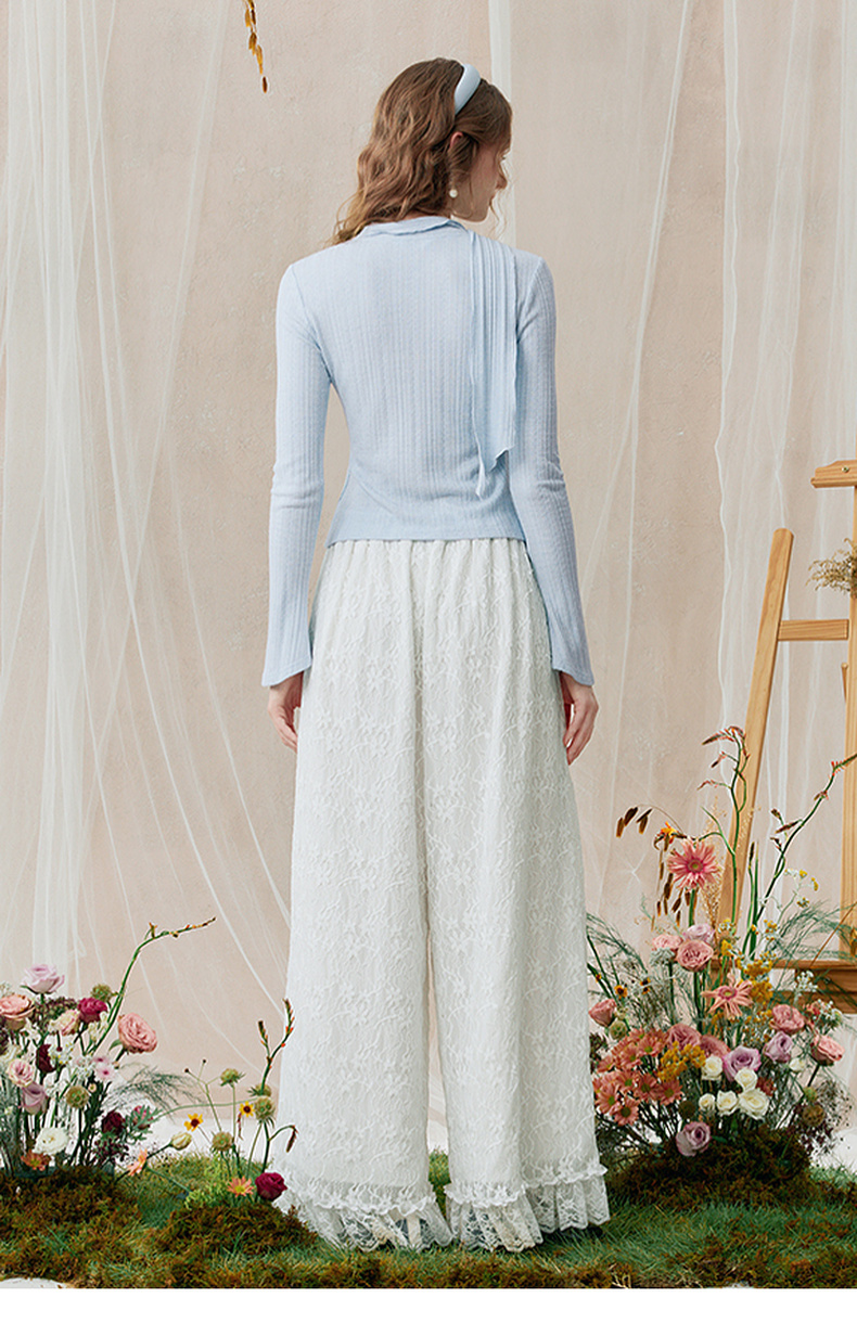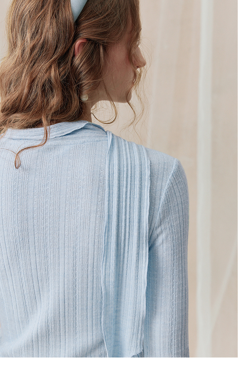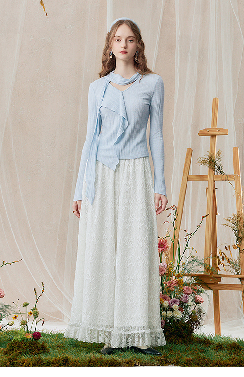 两三事 海露垂光 2025秋季新款简约荷叶边v领针织衫女配围巾