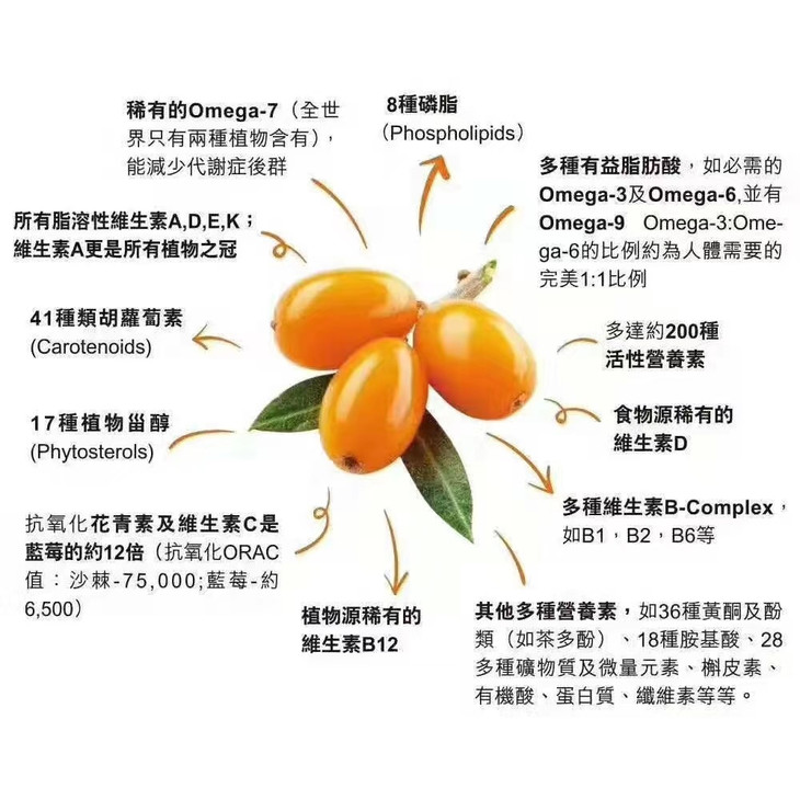 沙棘还含有丰富的黄酮,不饱和脂肪酸,亚油酸等多种营养成分。