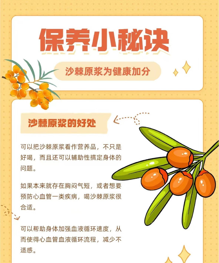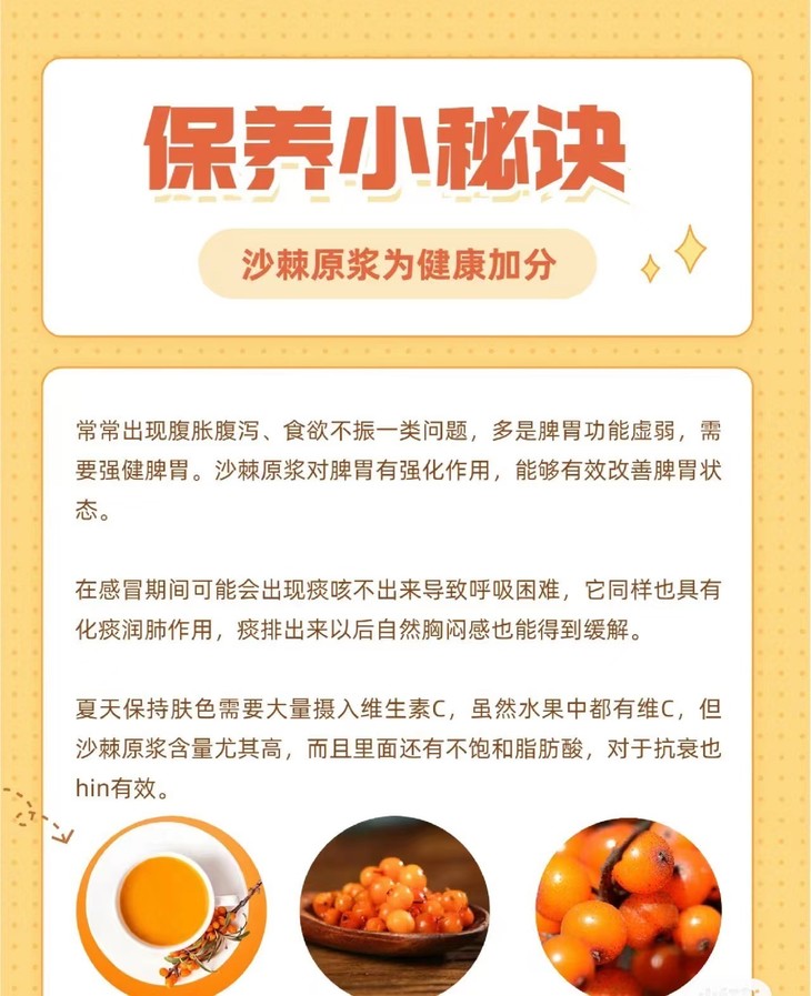 沙棘原浆是亚健康⼈群⾸选,为全家⽼少提供健康强屏障。