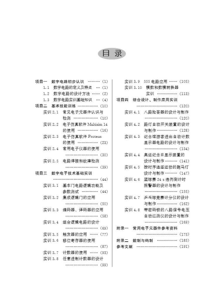 本教材将计算机技术与数字电子技术有机结合在一起,将数字电子技术课程的理论与实训紧密结合在一起。本书绪论部分简单介绍电子系统的基本组成和分类,以及电子系统的设计方法。第一篇安排的常用电子元器件认识和电烙铁焊接、电子仿真软件Multisim 12和Proteus、常用电子仪器的使用、电路板设计制作Protel DXP 2004 等基本技能训练实验,旨在加强学生的基本功训练;第二篇是结合大纲要求安排的集成逻辑门的应用、组合逻辑电路的设计、任意进制计数器的设计、555 电路应用等基础实验,以提高设计类实验为主,旨在培养学生理论联系实际能力,让学生掌握利用EDA工具进行数字电路的仿真和设计。第三篇为综合设计和制作应用课题,结合江西省大学生电子综合大赛,选取易拉罐饮料计数自动化装置设计与制作等竞赛题,改编为实训项目,旨在培养学生解决实际问题的能力,掌握设计制作电子产品的方法和步骤;第四篇附录收录了一些常用电子元器件、芯片资料以及数制与码制基本知识供读者参考。