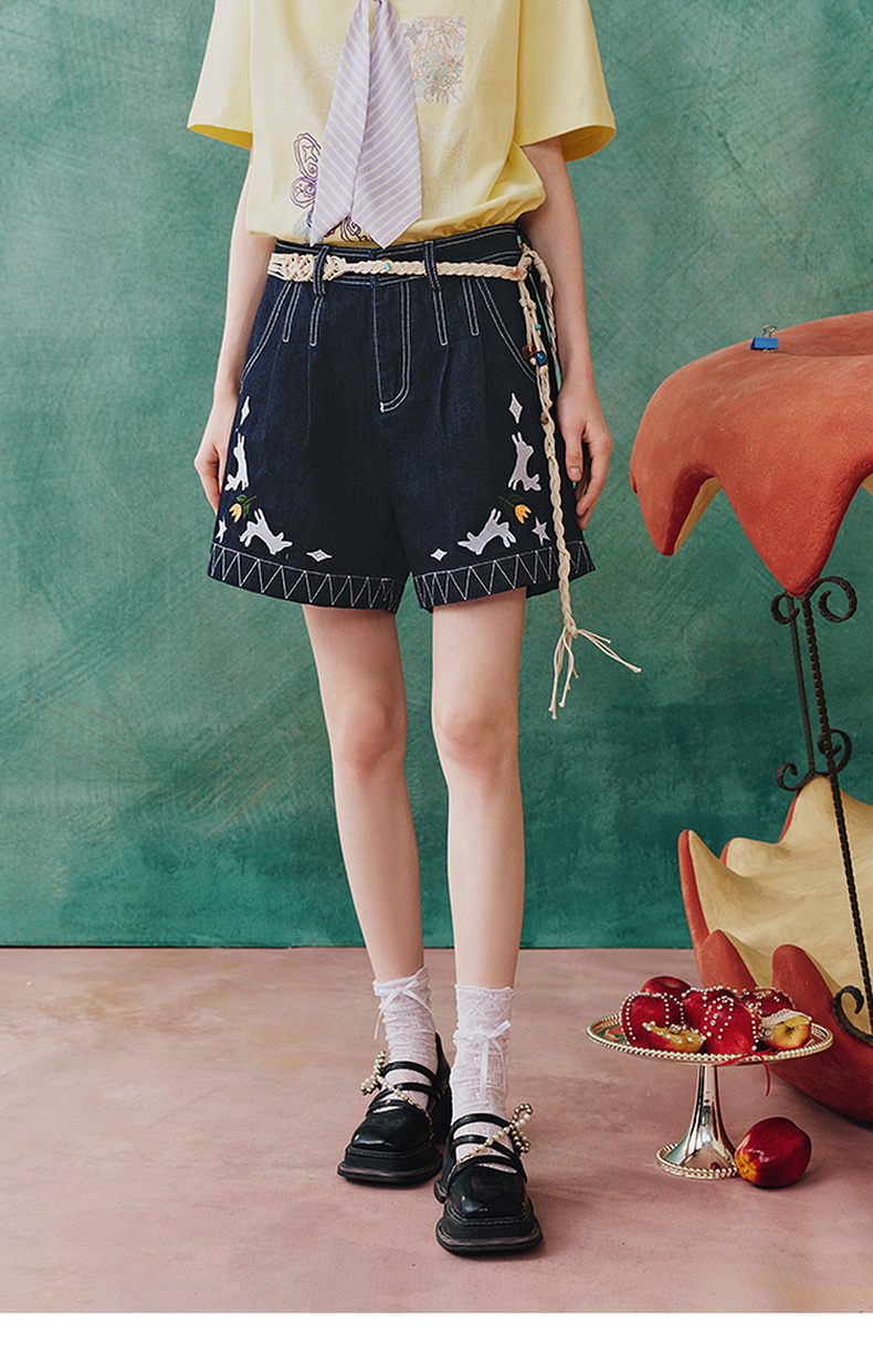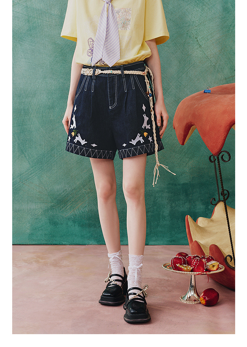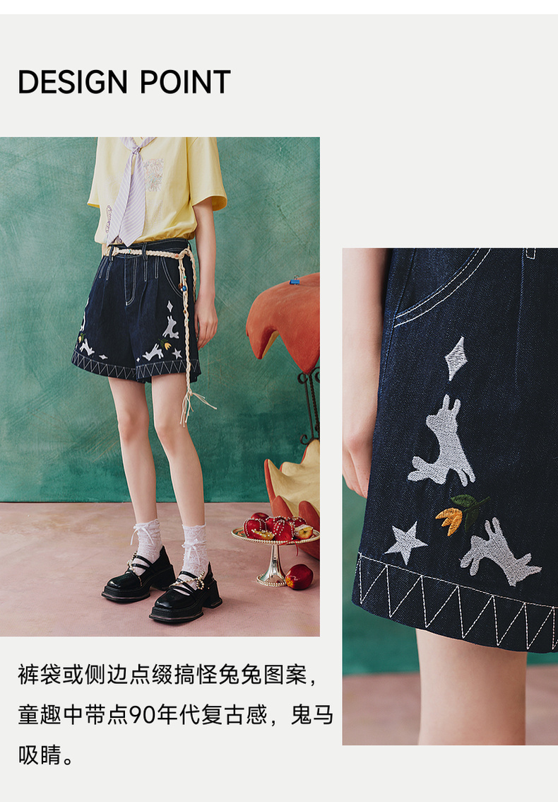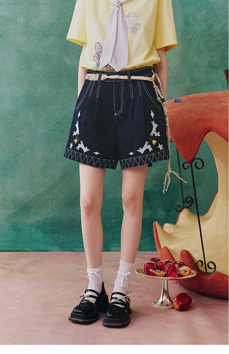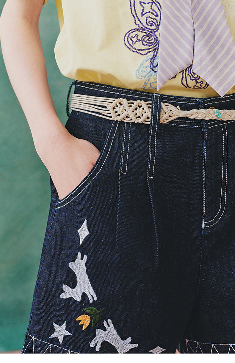 两三事 飞兔幻境 2025夏季新款复古兔兔刺绣编织腰带牛仔裤女