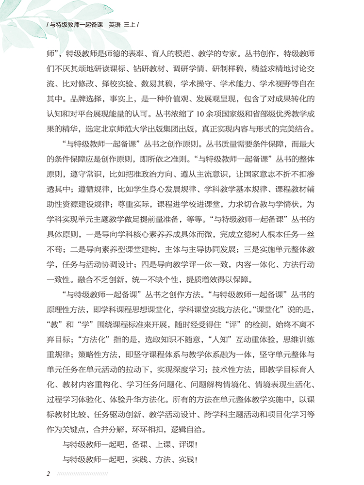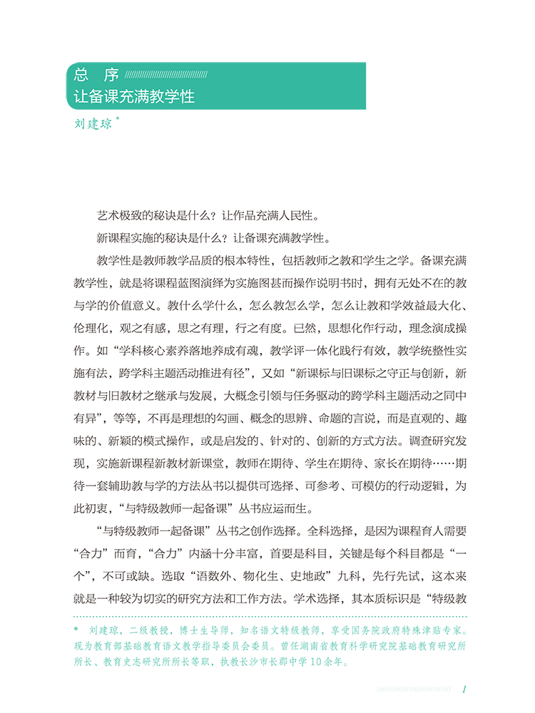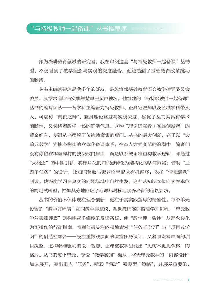 本系列汇聚特级教师的丰富教学经验,结合新课标、新教材,帮助教师打通新课标到新教学的“最后一公里”,为一线教师提供实际操作的备课指导和教学案例,助力教师快速成长。各册按照各学科教材自然单元顺序安排若干单元,形成丛书新单元。再附录两个不同类型的跨学科学习案例。本丛书以单元主题教学为特色来创作, 围绕学科核心素养,遵循教学评一体一致,由特级教师带领一线学科教师备课。本丛书具体单元包括的栏目有内容概述、教学问题、学习目标、内容设计、教学实施、资源辅助。通过特级教师的经验分享和案例分析,深入剖析了大单元教学的特点和实施方法,为教师们提供了宝贵的实践经验和理论支持。同时,随着新课标的实施和新教材的推广,教师们面临着如何适应新要求的挑战。该系列图书紧密结合新课标和新教材的内容,为教师们提供了详细的教学指导和策略,有助于教师们更好地理解和实施新课标和新教材的要求。
