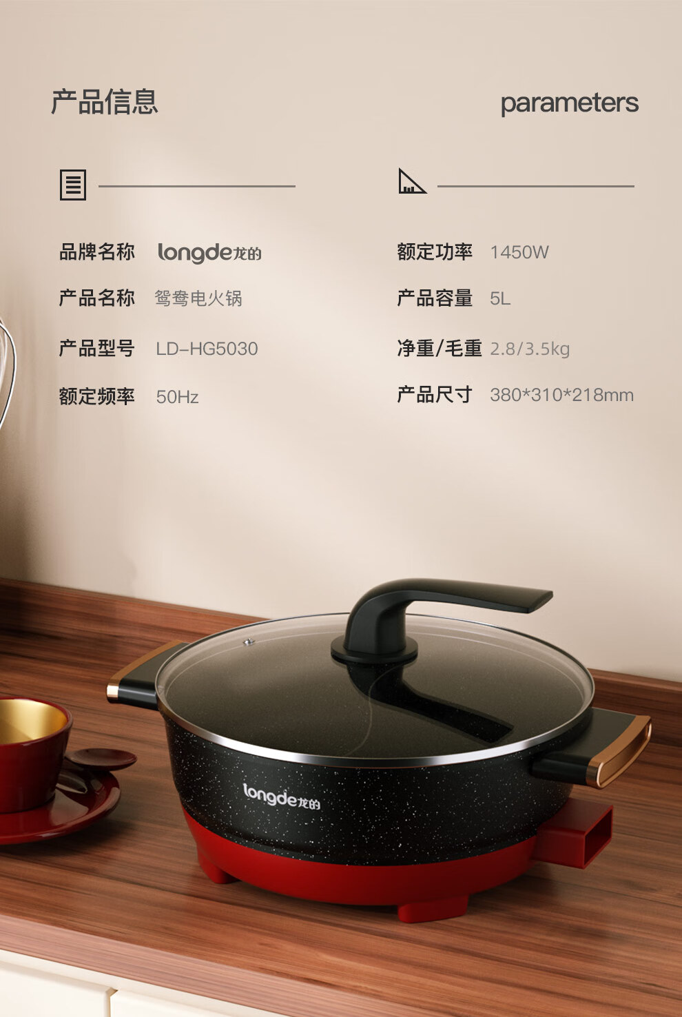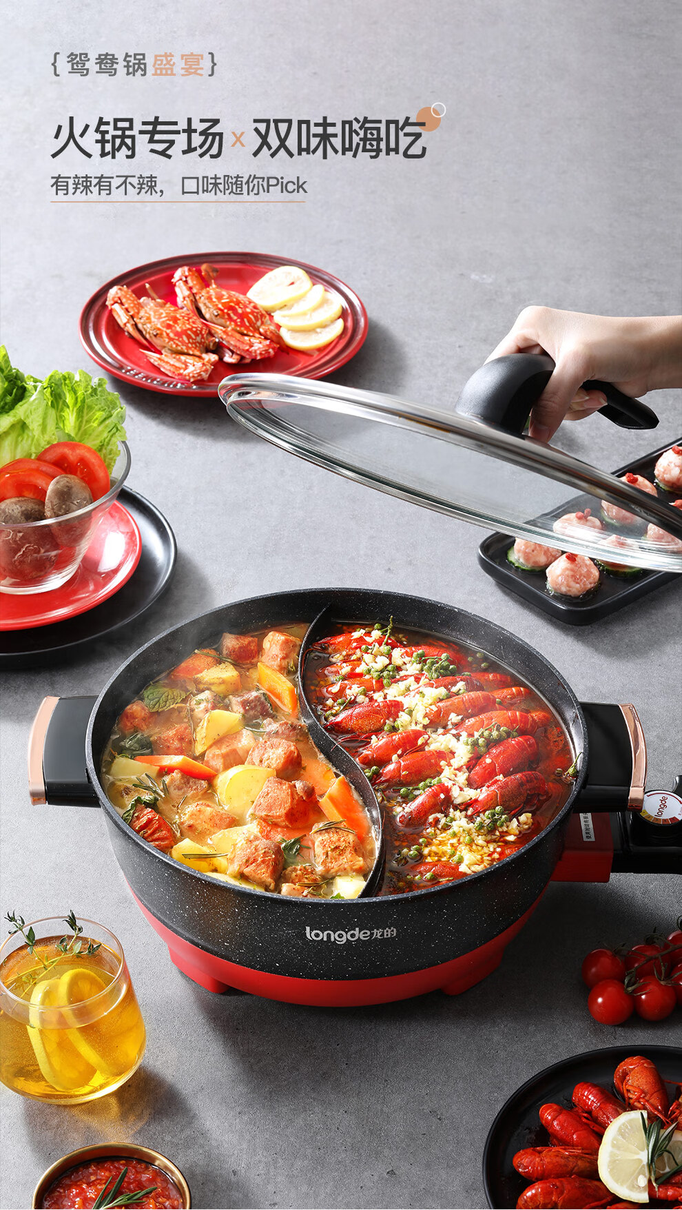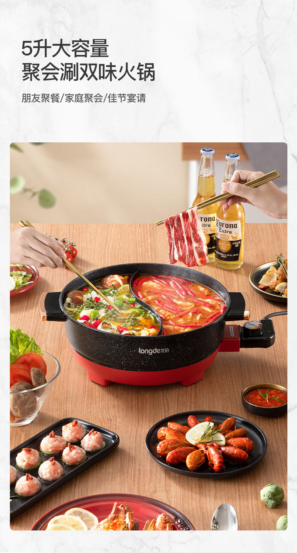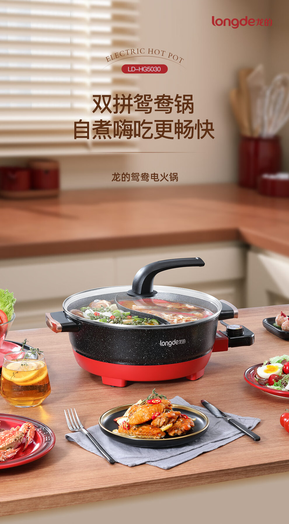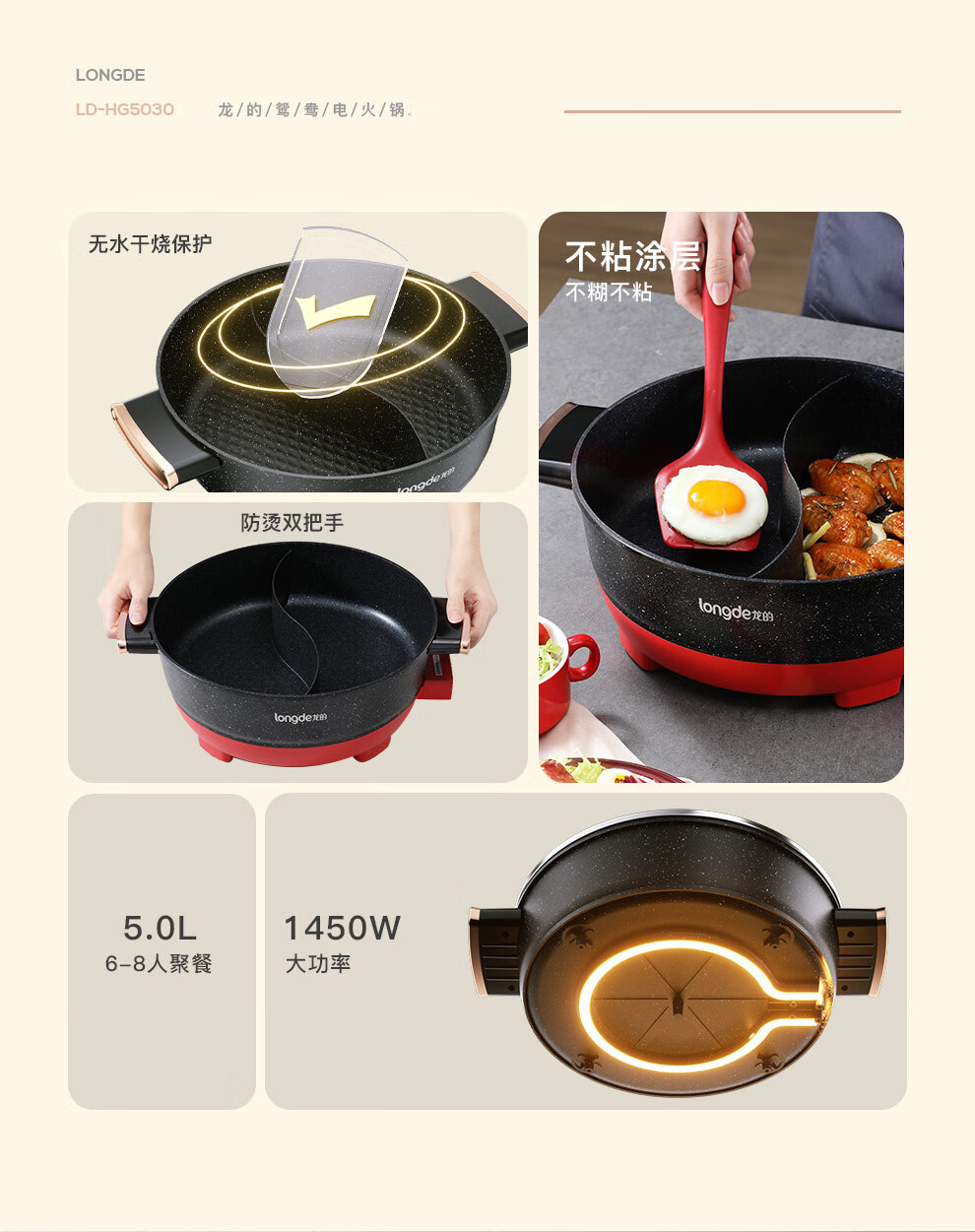 【小家电】龙的longde电火锅 双拼鸳鸯锅 5L大容量火锅专用锅 无水干烧保护防烫把手电锅一体家用多功能料理锅 LD-HG5030 HF