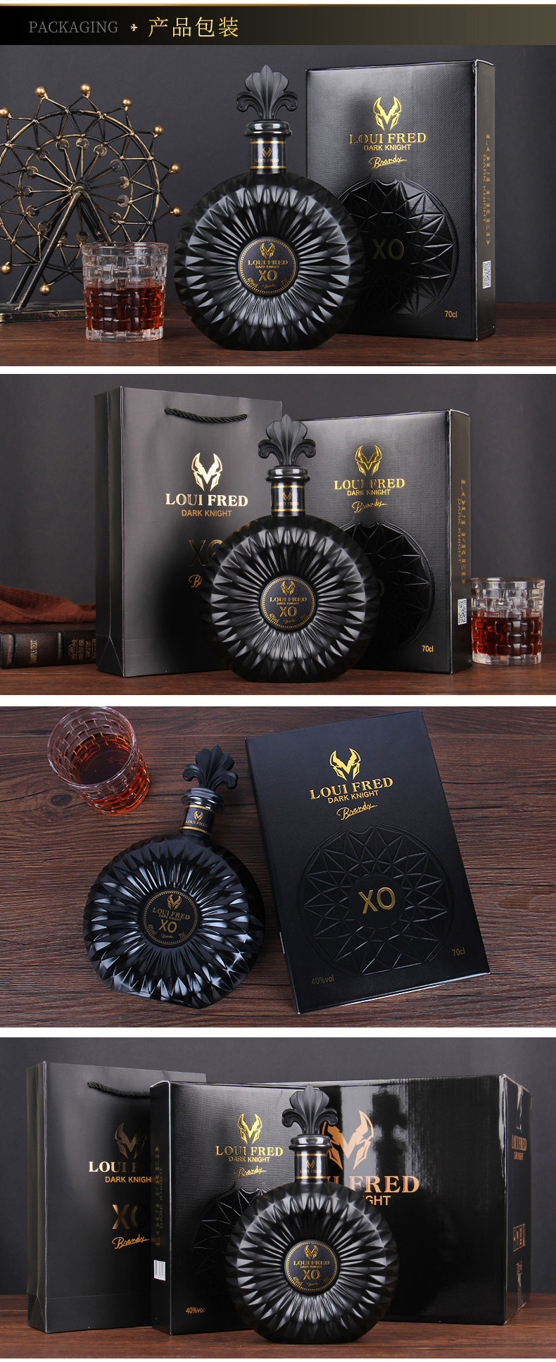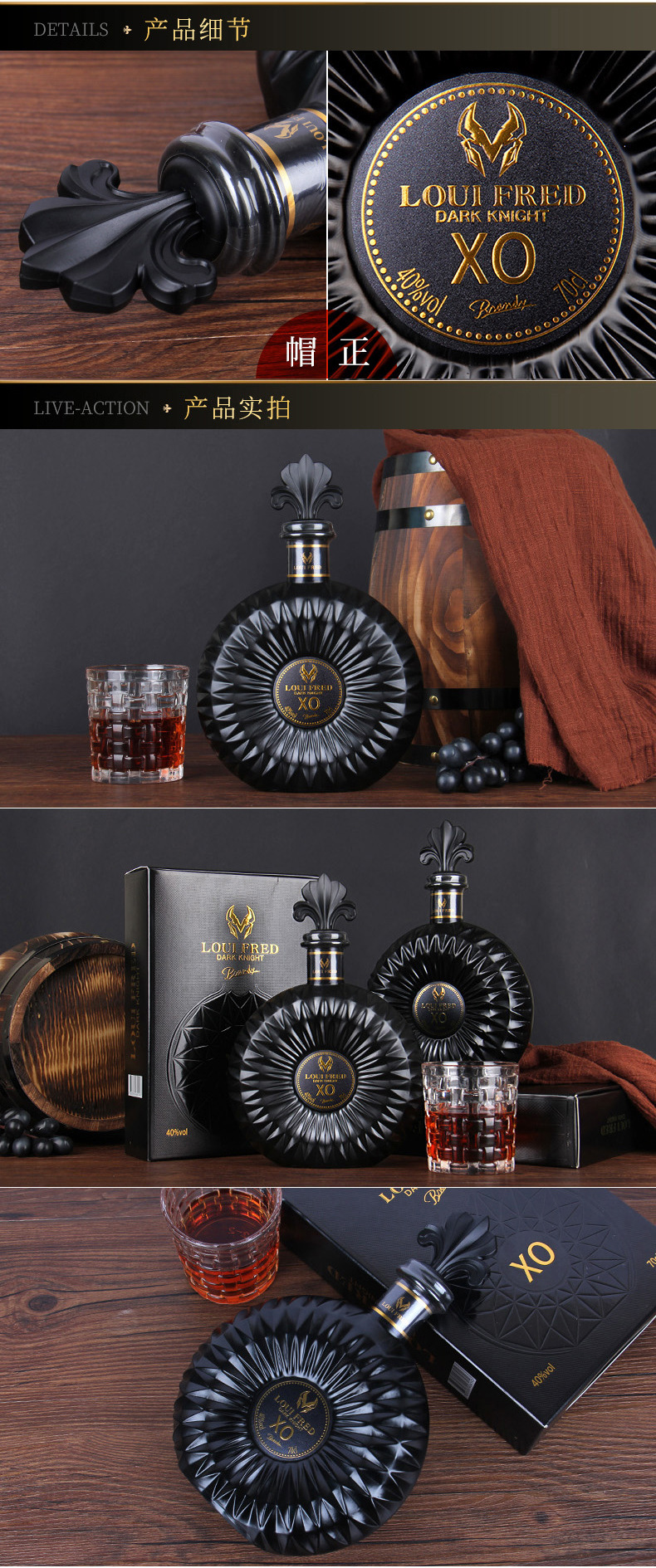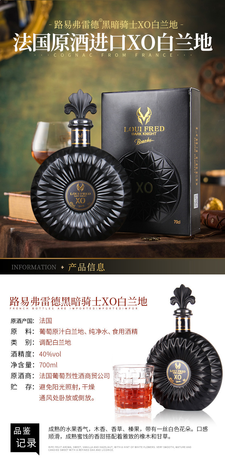 【酒液金黄清澈透亮!法国进口洋酒】烈性与风味交织,浓郁与纯净共舞。法国原酒进口洋酒40度xo白兰地路易弗雷德黑暗骑士700ml礼盒装