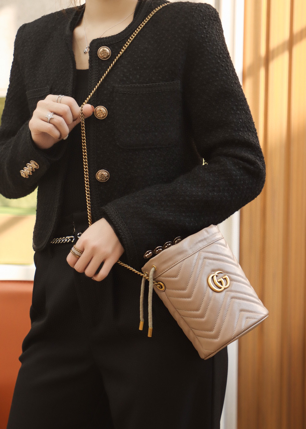 包身正面以经典的姿态𝐆𝐆标志✅五金呈现,