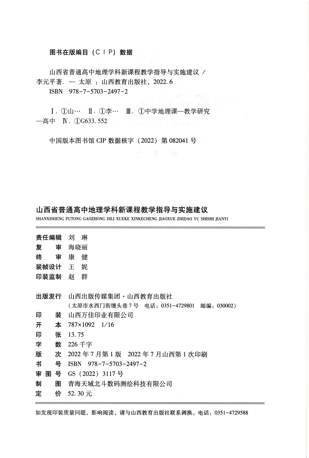 正版 山西省普通高中地理学科新课程教学指导与实施建议 李元平著 山西教育出版社出版