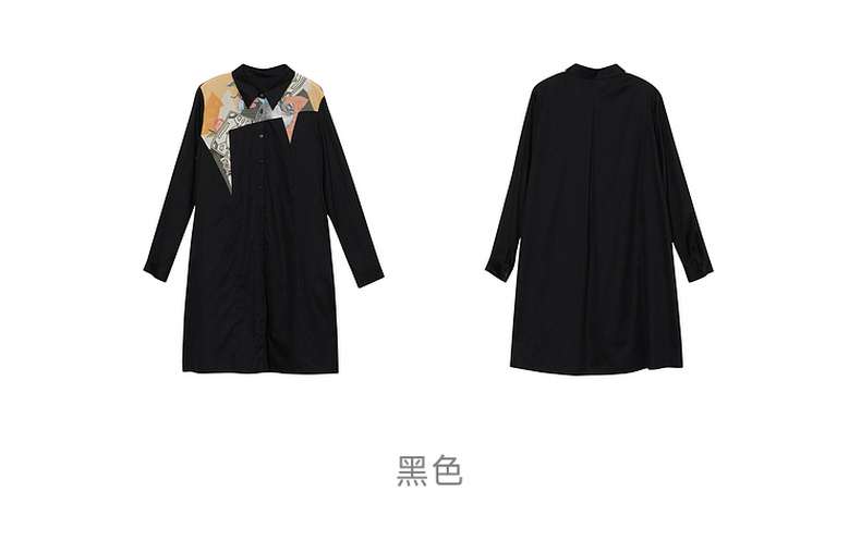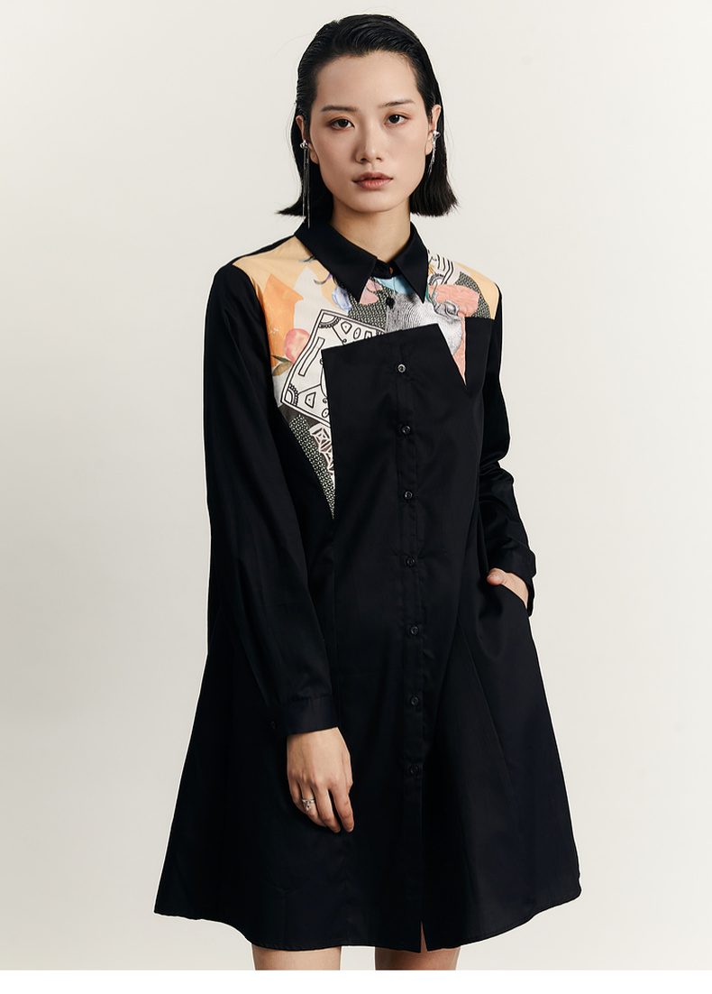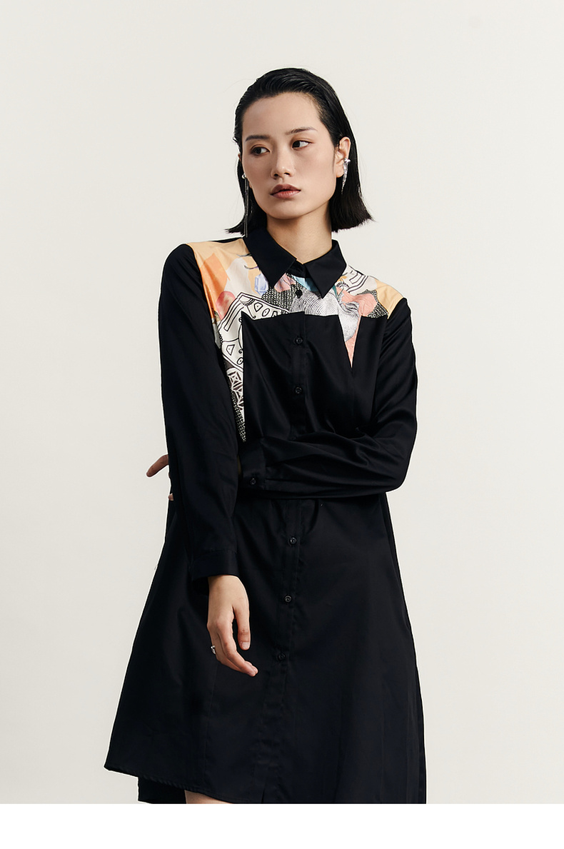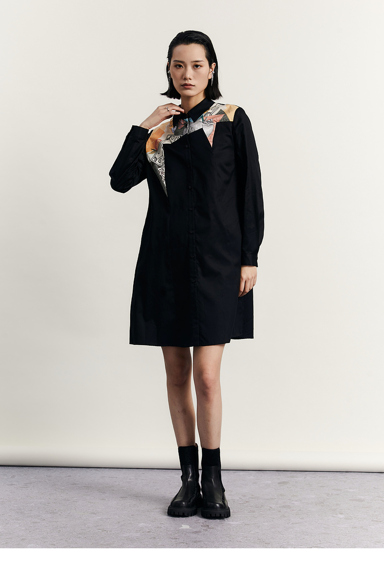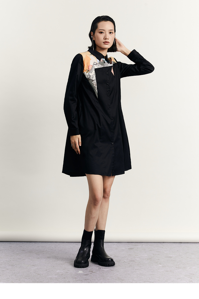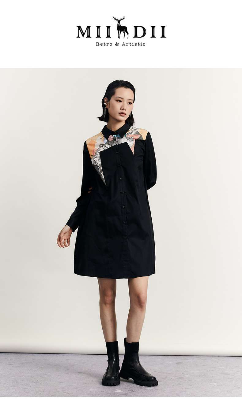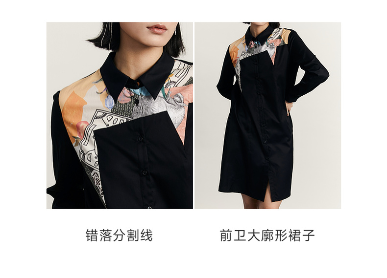 谜底衬衫式连衣裙2023秋款时尚简约印花拼接宽松中长裙233ML1104
