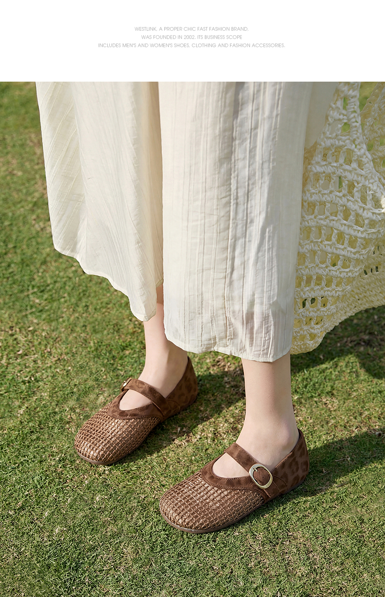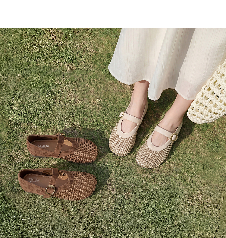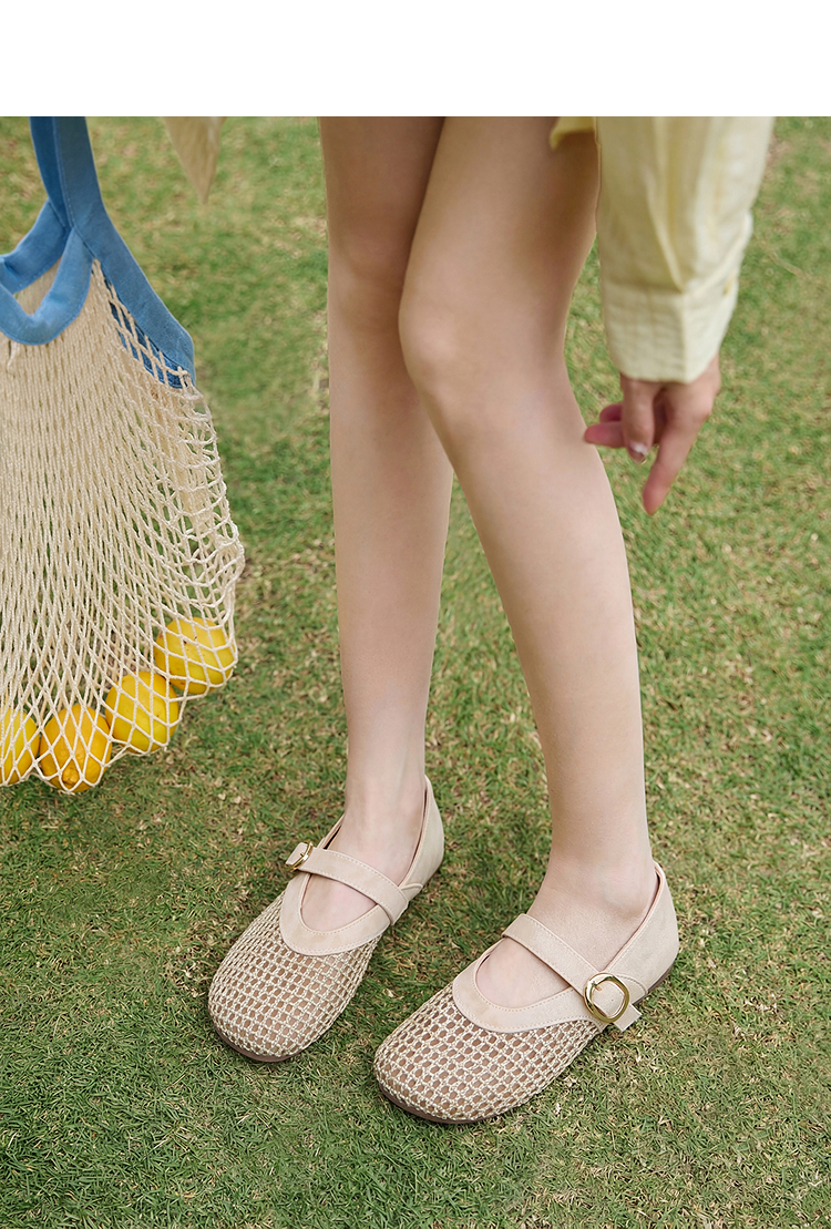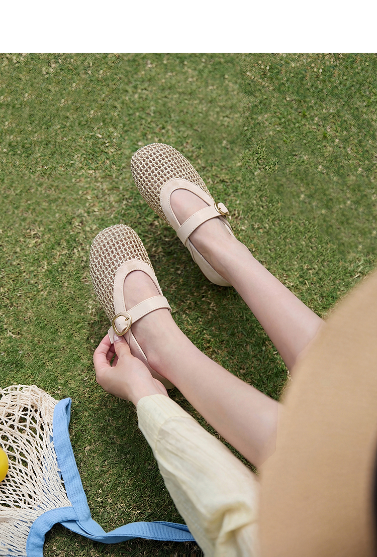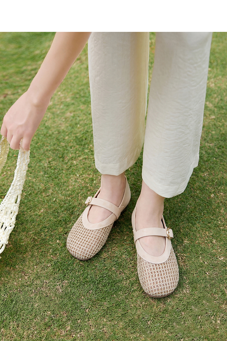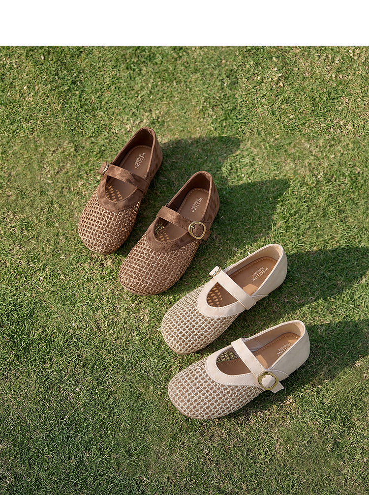 西遇镂空编织玛丽珍鞋女2026春夏季新款一字扣平底透气通勤单鞋子V0566354