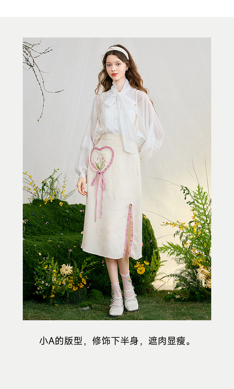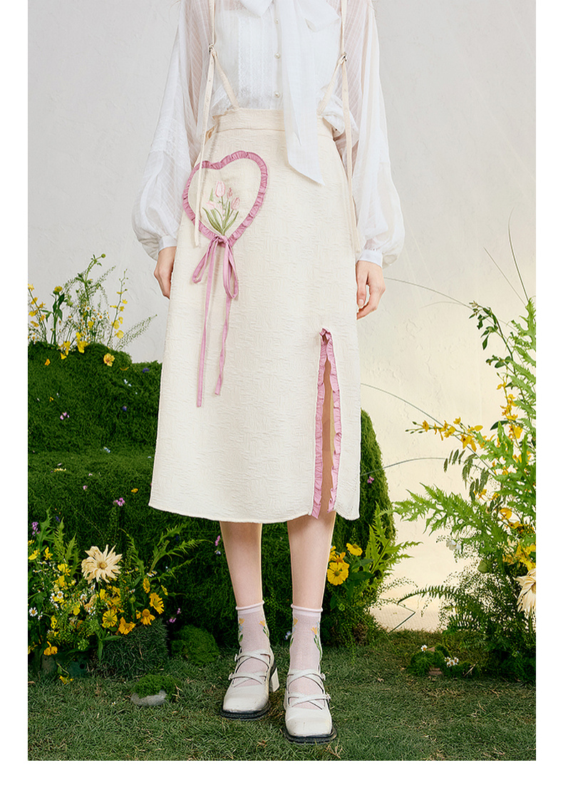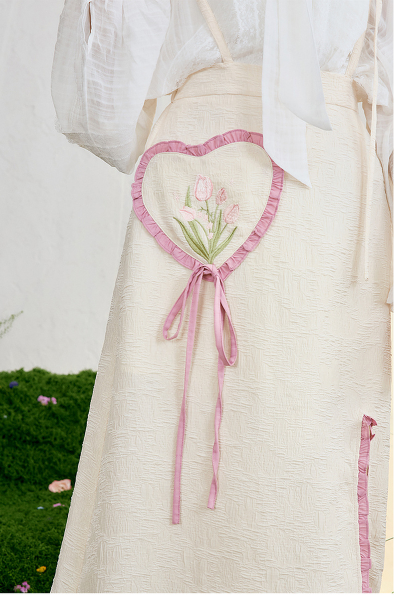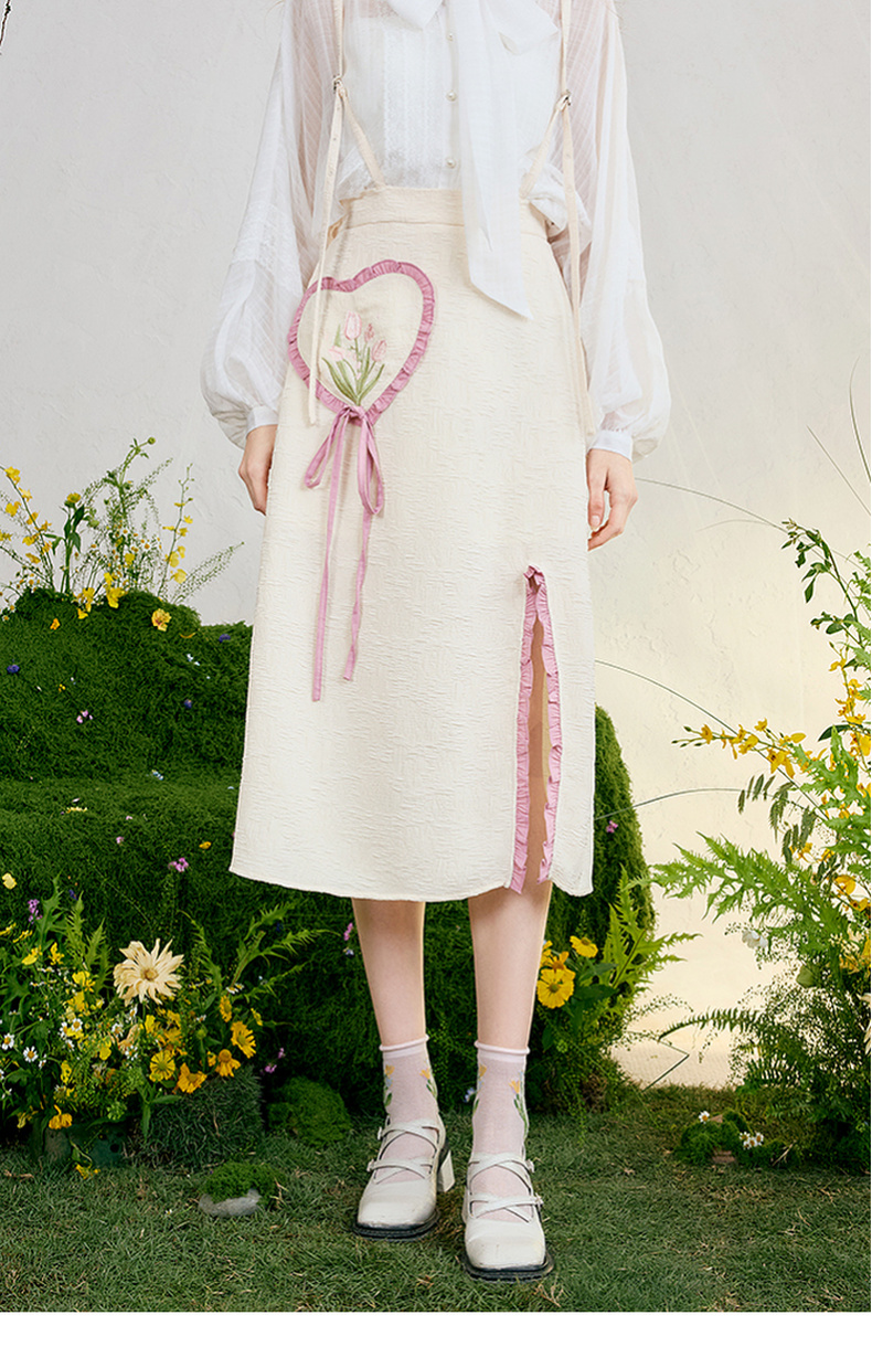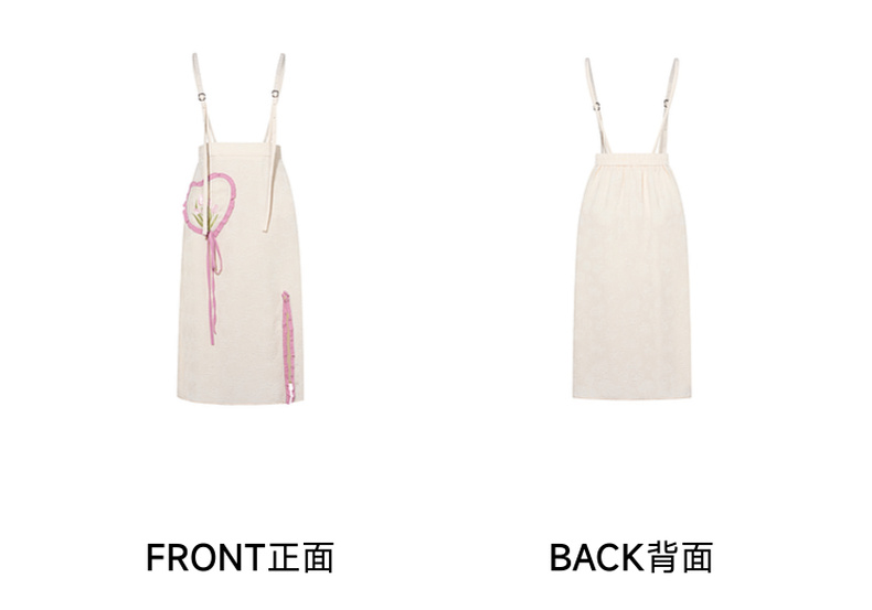两三事 恋香甜心 2025春季新款小清新绣花心形口袋开叉背带半身裙