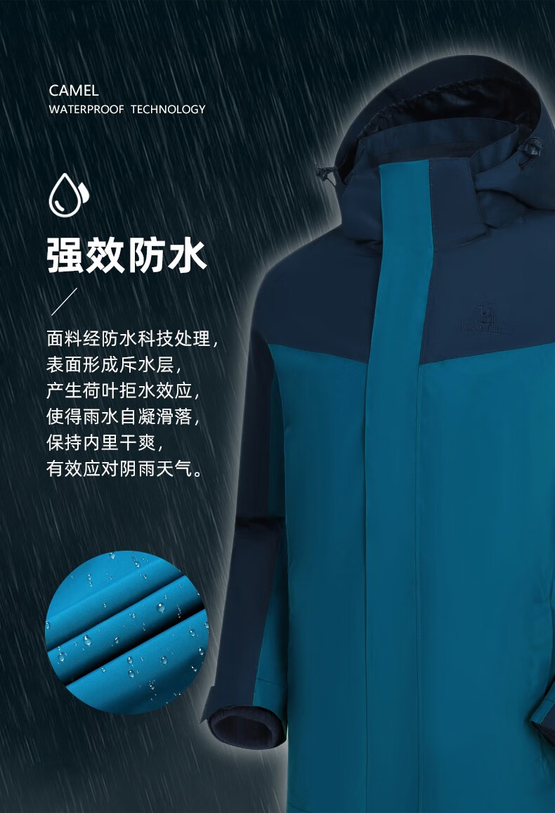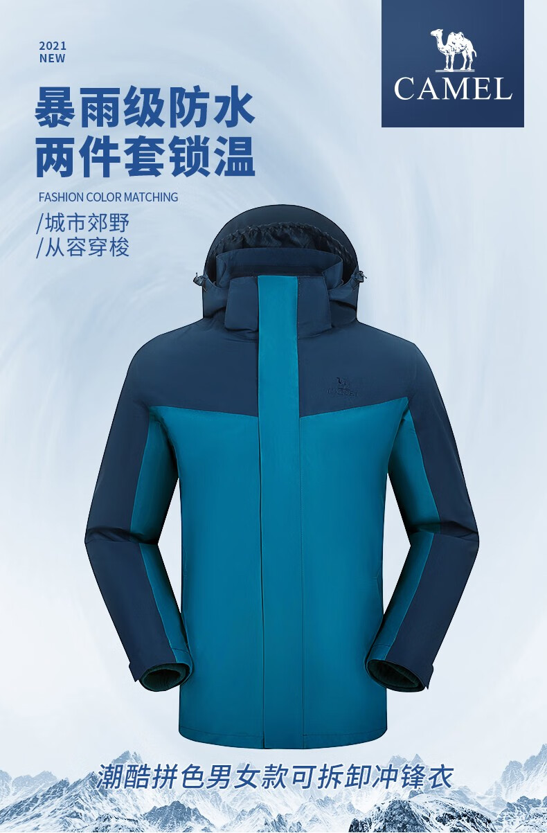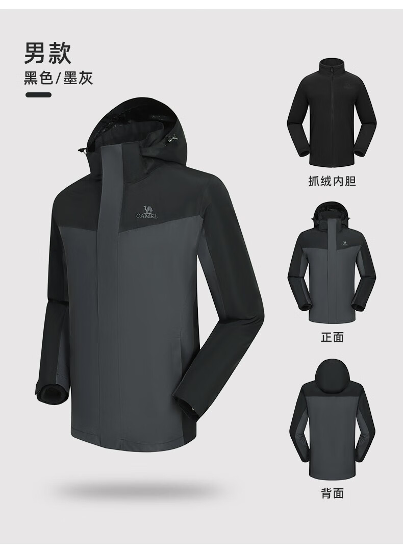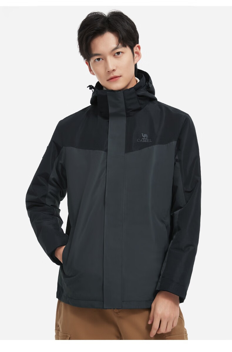 【断货断码清仓,不支持退换】骆驼新款三合一抓绒冲锋衣情侣可拆卸防风防水拼色潮流户外服男女 V1W249968,黑色/墨灰,男
