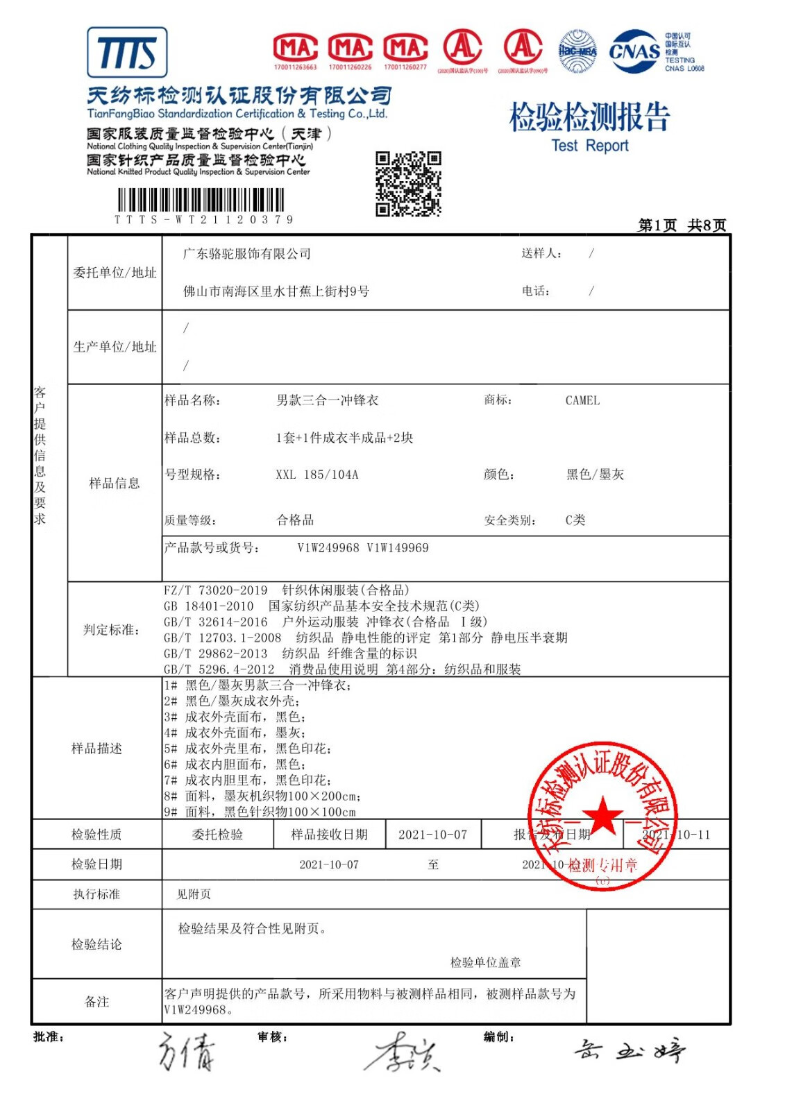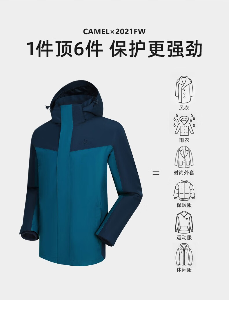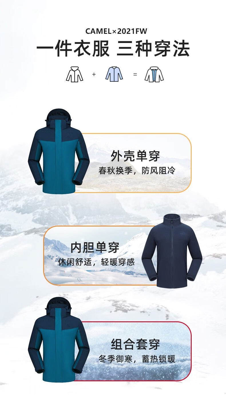 【断货断码清仓,不支持退换】骆驼新款三合一抓绒冲锋衣情侣可拆卸防风防水拼色潮流户外服男女 V1W249968,黑色/墨灰,男