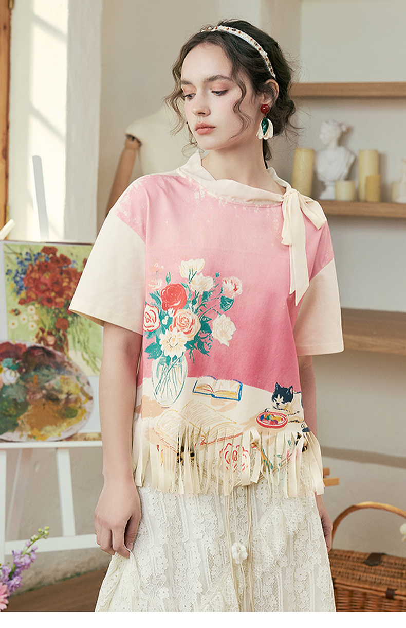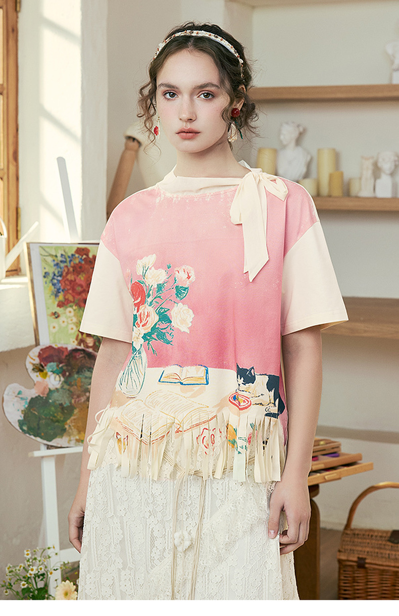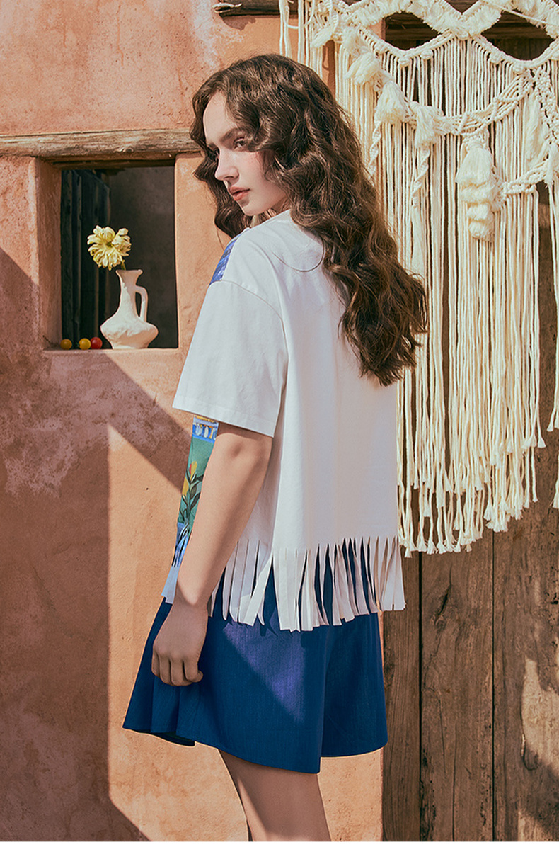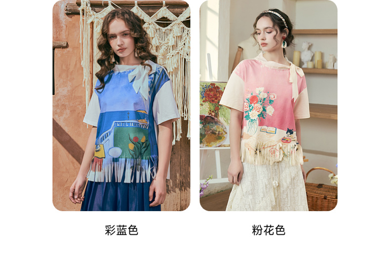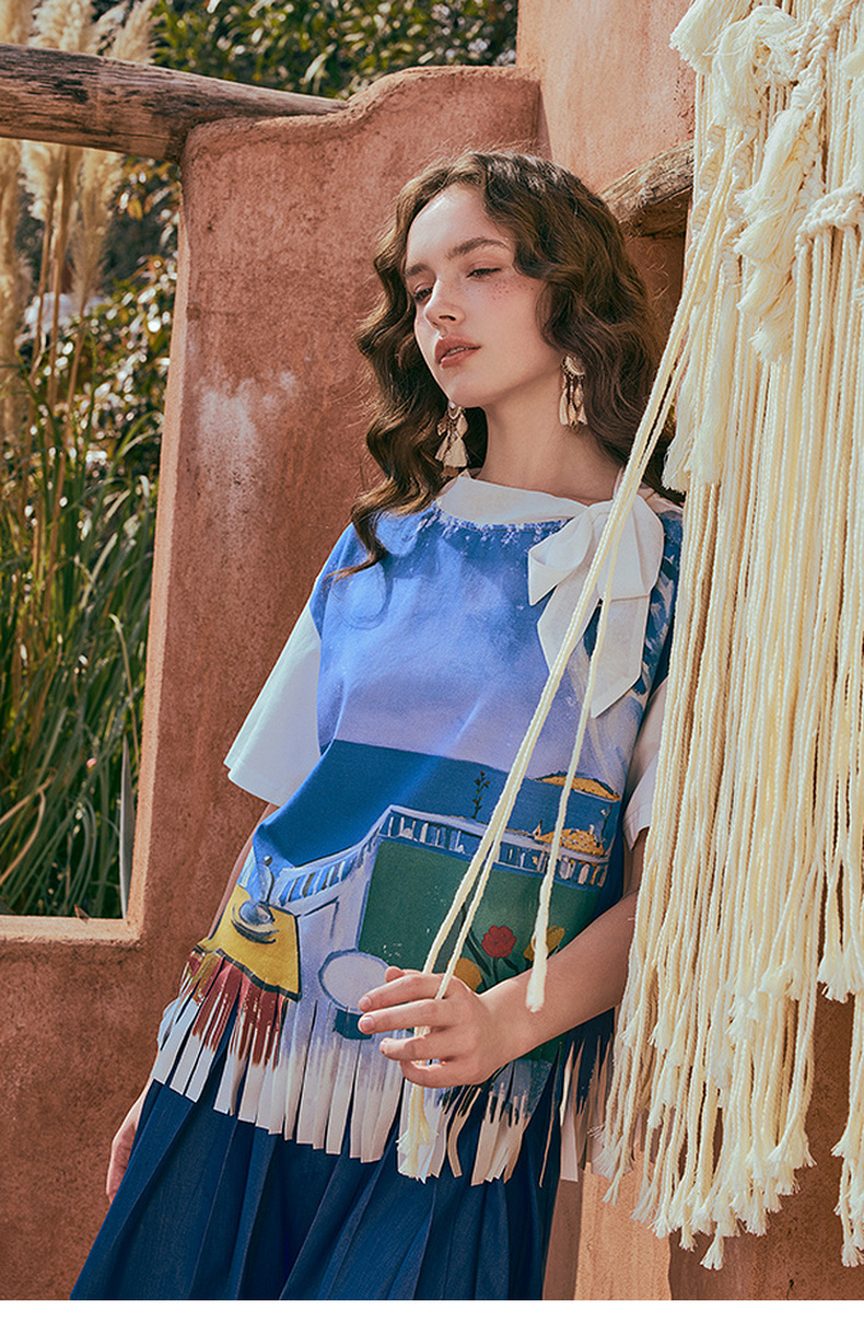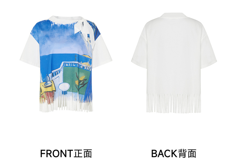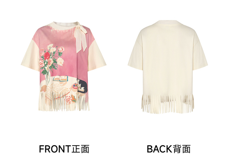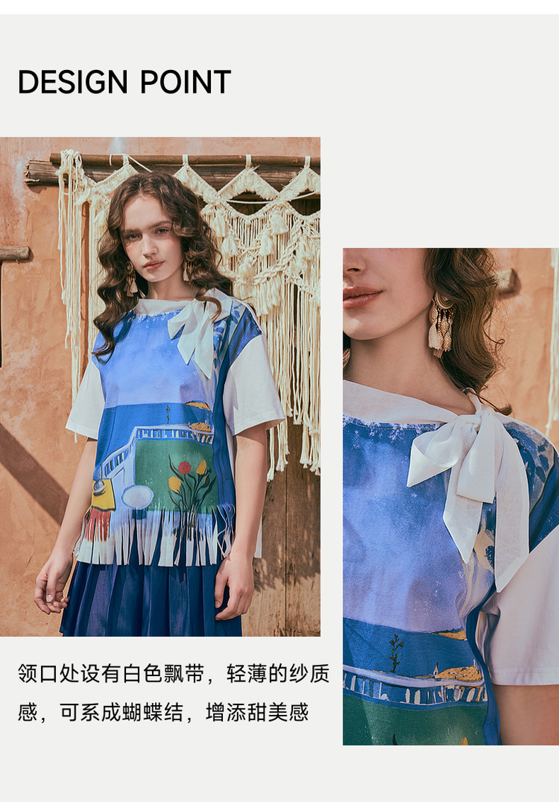 两三事萤海燃诗2025夏新款休闲流苏下摆绑带领印花短袖t恤女宽松