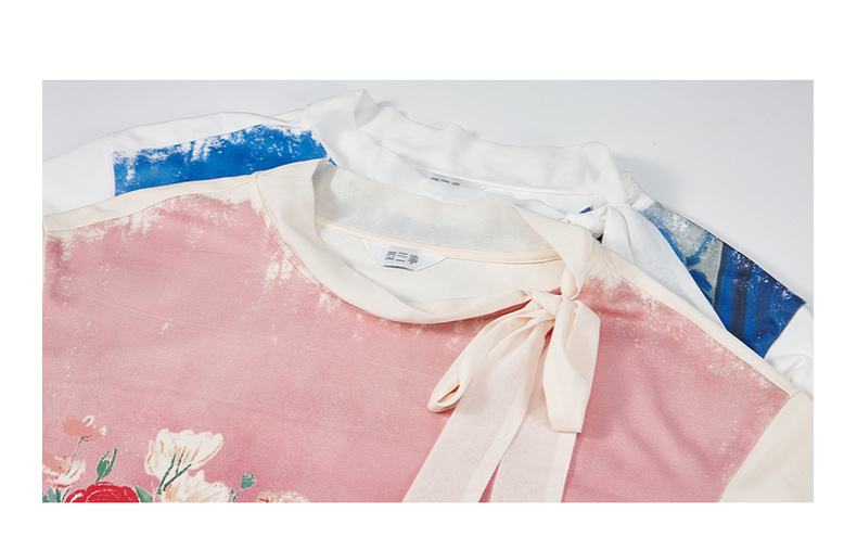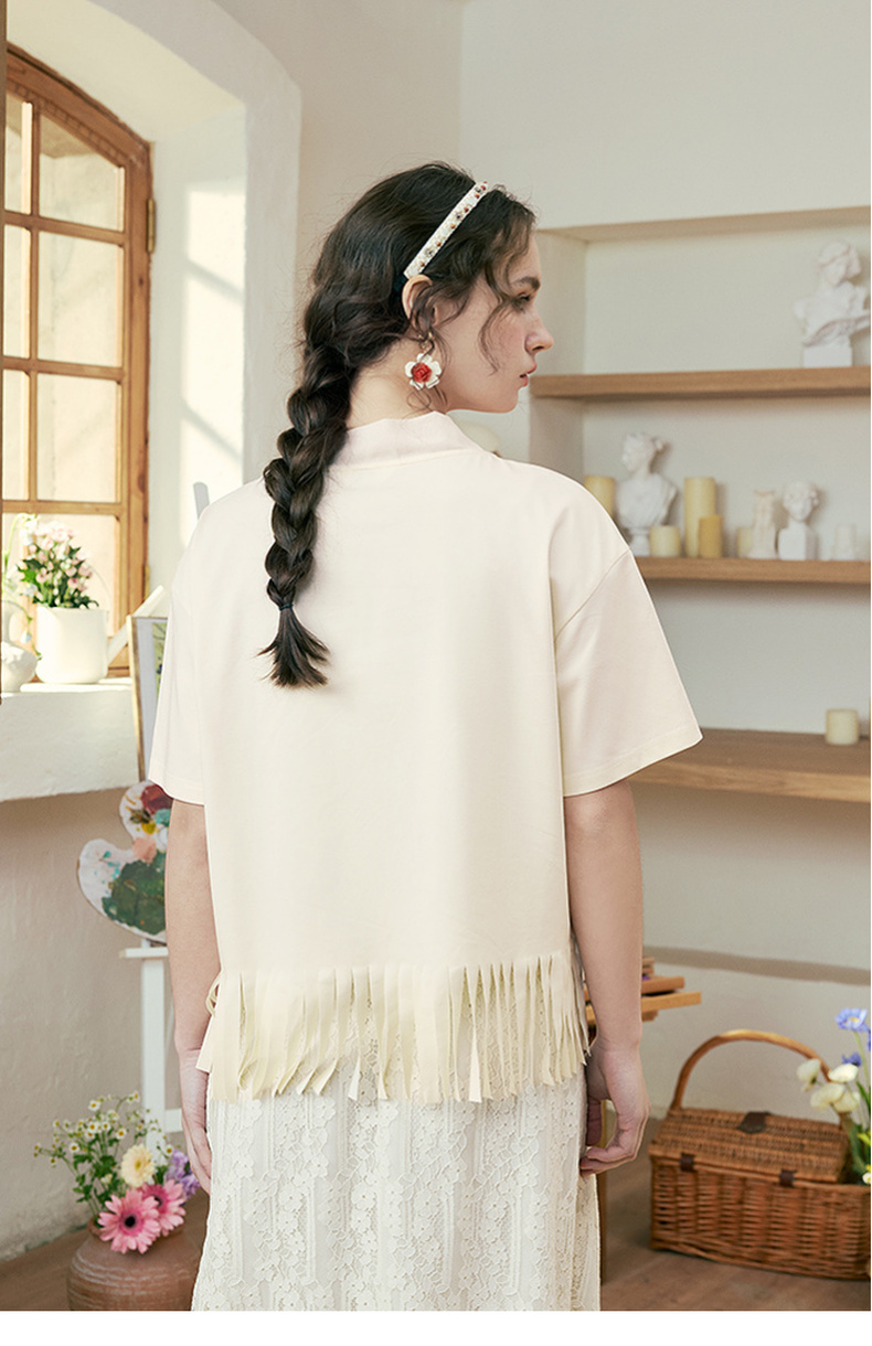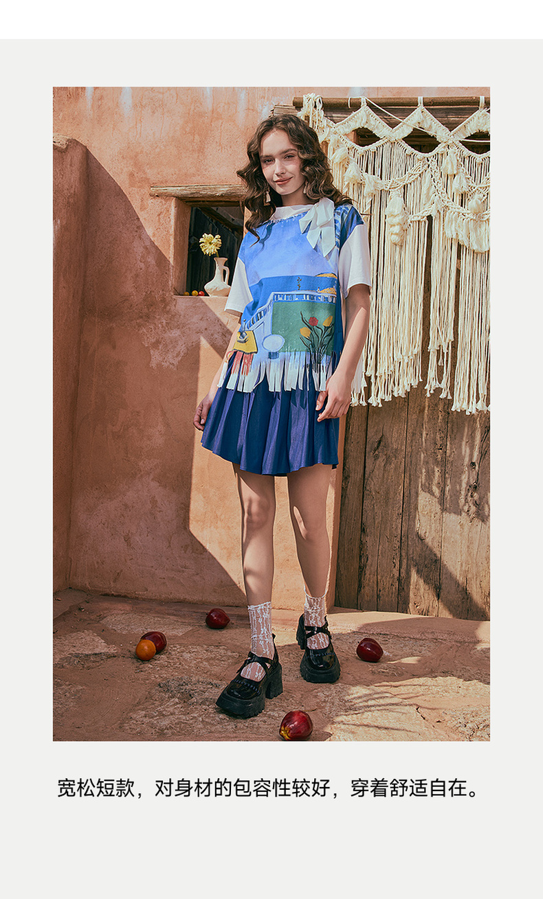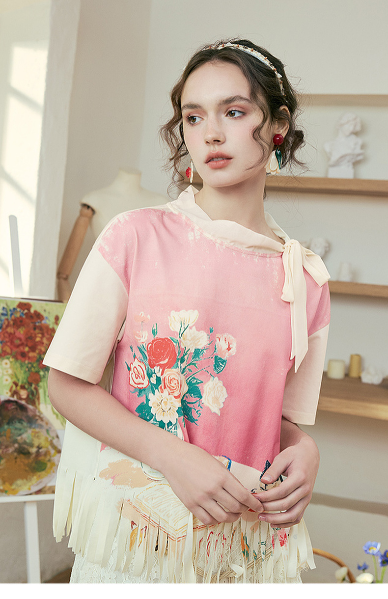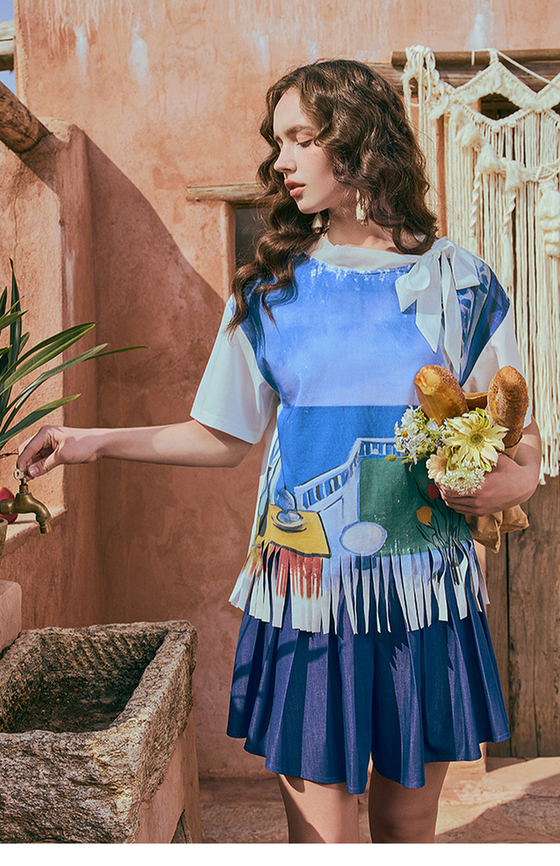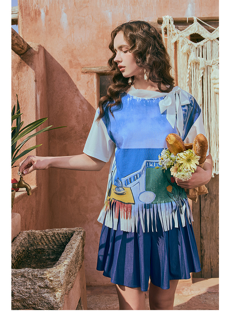 两三事萤海燃诗2025夏新款休闲流苏下摆绑带领印花短袖t恤女宽松