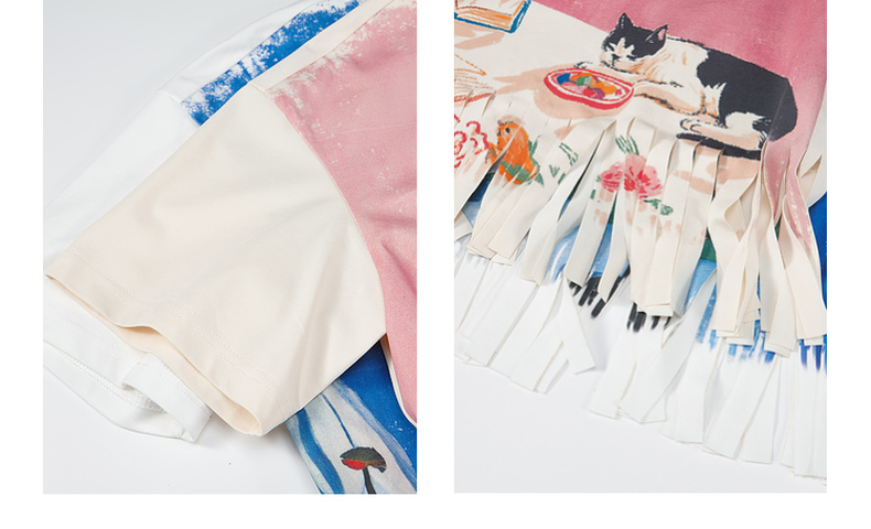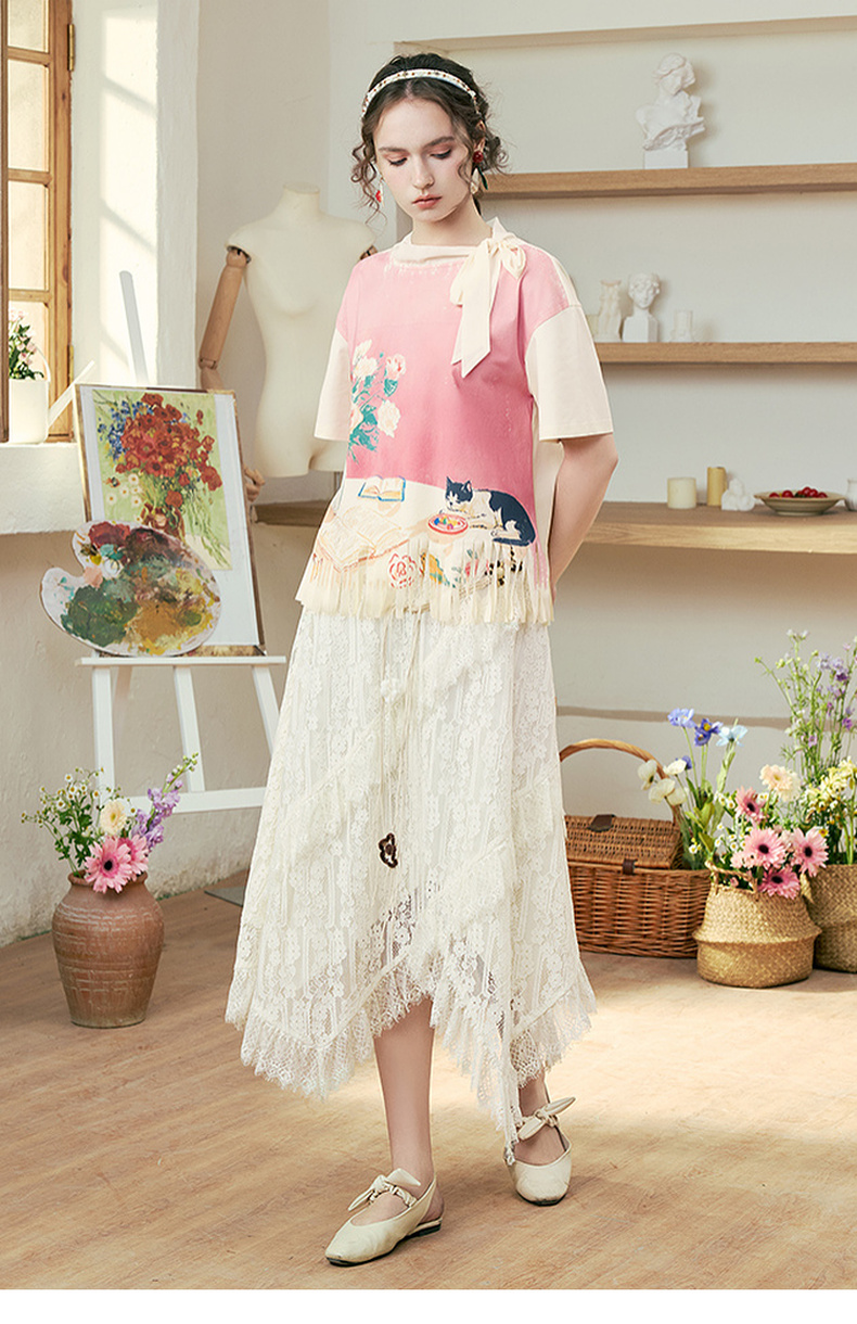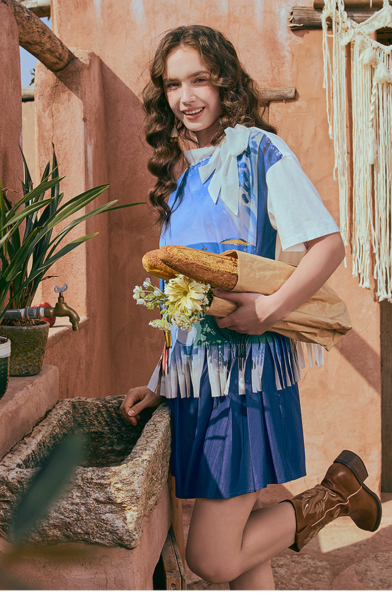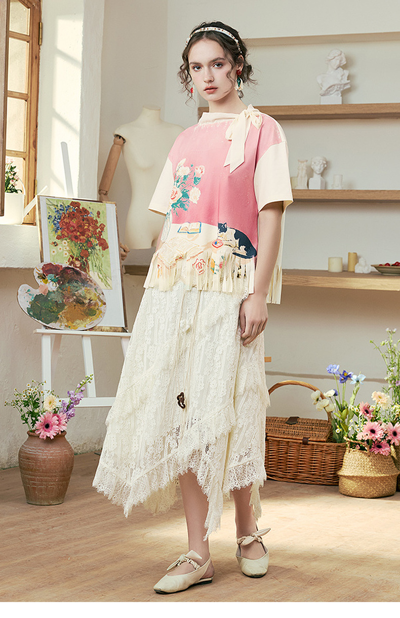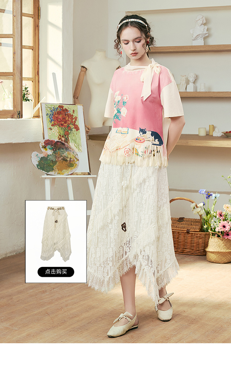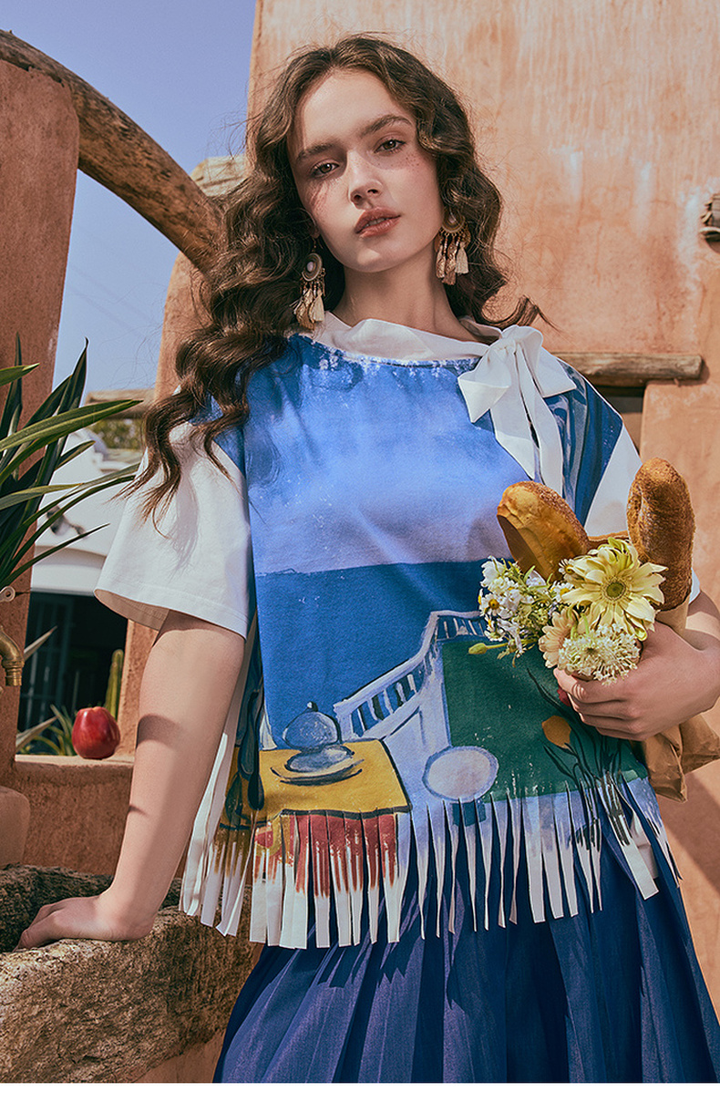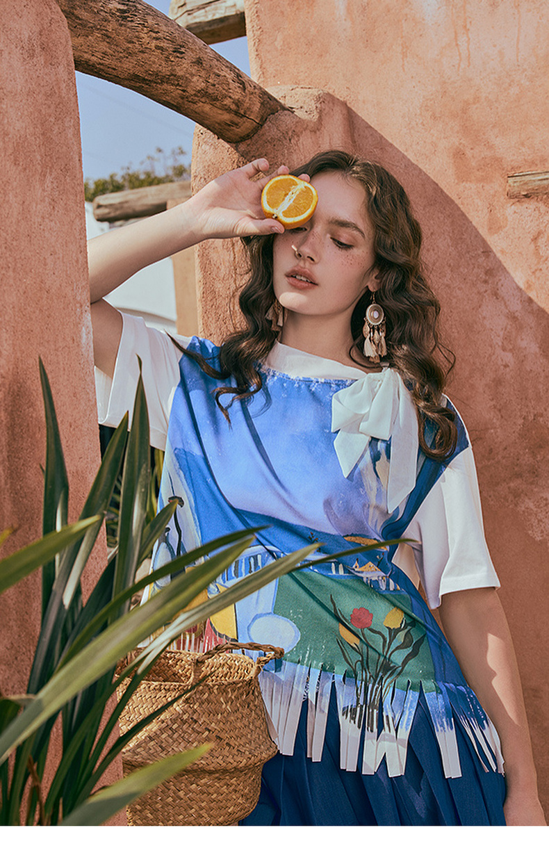 两三事萤海燃诗2025夏新款休闲流苏下摆绑带领印花短袖t恤女宽松