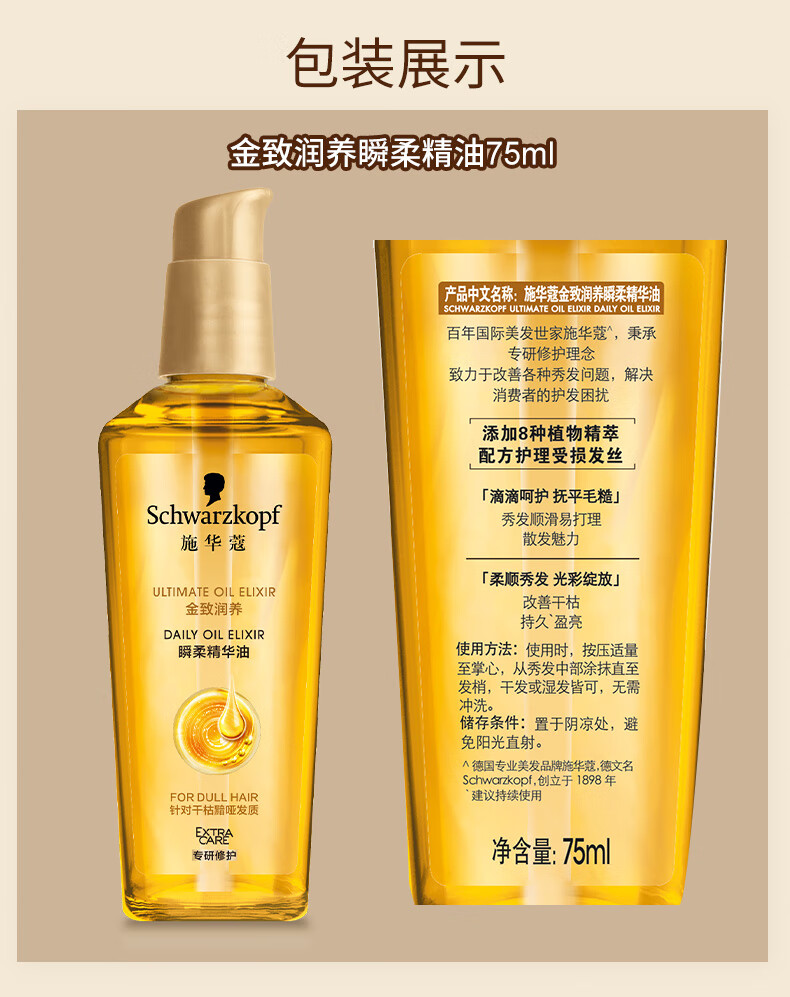 施华蔻(Schwarzkopf)金致润养瞬柔精油75ml(护发精油 免洗滋养 防毛躁 亮泽顺滑) 1356197