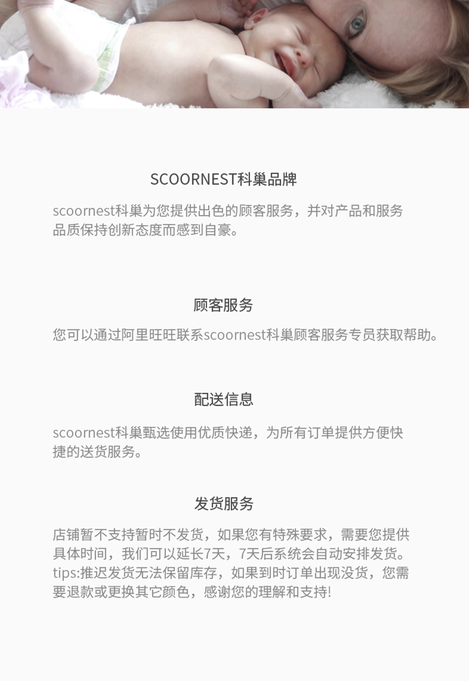 - Scoornest始终秉承给每一位宝宝送去科学的、关心的、创新的成长体验,通过提供商品和服务,使顾客形成守护、发展、巩固这种弥足珍贵的亲情的爱。