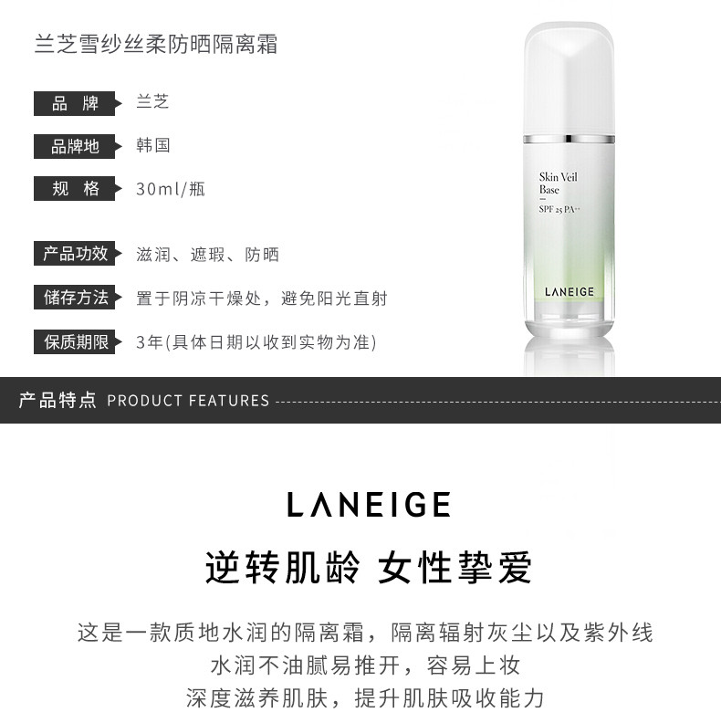 LANEIGE 兰芝 雪纱防晒隔离霜 绿色 30ml 韩国