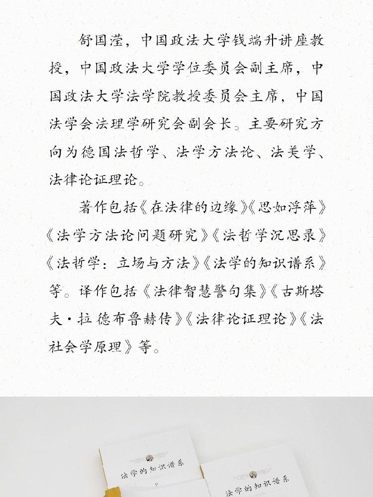 作者简介: 舒国滢,中国政法大学钱端升讲座教授,中国政法大学学位委员会副主席,中国政法大学法学院教授委员会主席,中国法学会法理学研究会副会长。主要研究方向为德国法哲学、法学方法论、法美学、法律论证理论。著作包括《在法律的边缘》《思如浮萍》《法学方法论问题研究》《法哲学沉思录》《法哲学:立场与方法》《法学的知识谱系》等。译作包括《法律智慧警句集》《古斯塔夫•拉德布鲁赫传》《法律论证理论》《法社会学原理》等。