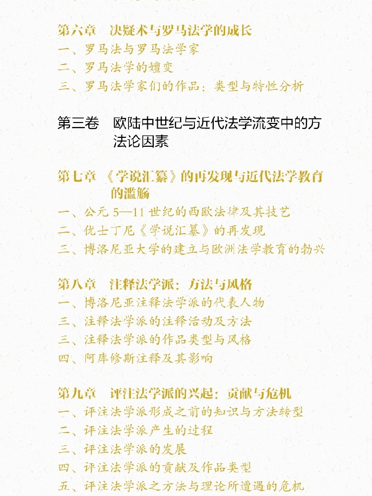 三、注释法学派的注释活动及方法 501三、注释法学派的作品类型与风格 529四、阿库修斯注释及其影响 547第九章 评注法学派的兴起:贡献与危机 554一、评注法学派形成之前的知识与方法转型 554二、评注法学派产生的过程 567三、评注法学派的发展 581四、评注法学派的贡献及作品类型 592五、评注法学派之方法与理论所遭遇的危机 608第十章 人文主义法学的方法论与知识谱系 621一、欧洲文艺复兴与人文主义法学 621二、人文主义法学的发展脉络 643三、人文主义法学的理论—方法特征 672