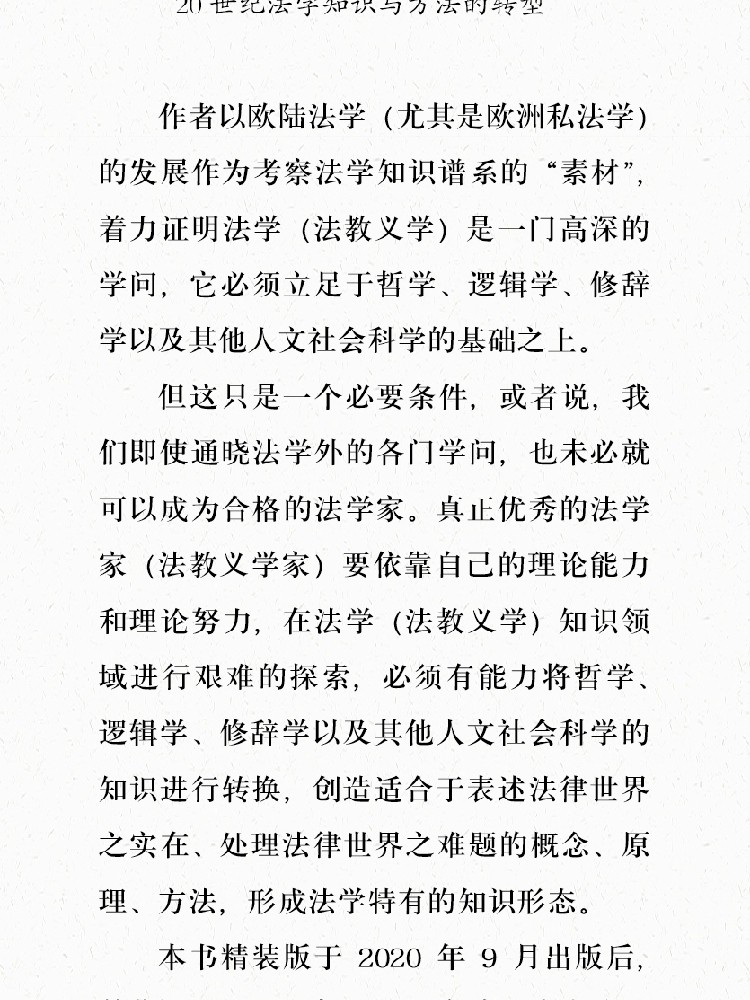 作者以欧陆法学(尤其是欧洲私法学)的发展作为考察法学知识谱系的“素材”,着力证明一点:法学(法教义学)是一门高深的学问,它必须立足于哲学、逻辑学、修辞学以及其他人文社会科学的基础之上。但这只是一个必要条件,或者说,我们即使通晓法学外的各门学问,也未必就可以成为合格的法学家。真正优秀的法学家(法教义学家)要依靠自己的理论能力和理论努力,在法学(法教义学)知识领域进行艰难的探索,必须有能力将哲学、逻辑学、修辞学以及其他人文社会科学的知识进行转换,创造适合于表述法律世界之实在、处理法律世界之难题的概念、原理、方法,形成法学特有的知识形态。