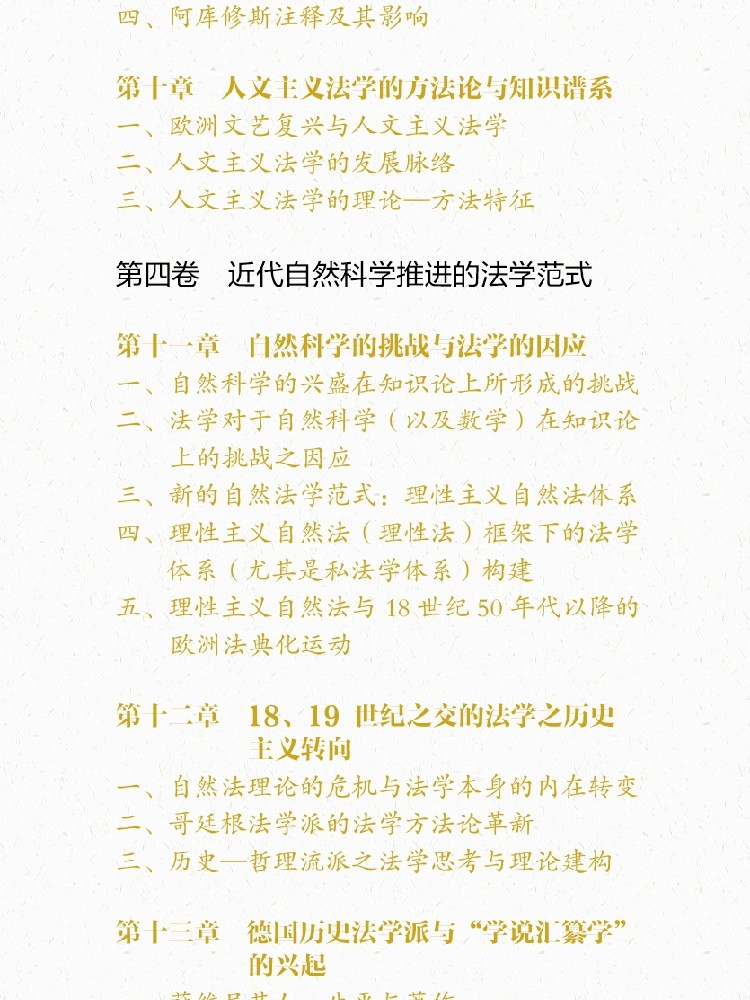 第四卷 近代自然科学推进的法学范式第十一章 自然科学的挑战与法学的因应 717一、自然科学的兴盛在知识论上所形成的挑战 718二、法学对于自然科学(以及数学)在知识论上的挑战之因应 729三、新的自然法学范式:理性主义自然法体系 745四、理性主义自然法(理性法)框架下的法学体系(尤其是私法学体系)构建 772五、理性主义自然法与 18 世纪 50 年代以降的欧洲法典化运动 793