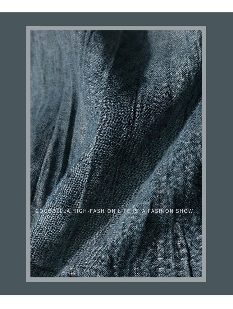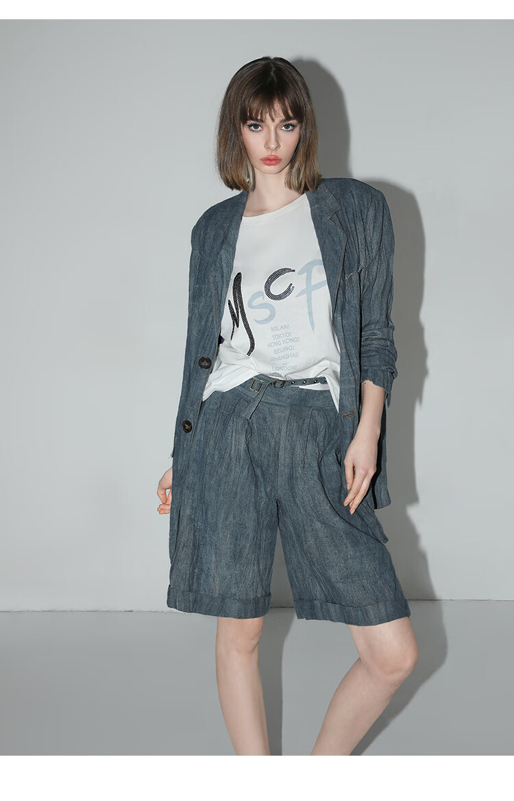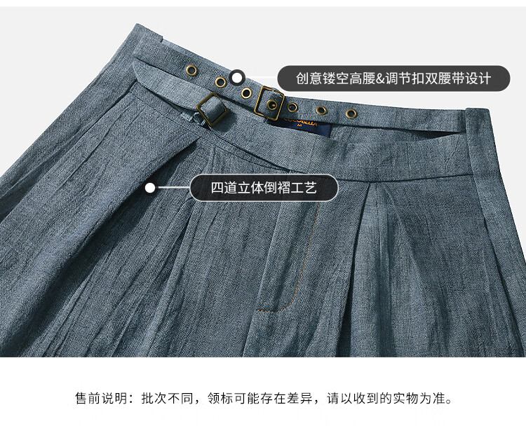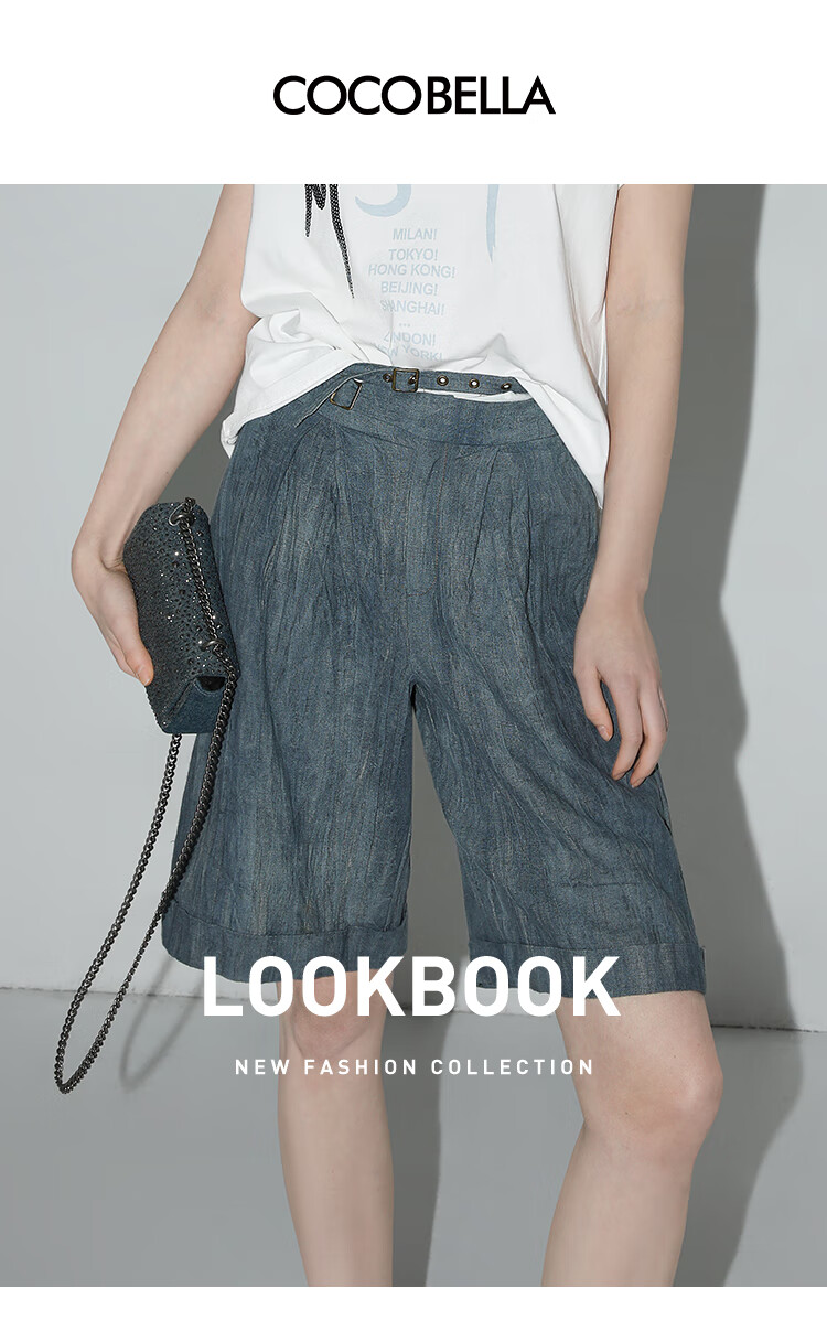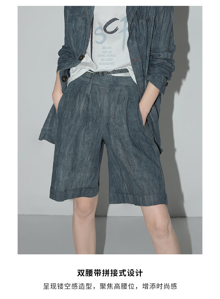 COCOBELLA砂洗炒色亚麻短裤设计感双腰带牛仔风打褶裤SO0002