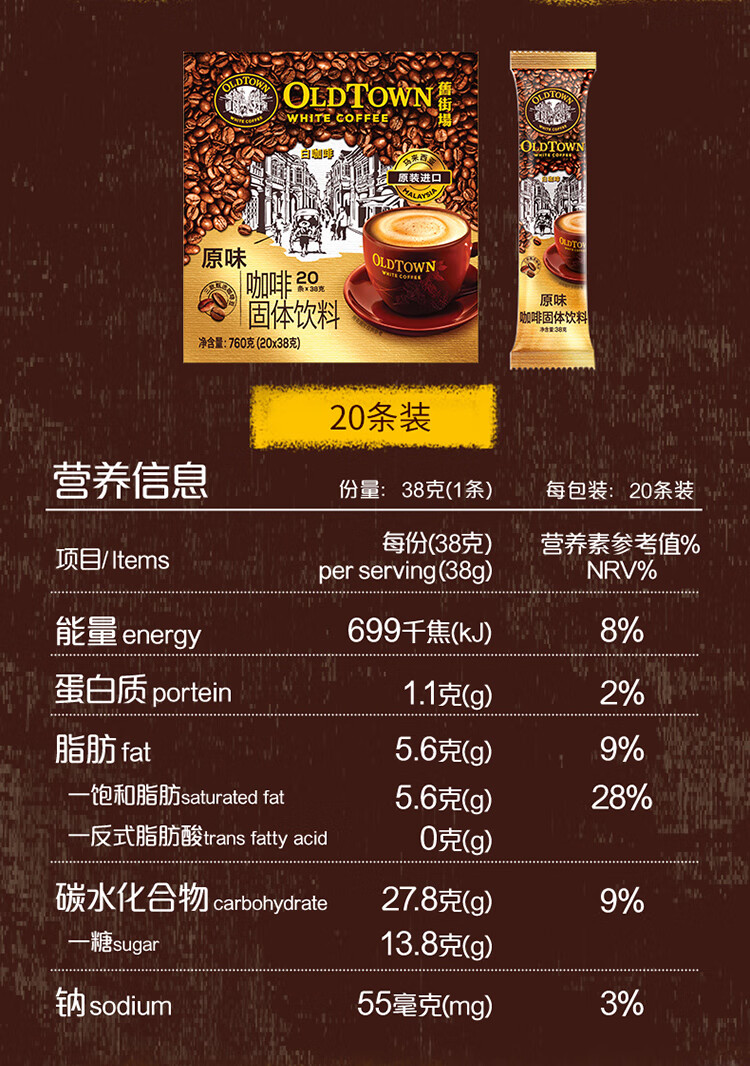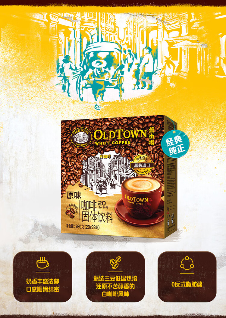 旧街场(OLDTOWN)速溶原味白咖啡马来西亚进口三合一老街咖啡粉38g*20条固体饮料 100039932028