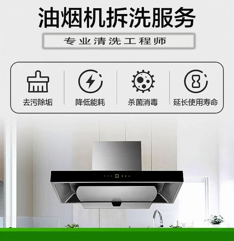 服务内容:包含机器内壁、附件清洗,外观抛光,墙面及灶台清洁,高温除油、去污、除菌