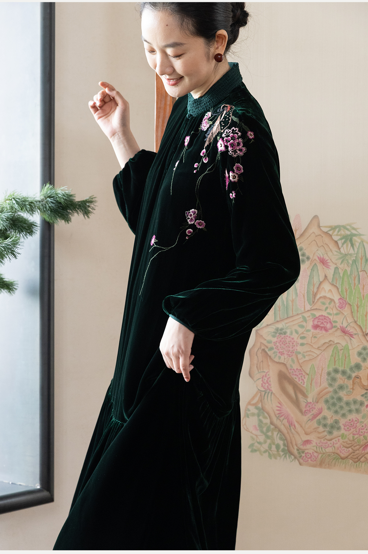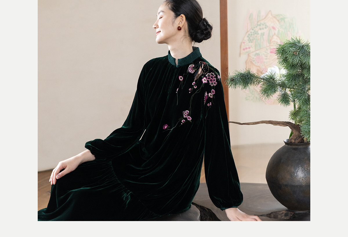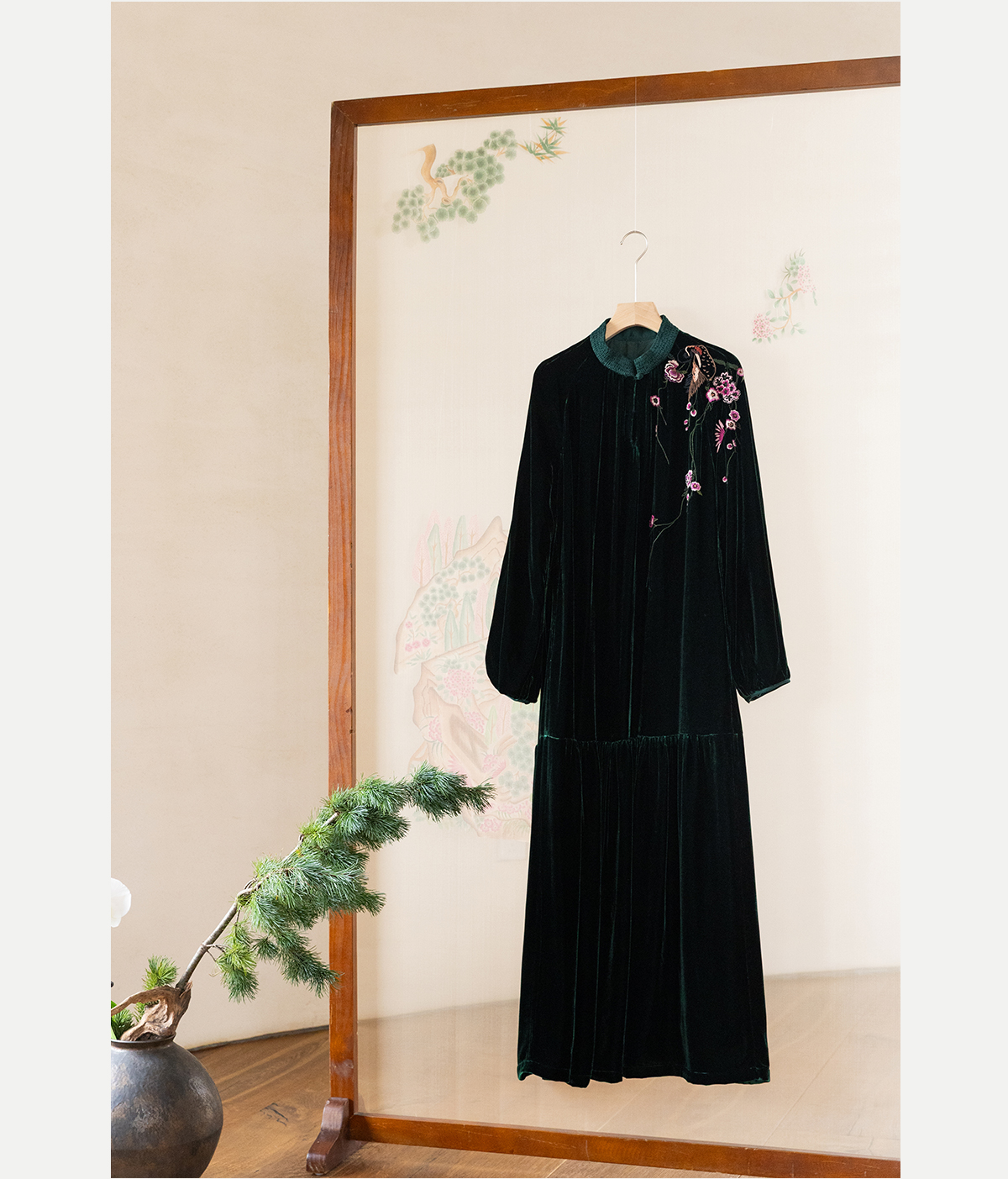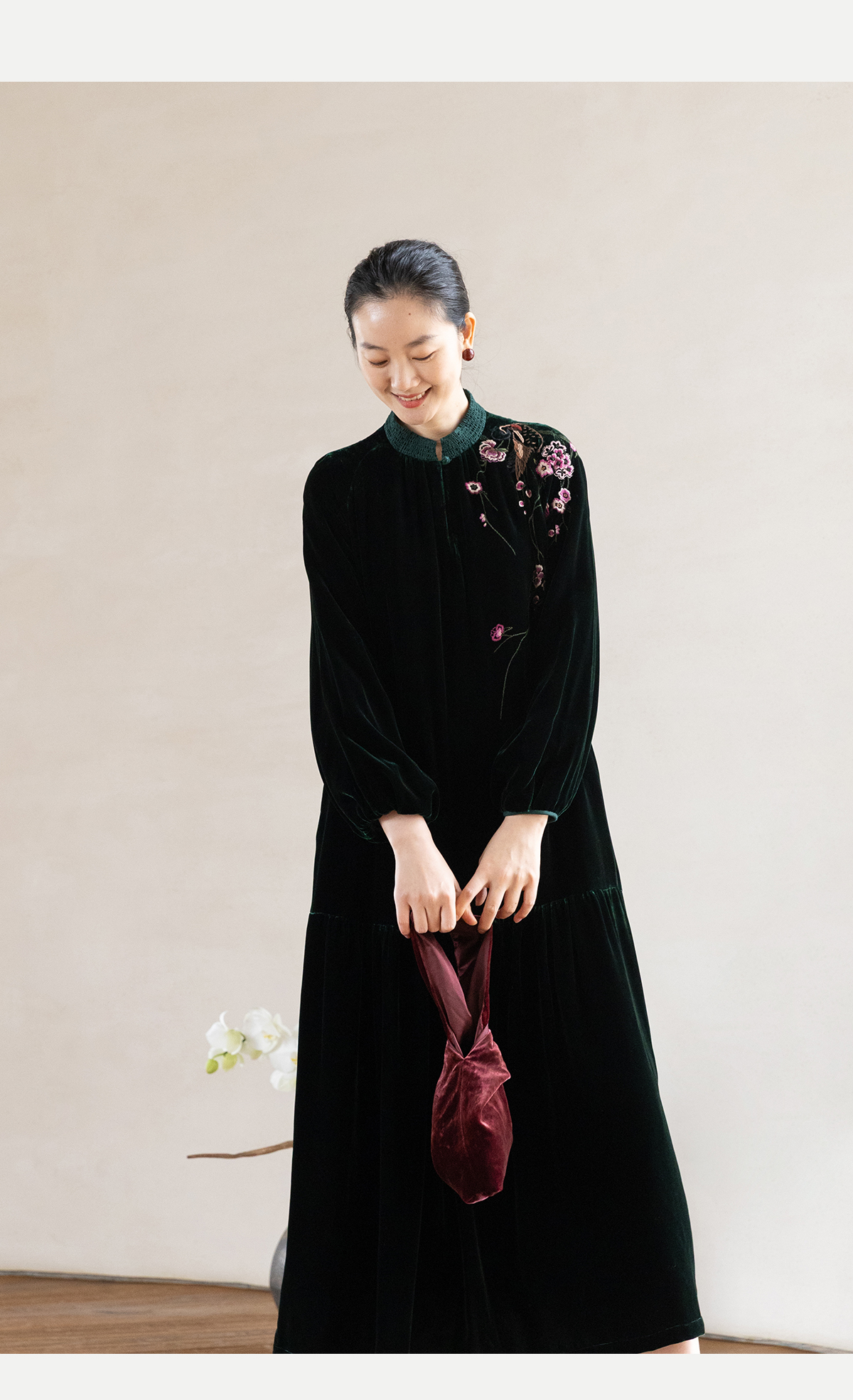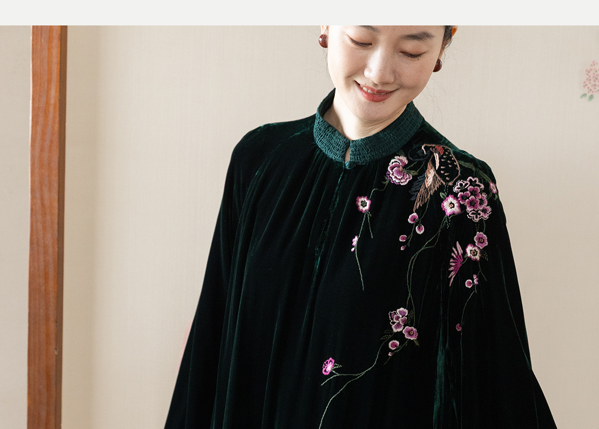 牧衣游原创 丝绒手工刺绣连衣裙女新款宽松绿色东方气质长裙 洛泱