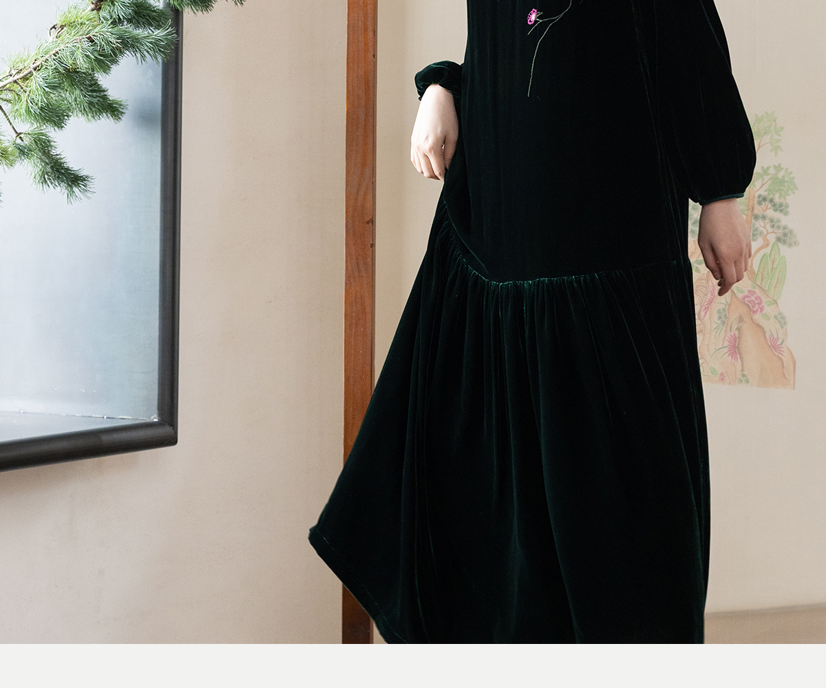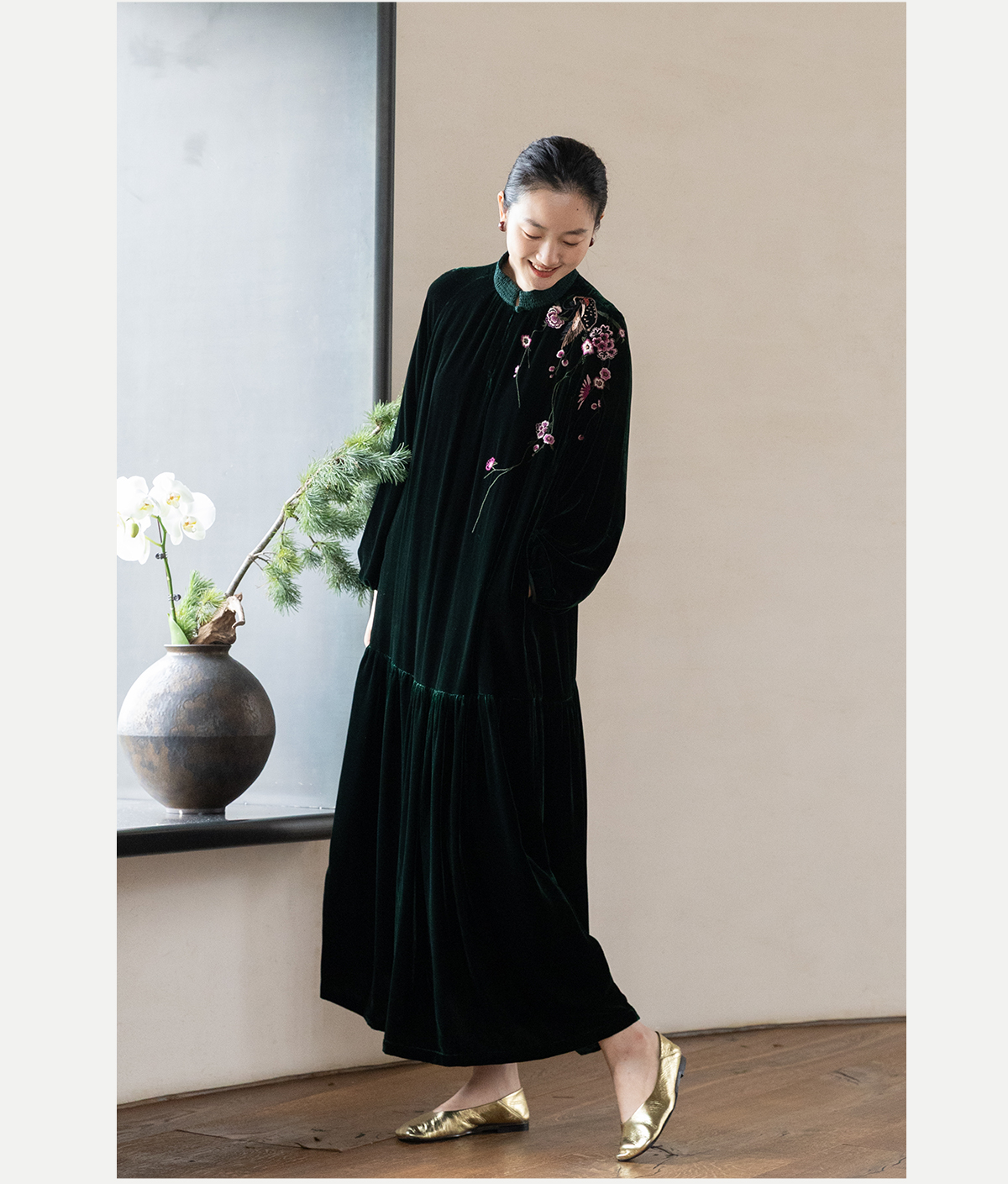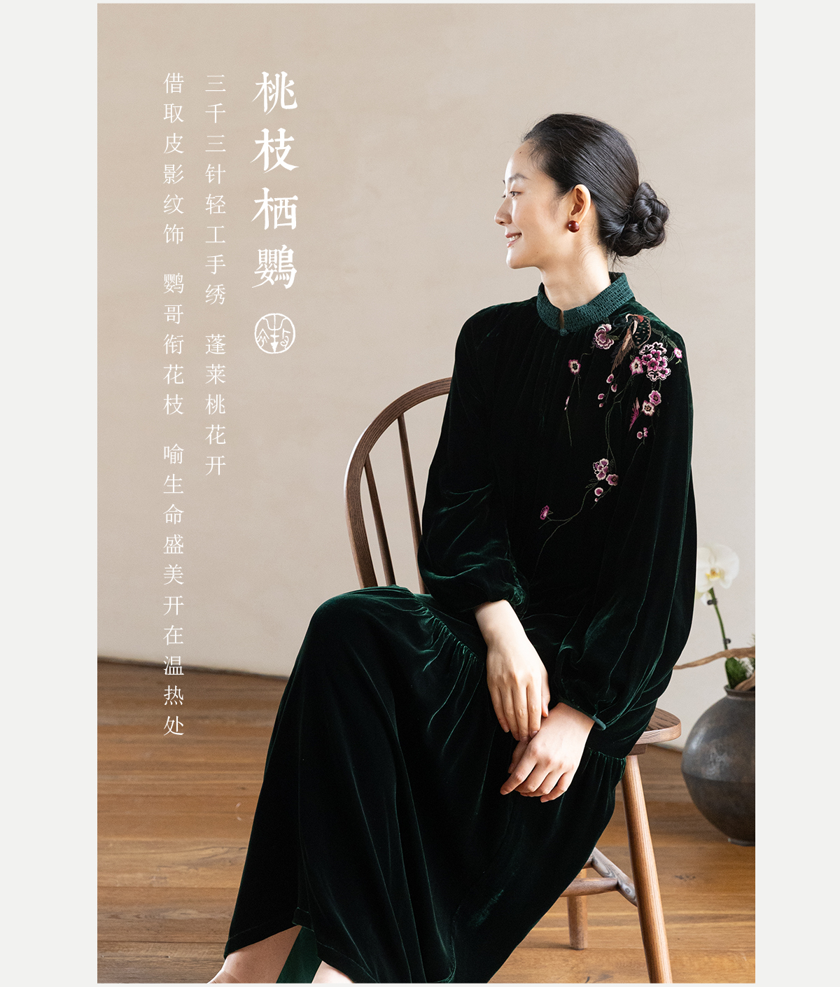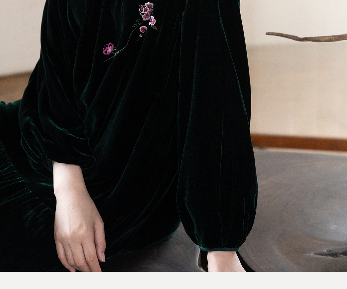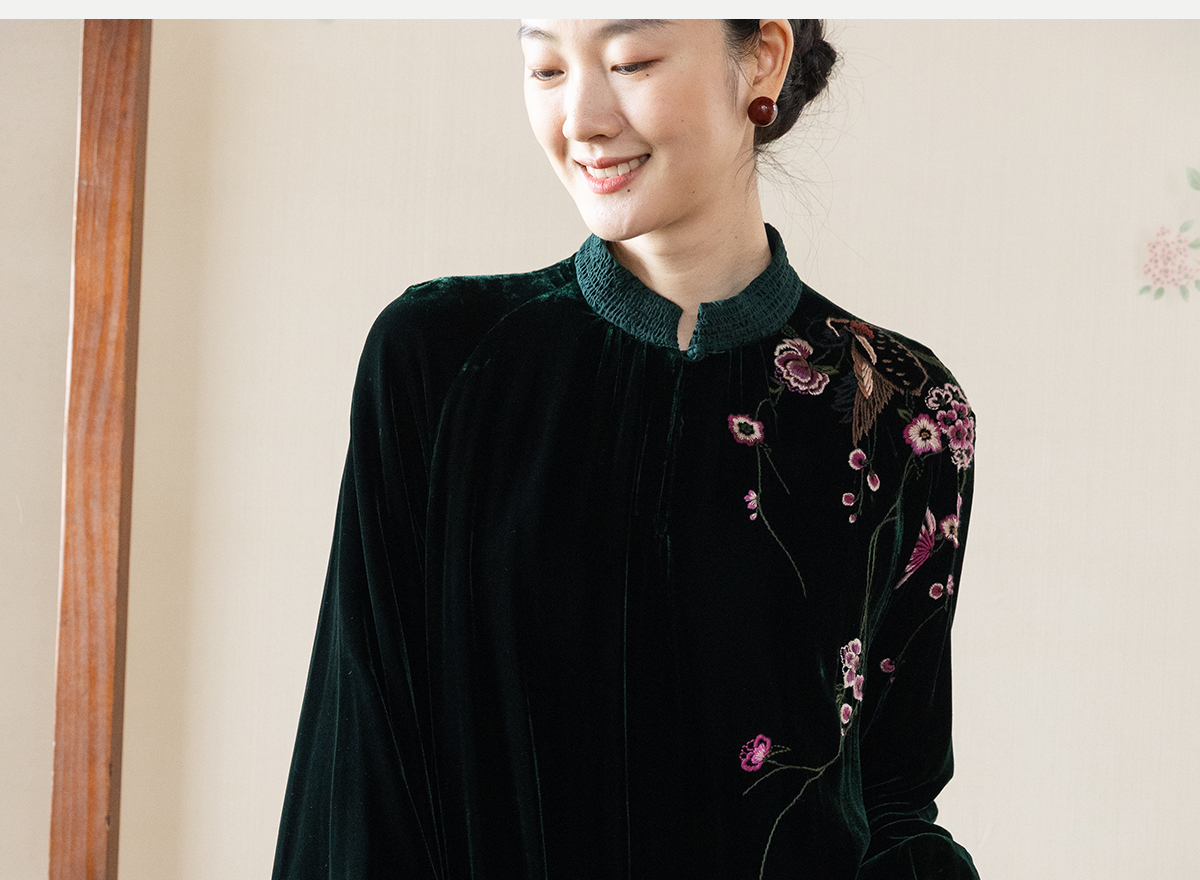牧衣游原创 丝绒手工刺绣连衣裙女新款宽松绿色东方气质长裙 洛泱