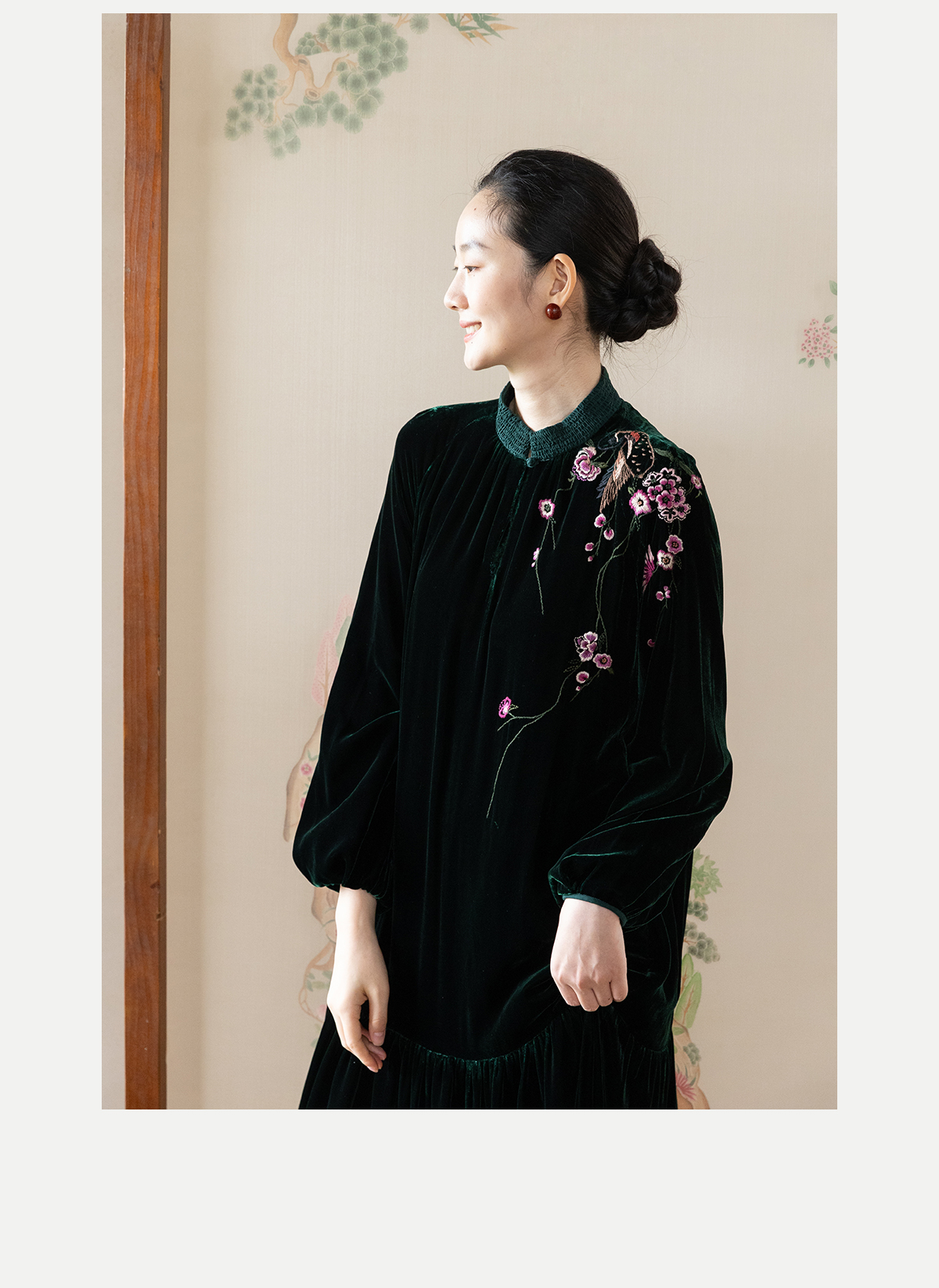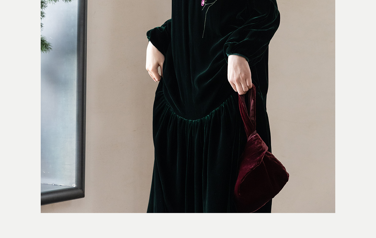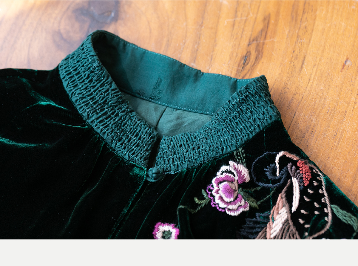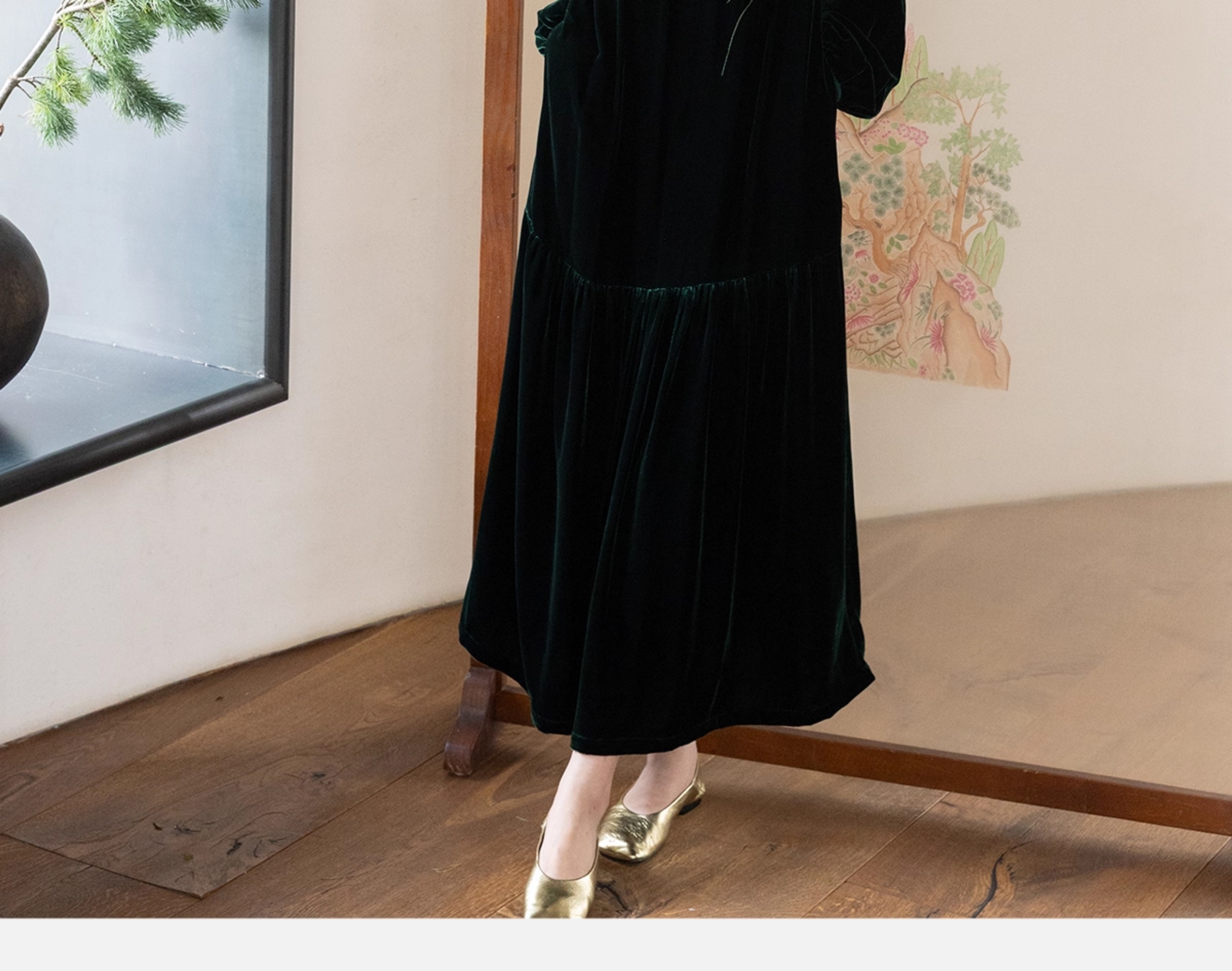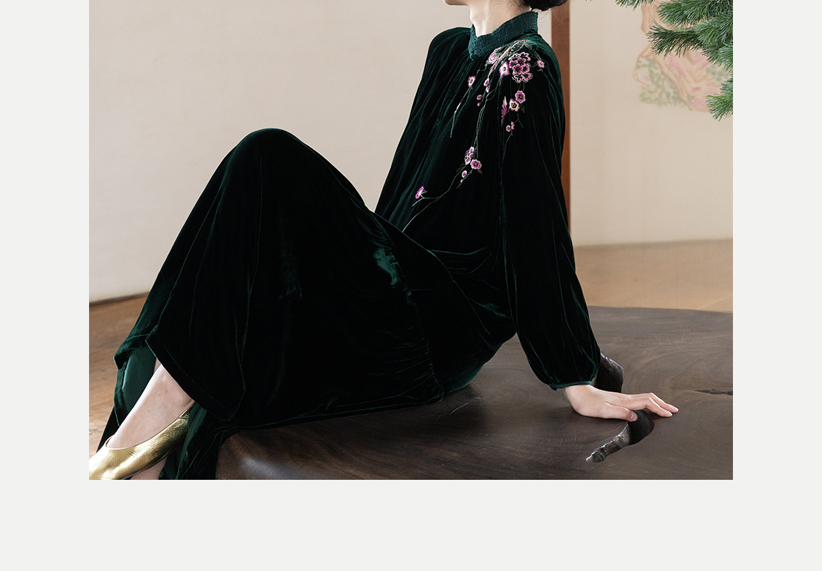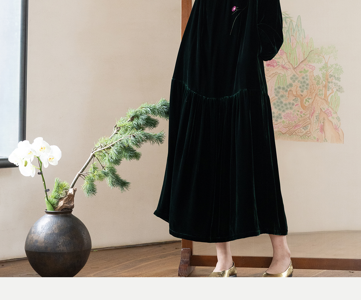 牧衣游原创 丝绒手工刺绣连衣裙女新款宽松绿色东方气质长裙 洛泱