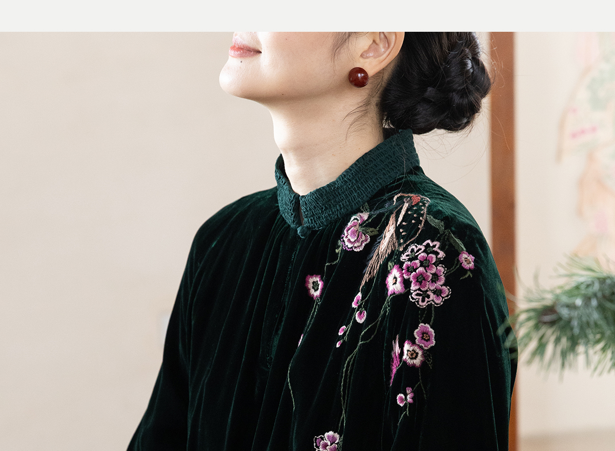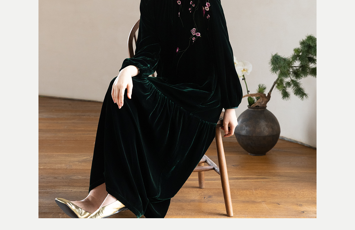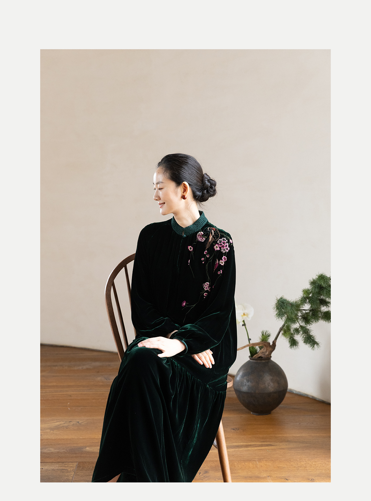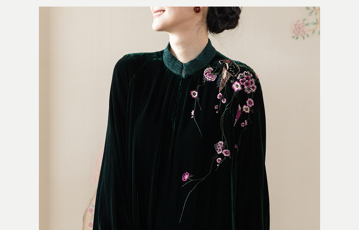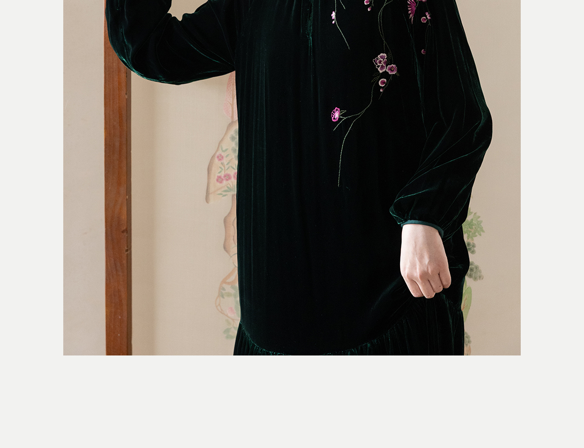 牧衣游原创 丝绒手工刺绣连衣裙女新款宽松绿色东方气质长裙 洛泱