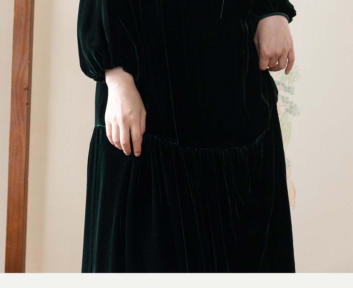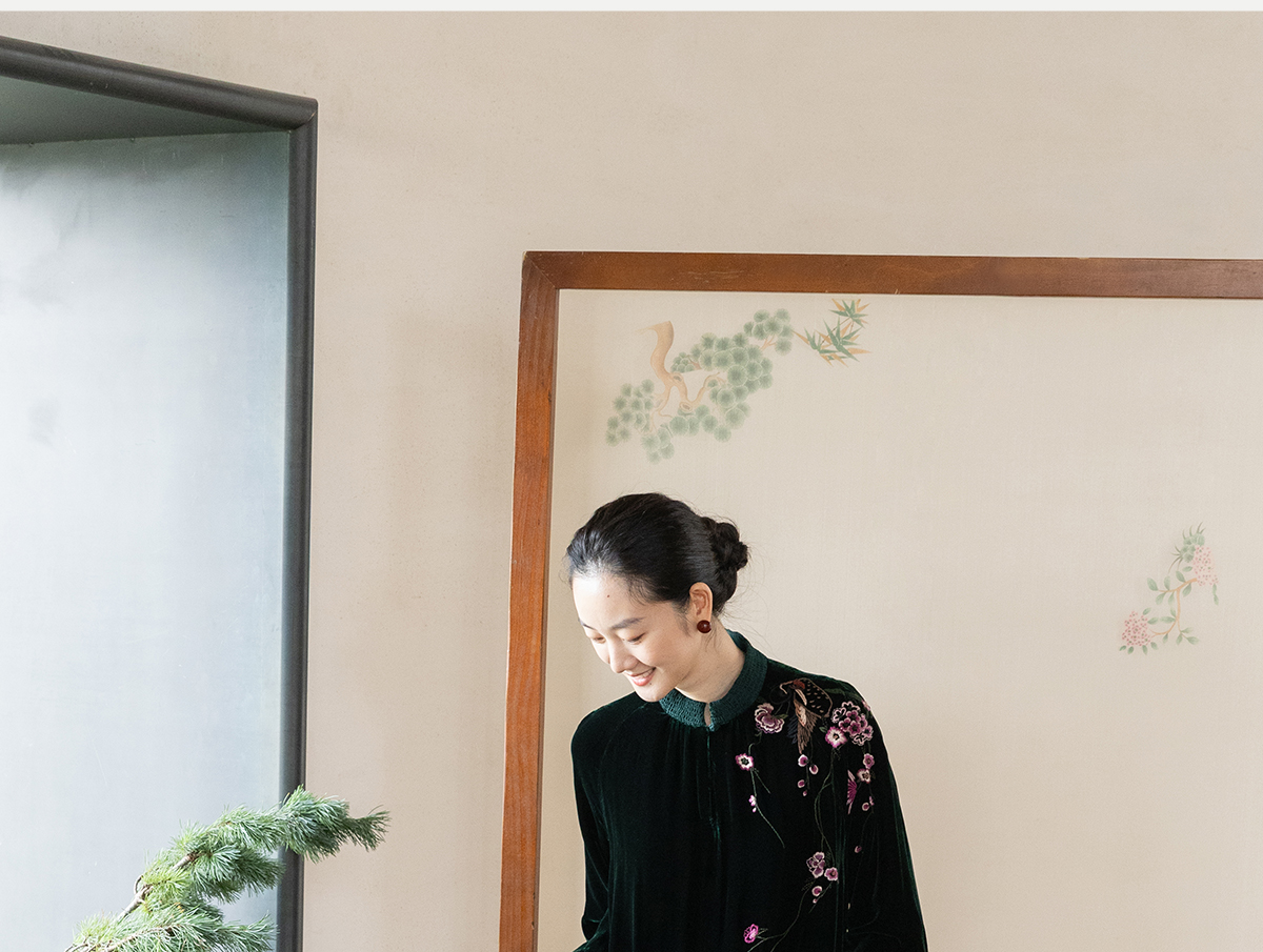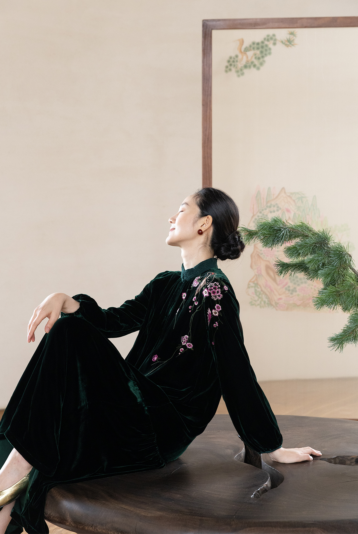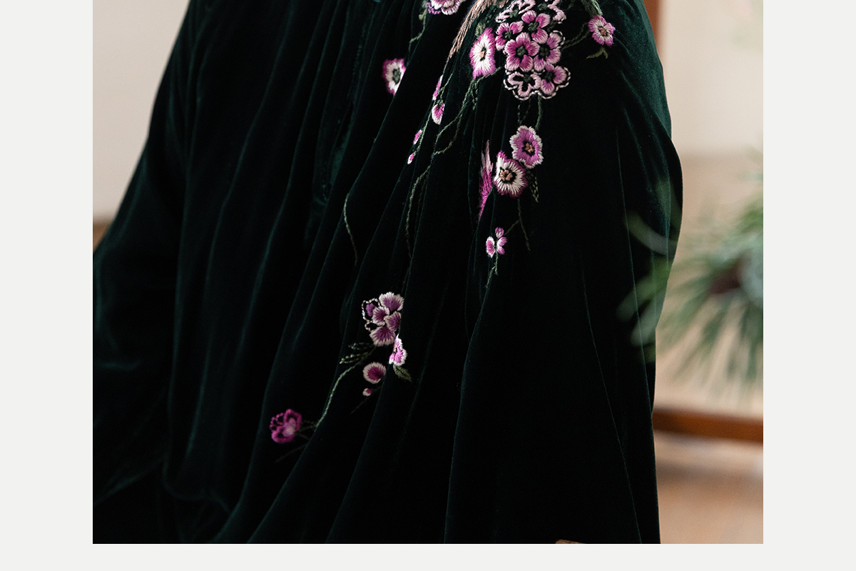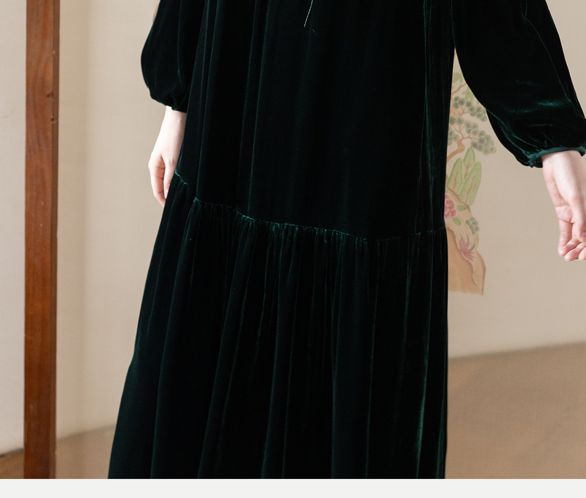 牧衣游原创 丝绒手工刺绣连衣裙女新款宽松绿色东方气质长裙 洛泱