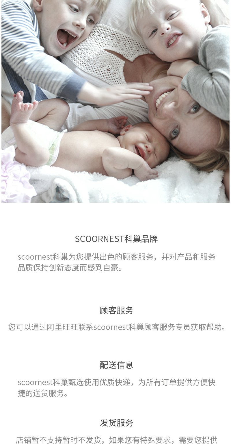 - Scoornest始终秉承给每一位宝宝送去科学的、关心的、创新的成长体验,通过提供商品和服务,使顾客形成守护、发展、巩固这种弥足珍贵的亲情的爱。