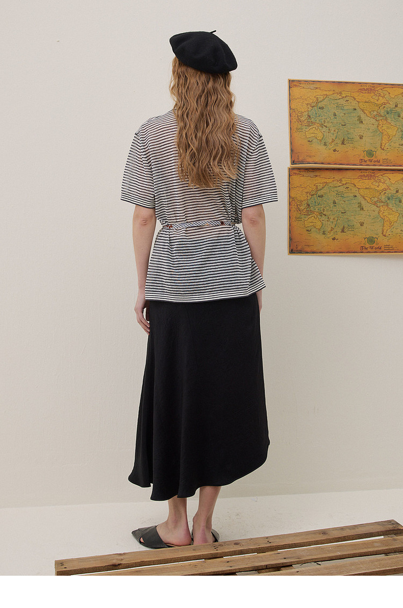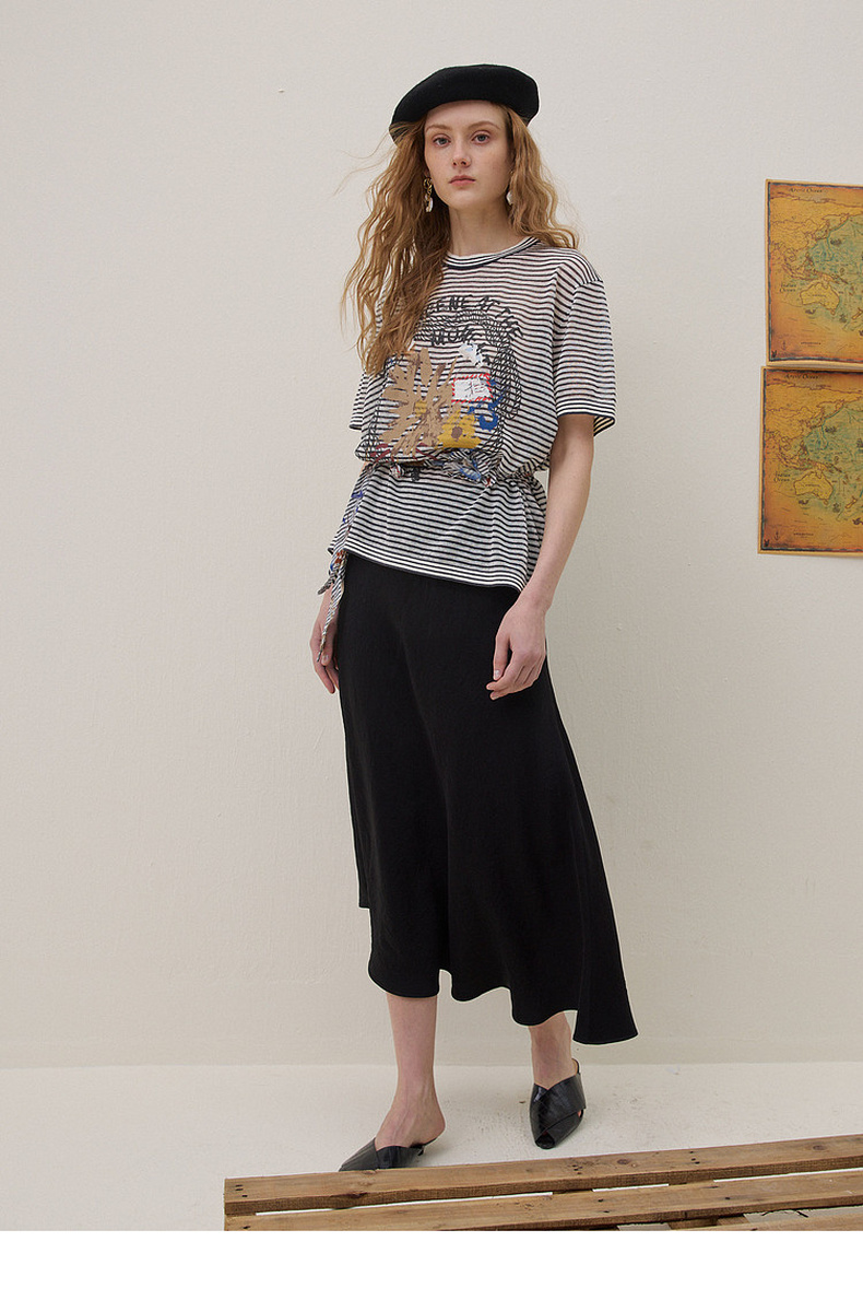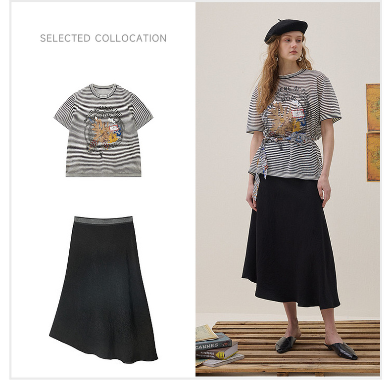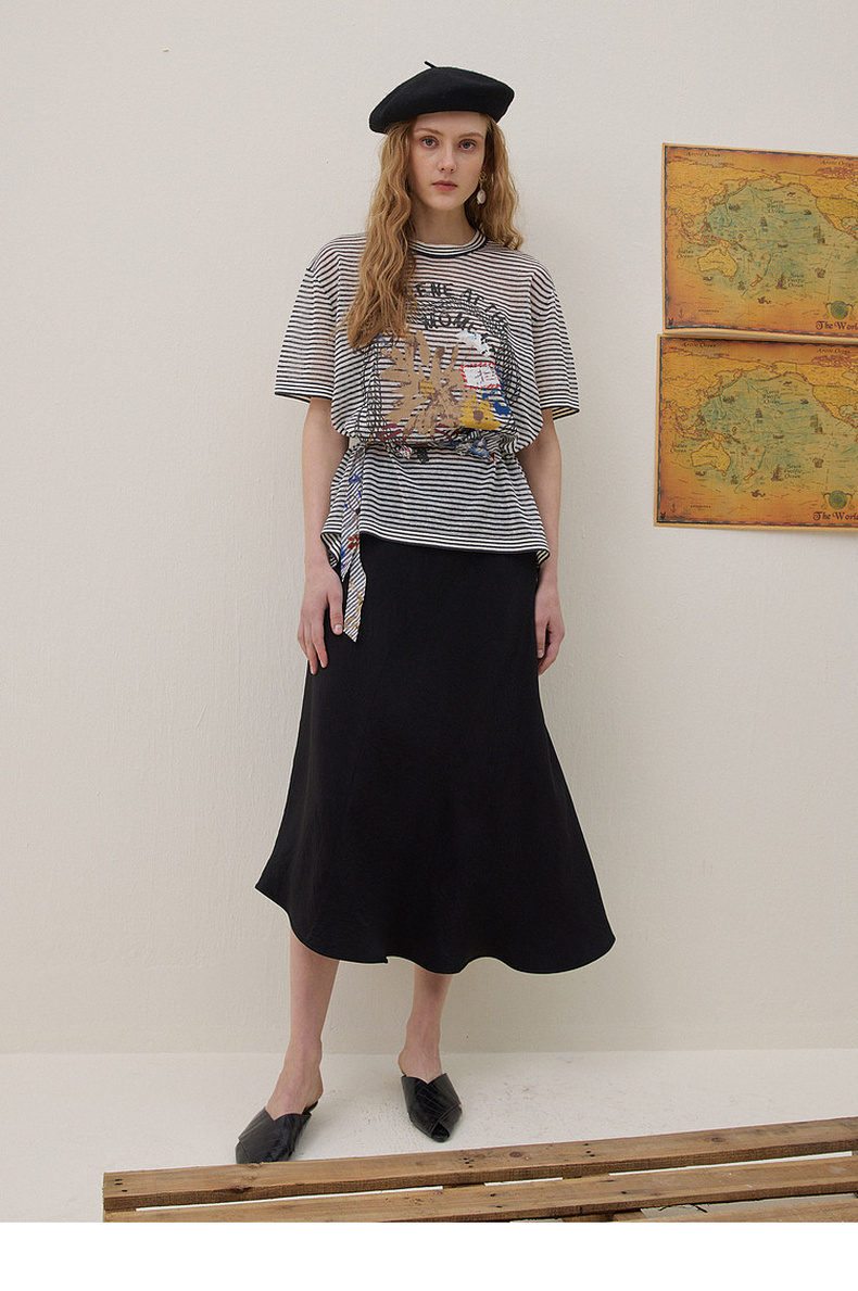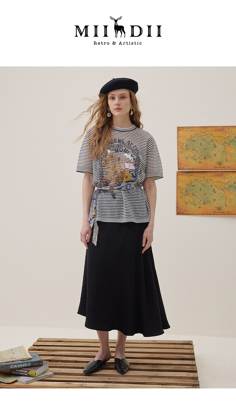 谜底斜条纹T恤短袖2026夏季新品棉麻质感趣味刺绣修身女262MT0614