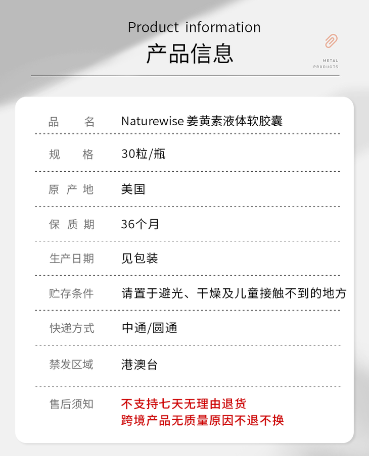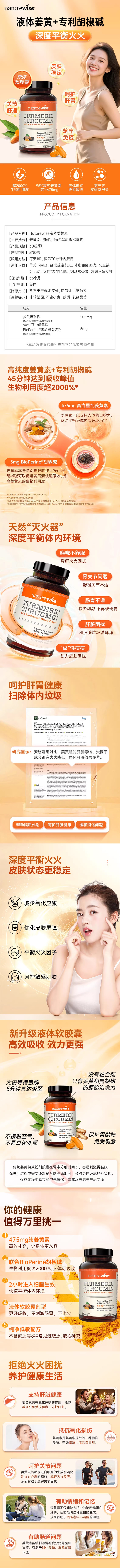 【Naturewise/自然薇萃姜黄素液体软胶囊 】高浓度姜黄提取 特添加BioPerine黑胡椒提取物 增强吸收率 30粒/瓶
