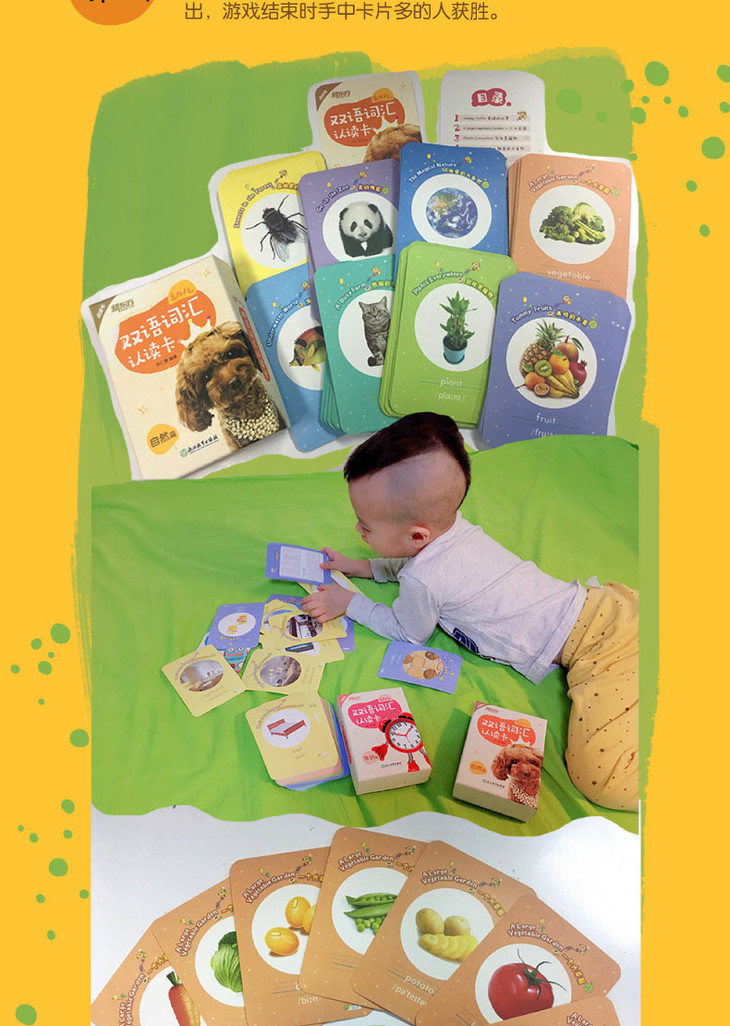 幼儿双语词汇认读卡:自然篇 选取大自然中常见的事物及现象,为小朋友们展示了大自然的神奇奥秘,让小朋友们轻而易举地与真实世界产生联想,图片之外还配有相应的中英双语词汇及句型,不光能识图,还能认字学发音。