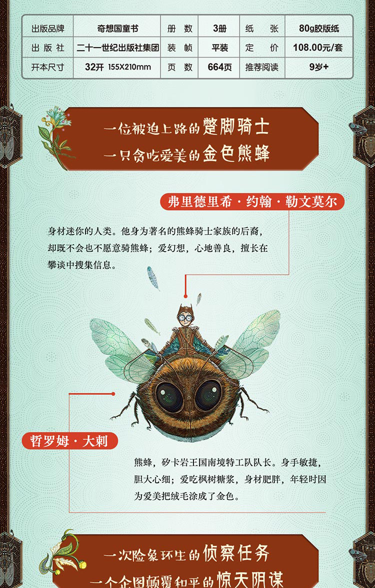 弗里德里希·约翰·勒文莫尔身为著名的熊蜂骑士家族的后裔,却既不会也不愿意骑熊蜂。一天,他被一只会说话的金色熊蜂大刺诱骗,来到矽卡岩王国的南境首都白崖。南境女王眉兰交给了弗里德里希和金色熊蜂大刺一个任务,要他们调查预言中的边境危机。一场险象环生的冒险就此拉开了序幕……