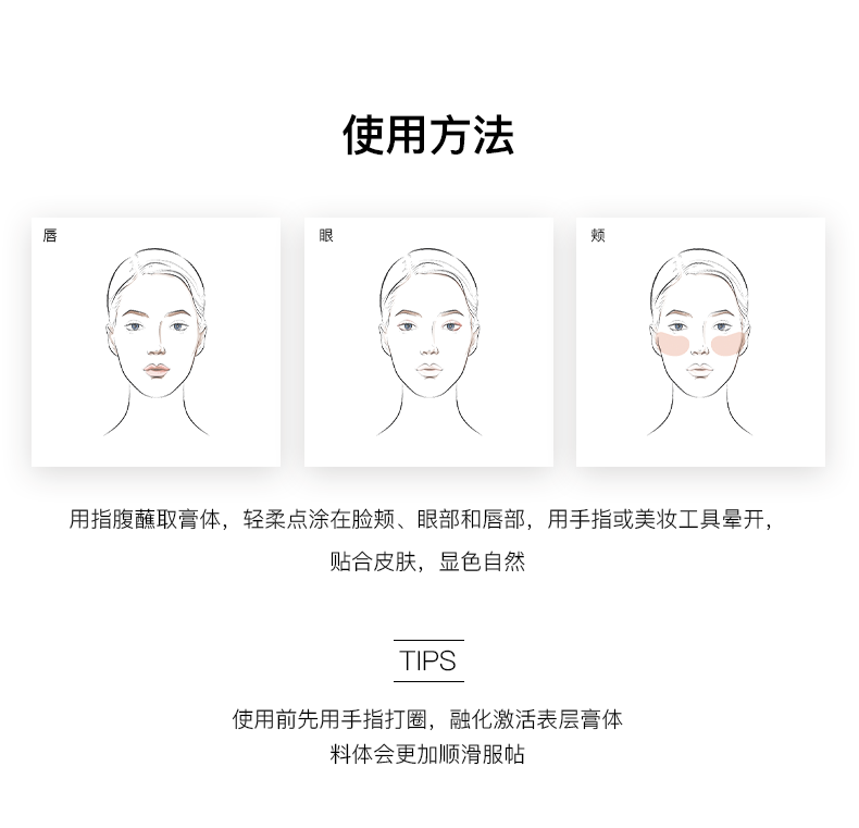 使用方法:⚠用指腹蘸取膏体,轻柔点涂在脸颊、眼部和唇部,用手指或美妆工具晕开,贴合皮肤,显色自然