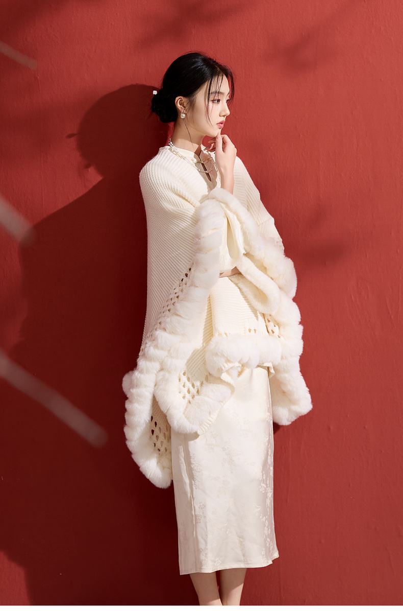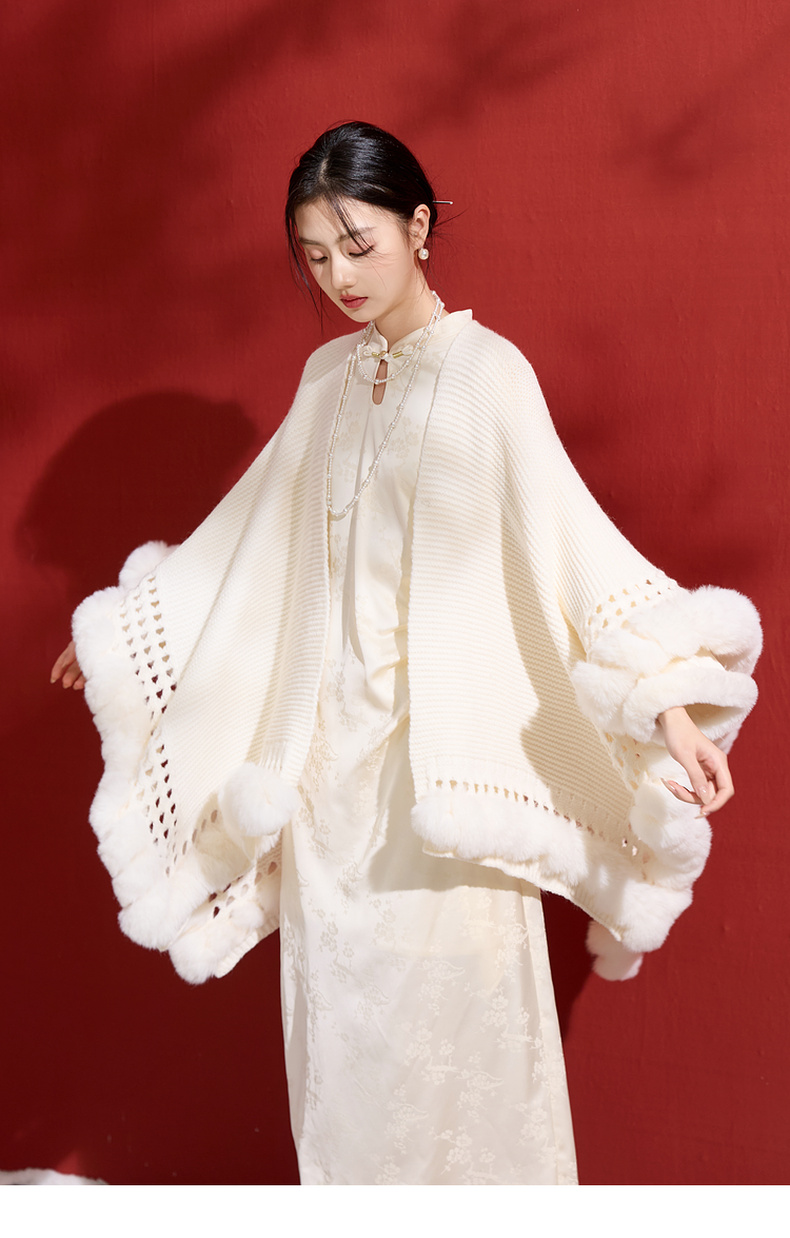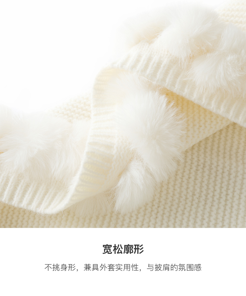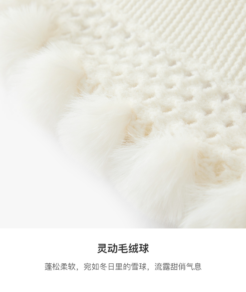 三彩2025新款国风毛绒球外搭针织披肩保暖镂空女氛围感慵懒松弛