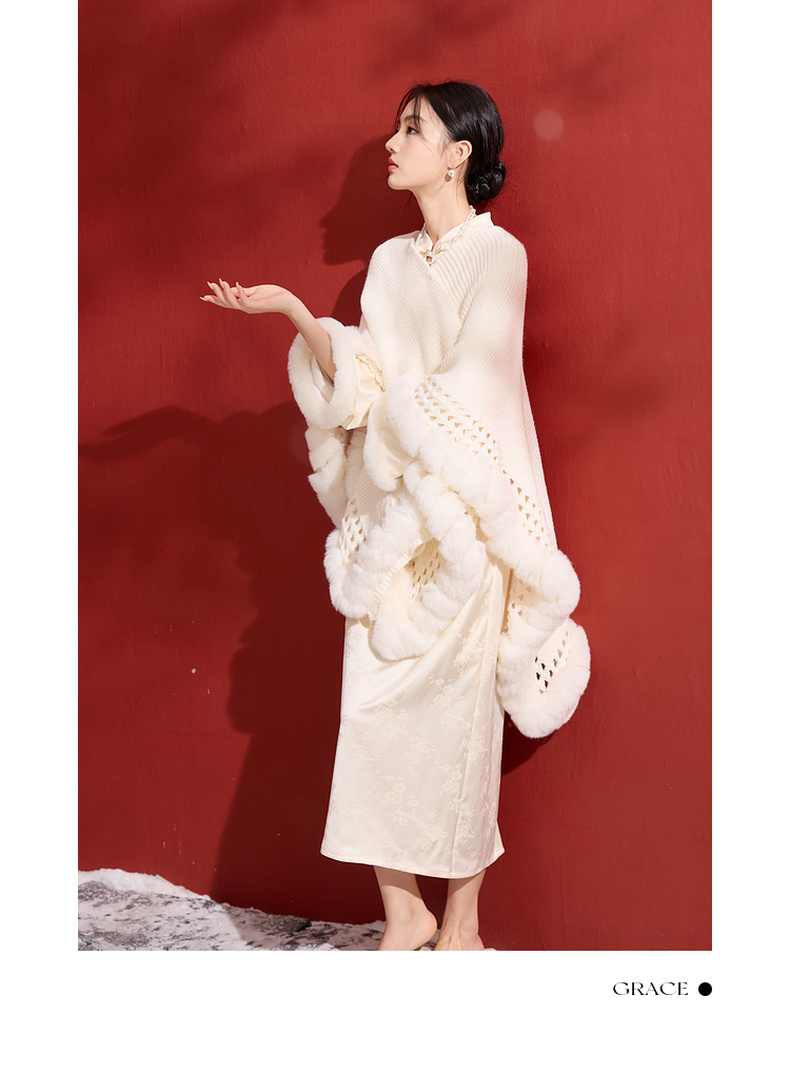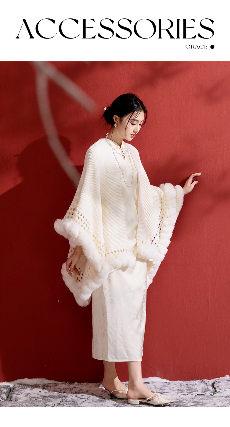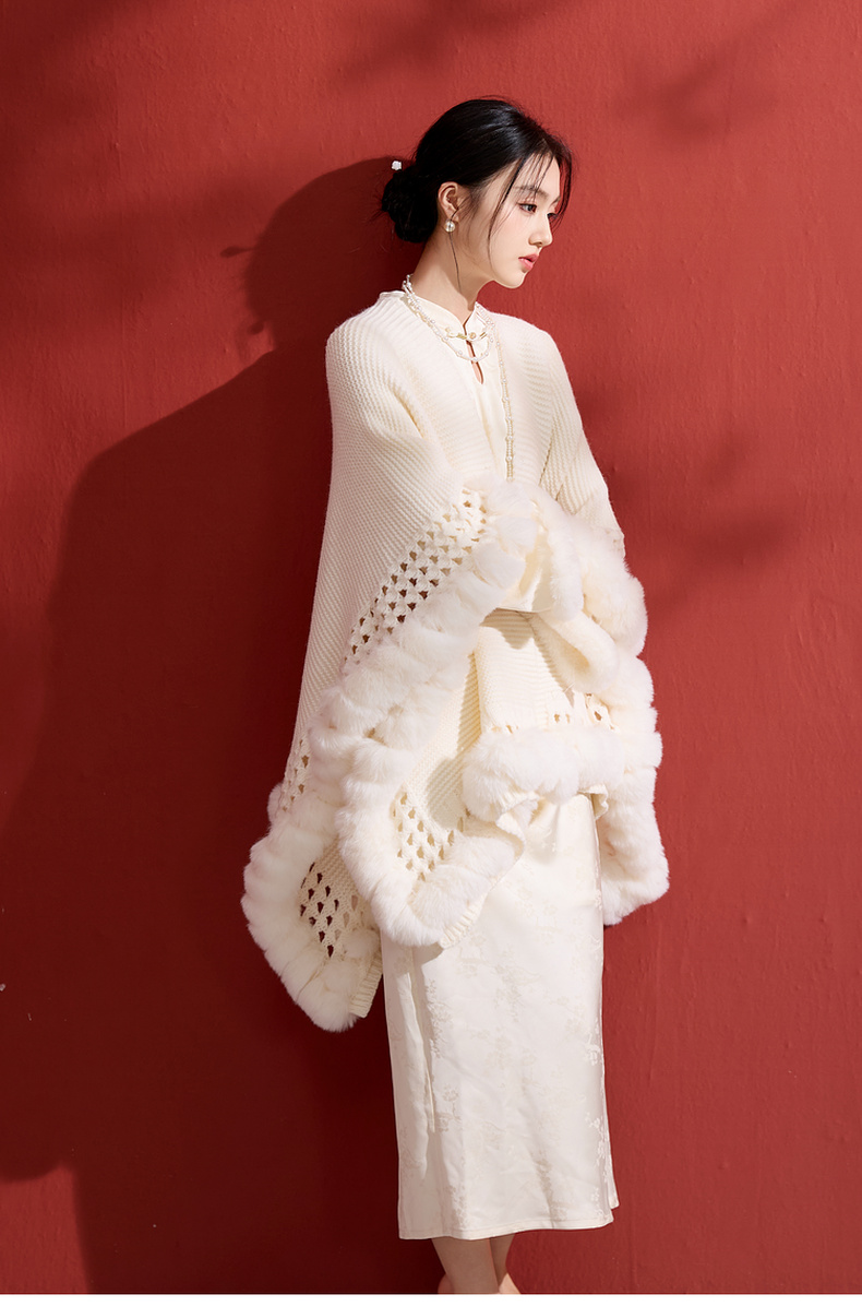 三彩2025新款国风毛绒球外搭针织披肩保暖镂空女氛围感慵懒松弛