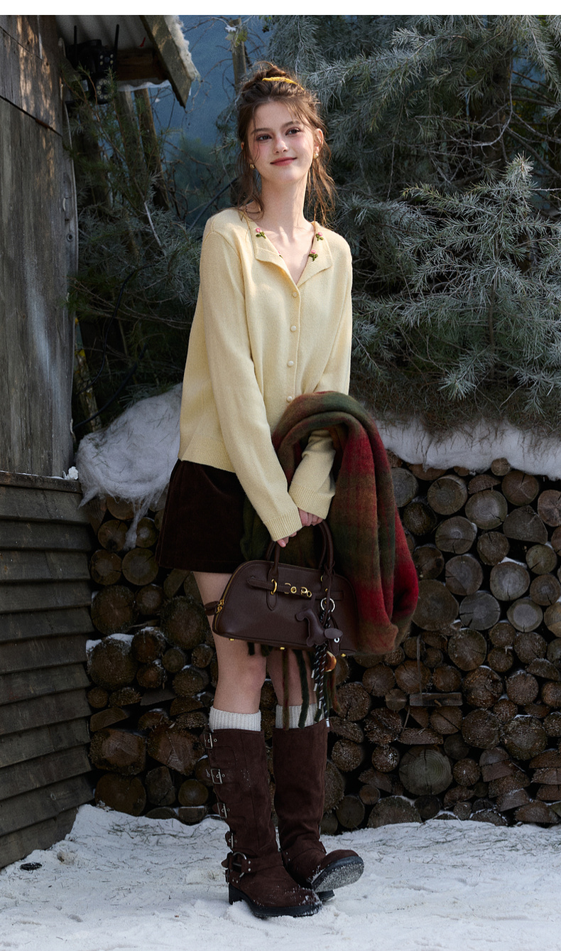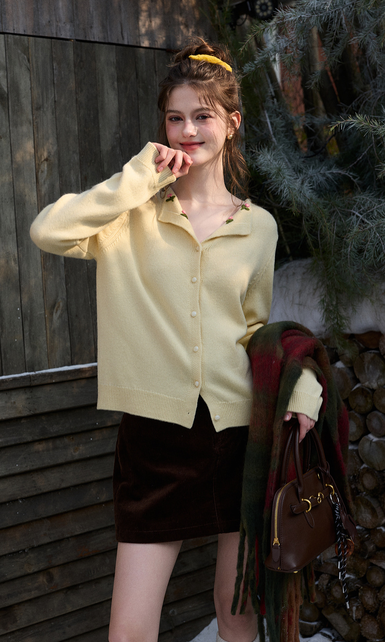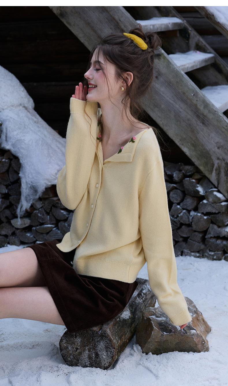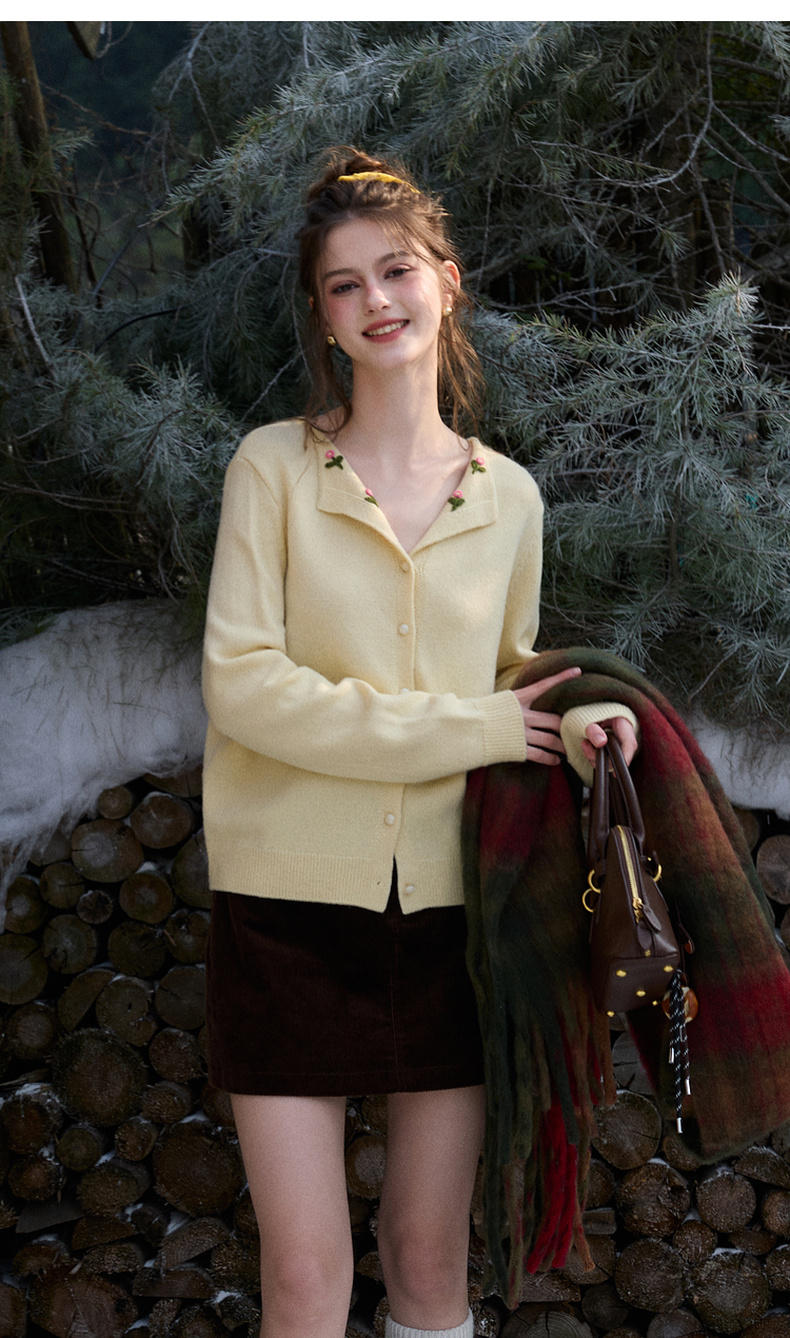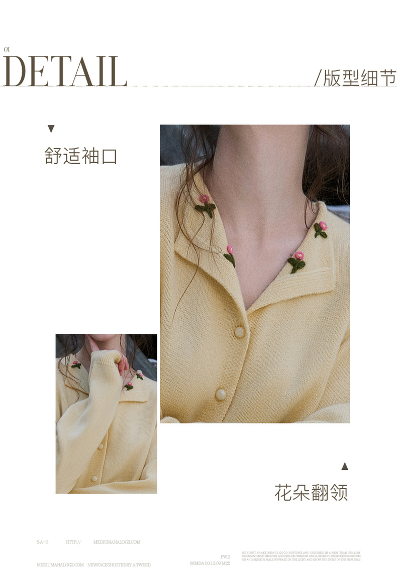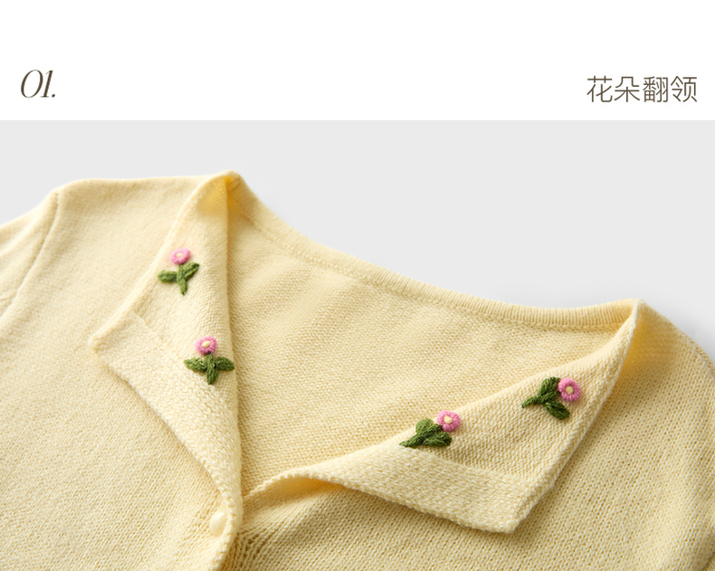 三彩2026春季新款花朵翻领针织衫毛衫简约长袖开衫外套休闲M