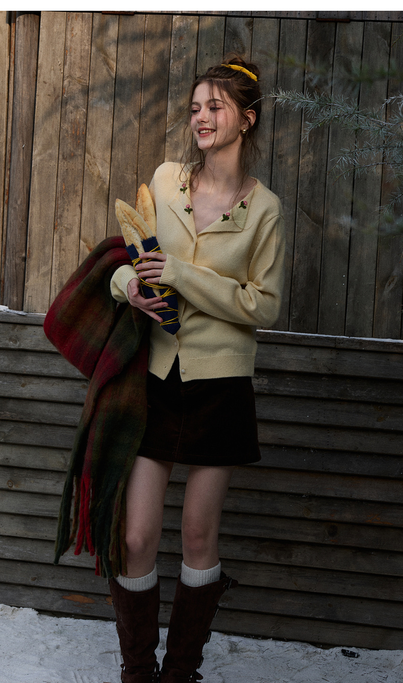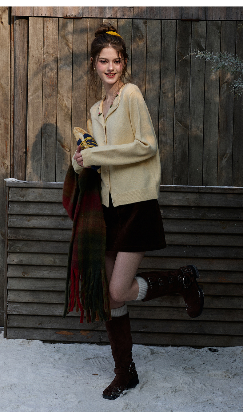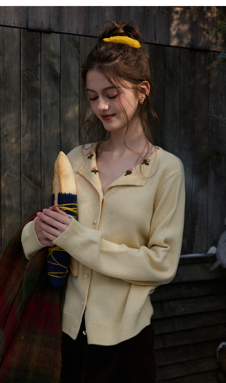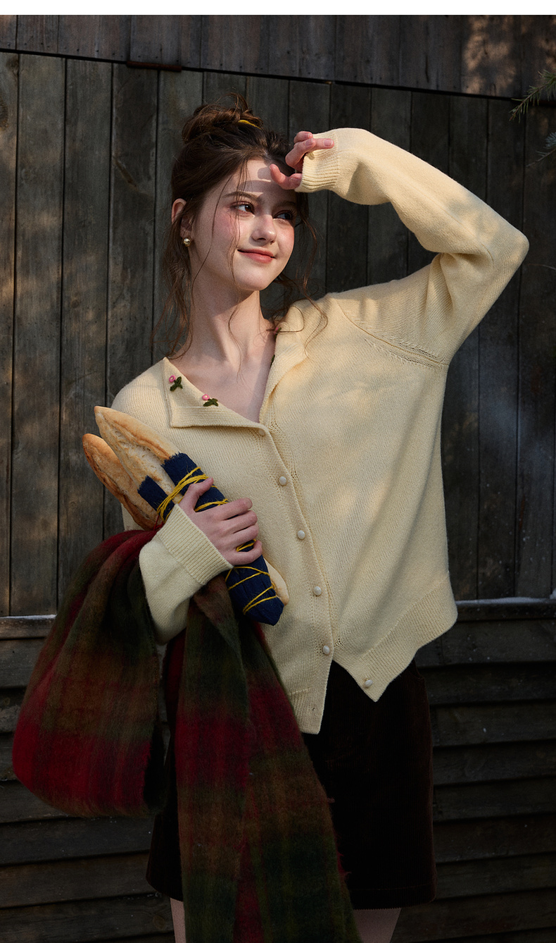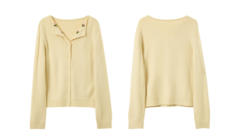 三彩2026春季新款花朵翻领针织衫毛衫简约长袖开衫外套休闲M