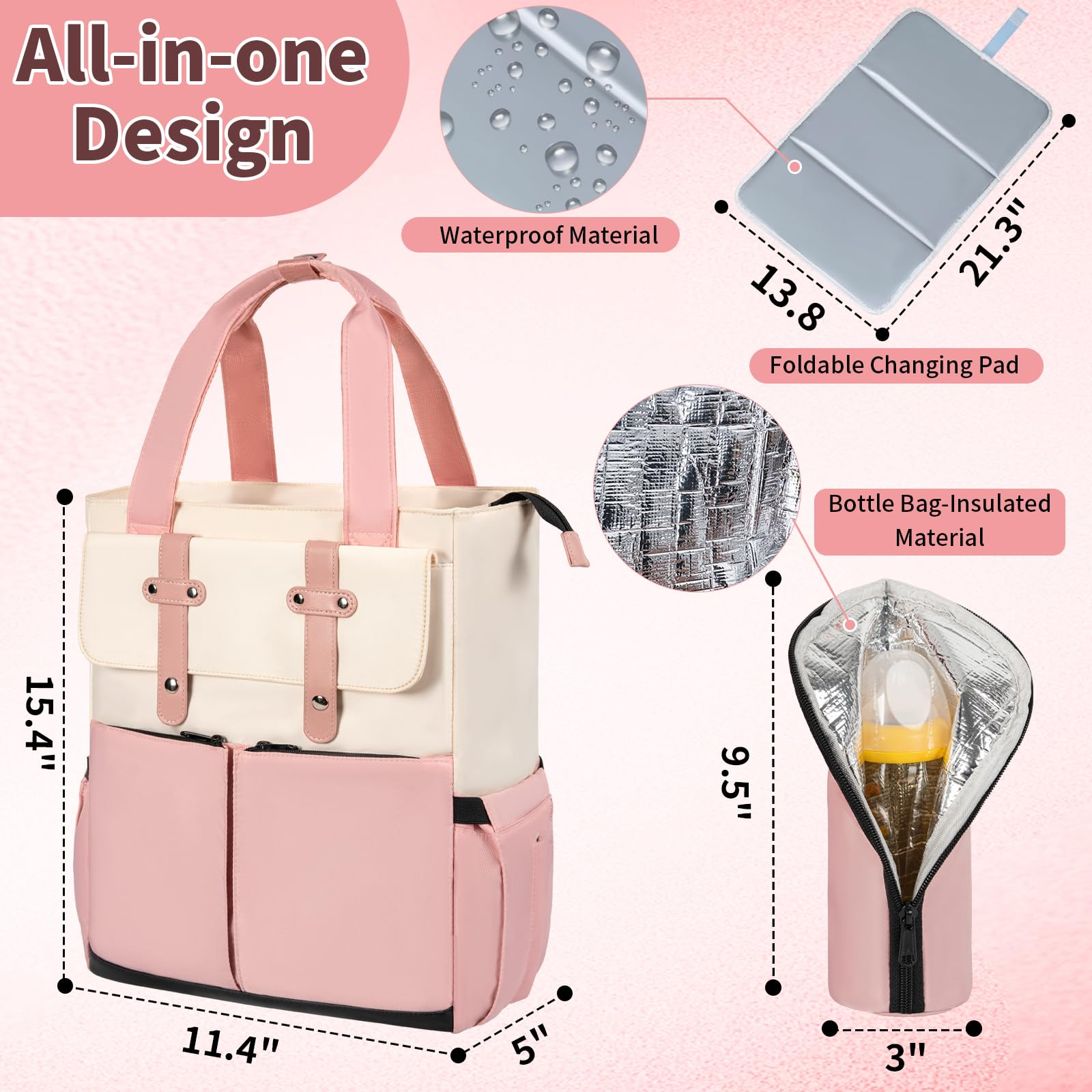 【大容量一体式设计】这款尿布背包尺寸为15"x14.5"x6.5",设有15个储物口袋,配备防水可折叠换尿垫(展开尺寸22"x13")和独立保温奶瓶袋(9.5"x3.5"x3"),轻松收纳宝宝用品与随身物品。